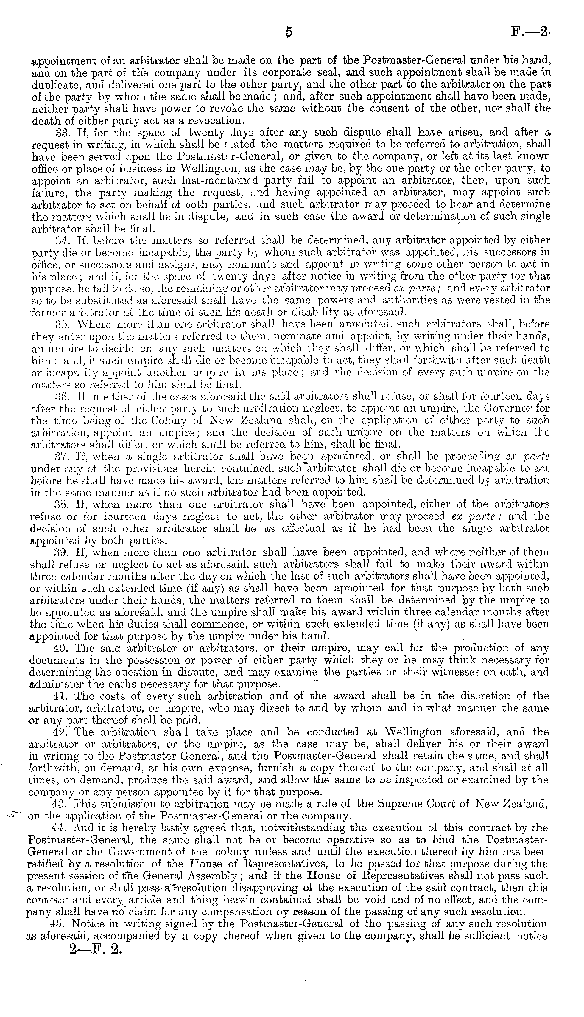 appointment of an arbitrator shall be made on the part of the Postmaster-General under his hand, and on the part of the company under its corporate seal, and such appointment shall be made in duplicate, and delivered one part to the other party, and the other part to the arbitrator on the part of the party by whom the same shall be made ; and, after such appointment shall have been made, neither party shall have power to revoke the same without the consent of the other, nor shall the death of either party act as a revocation. 33. If, for the space of twenty days after any such dispute shall have arisen, and after a request in writing, in which shall be stated the matters required to be referred to arbitration, shall have been served upon the Postmasti r-General, or given to the company, or left at its last known office or place of business in Wellington, as the case may be, by the one party or the other party, to appoint an arbitrator, such last-mentioned party fail to appoint an arbitrator, then, upon such failure, the party making the request, and having appointed an arbitrator, may appoint such arbitrator to act on behalf of both parties, and such arbitrator may proceed to hear and determine the matters which shall be in dispute, and in such case the award or determination of such single arbitrator shall be final. 34. If, before the matters so referred shall be determined, any arbitrator appointed by either party die or become incapable, the party by whom such arbitrator was appointed, his successors in office, or successors and assigns, may nominate and appoint in writing some other person to act in his place; and if, for the space of twenty days after notice in writing from the other party for that purpose, he fail to do so, the remaining or other arbitrator may proceed ex parte ; and every arbitrator so to be substituted as aforesaid shall have the same powers and authorities as were vested in the former arbitrator at the time of such his death or disability as aforesaid. 35. Where more than one arbitrator shall have been appointed, such arbitrators shall, before they enter upon the matters referred to them, nominate and appoint, by writing under their hands, an umpire to decide on any such matters on which they shall differ, or which shall be referred to him ; and, if such umpire shall die or become incapable to act, they shall forthwith after such death or incapacity appoint another umpire in his place; and the decision of every such umpire on the matters so referred to him shall be final. 36. If in either of the cases aforesaid the said arbitrators shall refuse, or shall for fourteen days after the request of either party to such arbitration neglect, to appoint an umpire, the Governor for the time being of the Colony of New Zealand shall, on the application of either party to such arbitration, appoint an umpire; and the decision of such umpire on the matters on which the arbitrators shall differ, or which shall be referred to him, shall be final. 37. If, when a single arbitrator shall have been appointed, or shall be proceeding ex parte under any of the provisions herein contained, such 'arbitrator shall die or become incapable to act before he shall have made his award, the matters referred to him shall be determined by arbitration in the same manner as if no such arbitrator had been appointed. 38. If, when more than one arbitrator shall have been appointed, either of the arbitrators refuse or for fourteen days neglect to act, the other arbitrator may proceed ex parte; and the decision of such other arbitrator shall be as effectual as if he had been the single arbitrator appointed by both parties. 39. If, when more than one arbitrator shall have been appointed, and where neither of them shall refuse or neglect to act as aforesaid, such arbitrators shall fail to make their award within three calendar months after the day on which the last of such arbitrators shall have been appointed, or within such extended time (if any) as shall have been appointed for that purpose by both such arbitrators under their hands, the matters referred to them shall be determined by the umpire to be appointed as aforesaid, and the umpire shall make his award within three calendar months after the time when his duties shall commence, or within such extended time (if any) as shall have been appointed for that purpose by the umpire under his hand. 40. The said arbitrator or arbitrators, or their umpire, may call for the production of any documents in the possession or power of either party which they or he may think necessary for determining the question in dispute, and may examine the parties or their witnesses on oath, and administer the oaths necessary for that purpose. 41. The costs of every such arbitration and of the award shall be in the discretion of the arbitrator, arbitrators, or umpire, who may direct to and by whom and in what manner the same or any part thereof shall be paid. 42. The arbitration shall take place and be conducted at Wellington aforesaid, and the arbitrator or arbitrators, or the umpire, as the case may be, shall deliver his or their award in writing to the Postmaster-General, and the Postmaster-General shall retain the same, and shall forthwith, on demand, at his own expense, furnish a copy thereof to the company, and shall at all times, on demand, produce the said award, and allow the same to be inspected or examined by the company or any person appointed by it for that purpose. 43. This submission to arbitration may be made a rule of the Supreme Court of New Zealand, on the application of the Postmaster-General or the company. 44. And it is hereby lastly agreed that, notwithstanding the execution of this contract by the Postmaster-General, the same shall not be or become operative so as to bind the PostmasterGeneral or the Government of the colony unless and until the execution thereof by him has been ratified by a resolution of the House of Bepresentatives, to be passed f