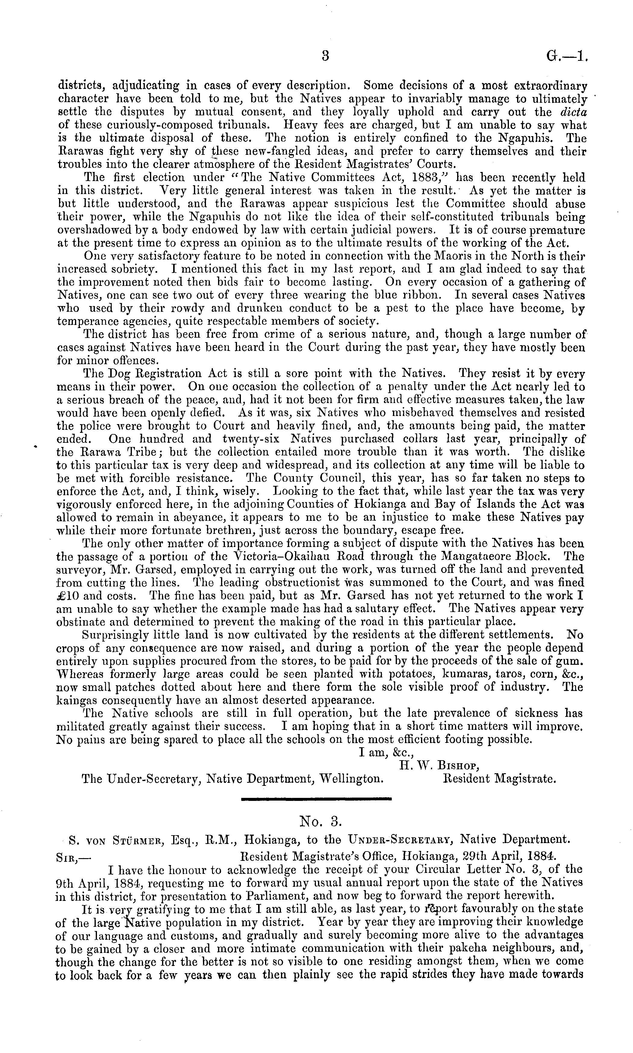 No. 3. S. yon St-jrmer, Esq., R.M., Hokianga, to the Under-Secretary, Native Department. Sir, — Resident Magistrate's Office, Hokianga, 29th April, 1884. I have the honour to acknowledge the receipt of your Circular Letter No. 3, of the 9th April, 1884, requesting me to forward my usual annual report upon the state of the Natives in this district, for presentation to Parliament, and now beg to forward the report herewith. It is very gratifying to me that I am still able, as last year, to feport favourably on the state of the large Native population in my district. Year by year they are improving their knowledge of our language and customs, and gradually and surely becoming more alive to the advantages to be gained by a closer and more intimate communication with their pakeha neighbours, and, though the change for the better is not so visible to one residing amongst them, when we come to look back for a few years we can then plainly see the rapid strides they have made towards