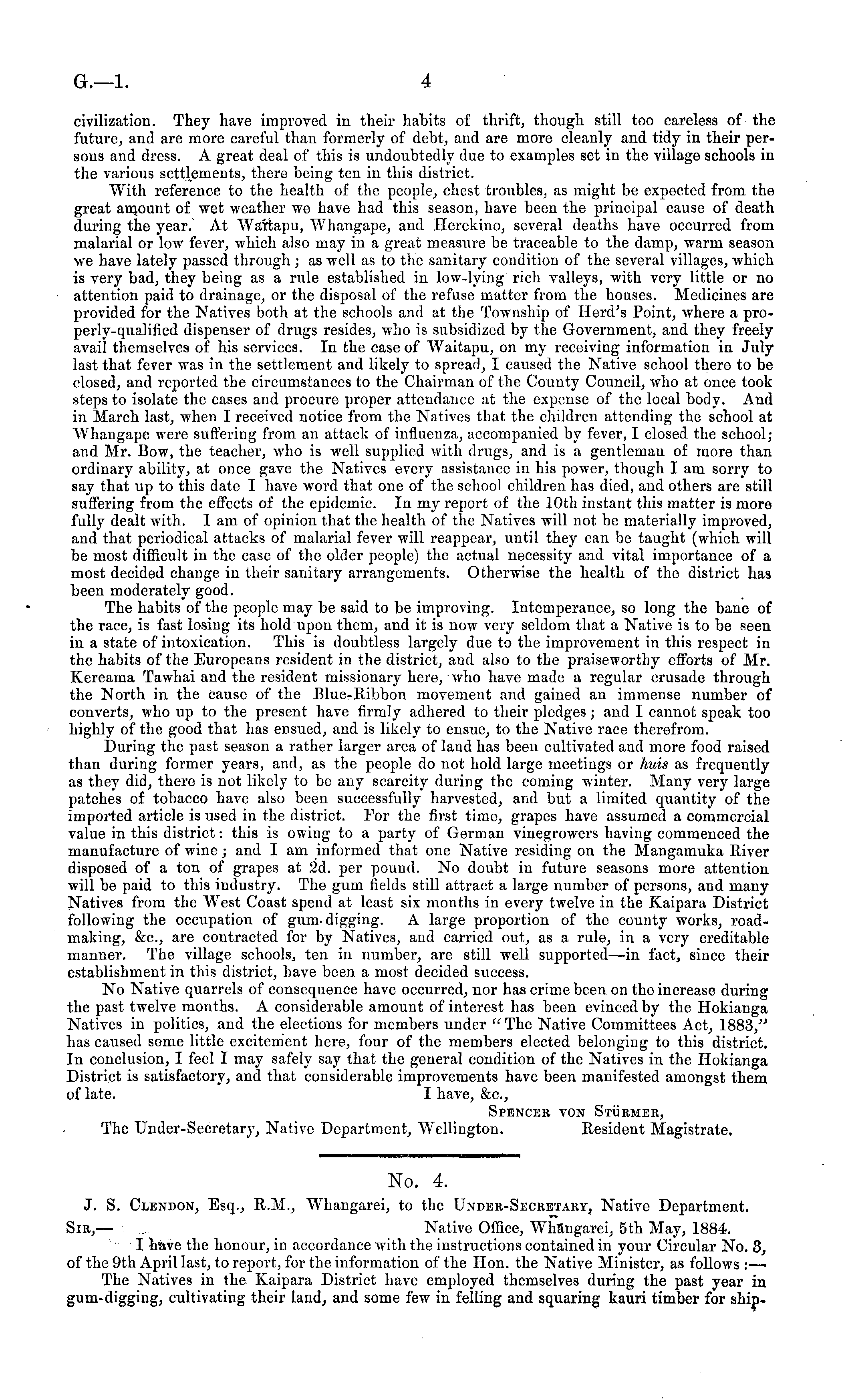 No. 4. J. S. Clendon, Esq., R.M., Whangarei, to the Under-Secretary, Native Department. Sir, — Native Office, Whangarei, sth May, 1884. I have the honour, in accordance with the instructions contained in your Circular No. 3, of the 9th April last, to report, for the information of the Hon. the Native Minister, as follows : — The Natives in the Kaipara District have employed themselves during the past year in gum-digging, cultivating their land, and some few in felling and squaring kauri timber for ship-