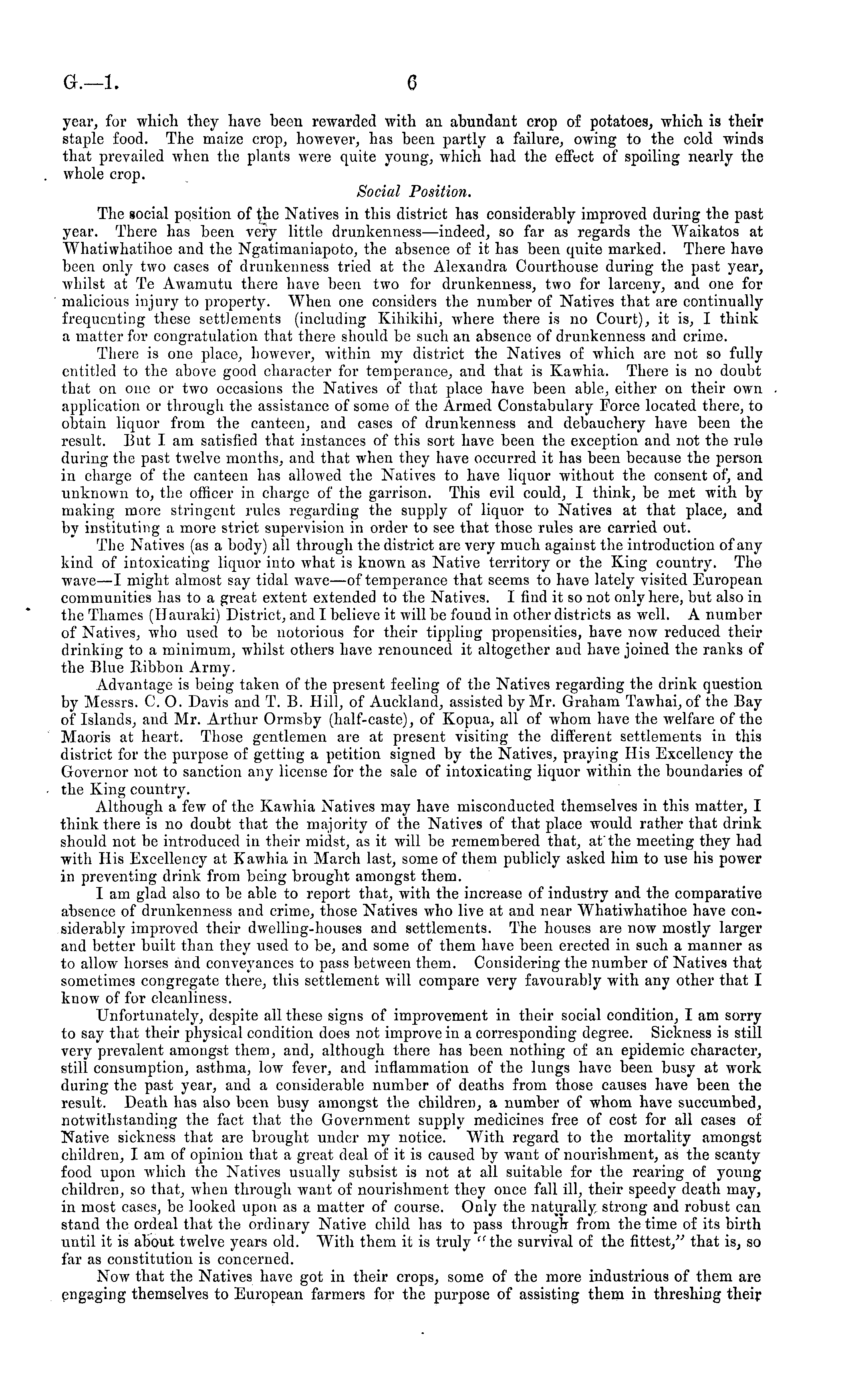 year, for which they have been rewarded with an abundant crop of potatoes, which is their staple food. The maize crop, however, has been partly a failure, owing to the cold winds that prevailed when the plants were quite young, which had the effect of spoiling nearly the whole crop. Social Position. The social position of the Natives in this district has considerably improved during the past year. There has been very little drunkenness—indeed, so far as regards the Waikatos at Whatiwhatihoe and the Ngatimaniapoto, the absence of it has been quite marked. There have been only two cases of drunkenness tried at the Alexandra Courthouse during the past year, whilst at Te Awamutu there have been two for drunkenness, two for larceny, and one for malicious injury to property. When one considers the number of Natives that are continually frequenting these settlements (including Kihikihi, where there is no Court), it is, I think a matter for congratulation that there should be such an absence of drunkenness and crime. There is one place, however, within my district the Natives of which are not so fully entitled to the above good character for temperance, and that is Kawhia. There is no doubt that on one or two occasions the Natives of that place have been able, either on their own application or through the assistance of some of the Armed Constabulary Force located there, to obtain liquor from the canteen, and cases of drunkenness and debauchery have been the result. But lam satisfied that instances of this sort have been the exception and not the rule during the past twelve months, and that when they have occurred it has been because the person in charge of the canteen has allowed the Natives to have liquor without the consent of, and unknown to, the officer in charge of the garrison. This evil could, I think, be met with by making more stringent rules regarding the supply of liquor to Natives at that place, and by instituting a more strict supervision in order to see that those rules are carried out. The Natives (as a body) all through the district are very much against the introduction of any kind of intoxicating liquor into what is known as Native territory or the King country. The wave—l might almost say tidal wave—of temperance that seems to have lately visited European communities has to a great extent extended to the Natives. I find it so not only here, but also in the Thames (Hauraki) District, and I believe it will be fouud in other districts as well. A number of Natives, who used to be notorious for their tippling propensities, have now reduced their drinking to a minimum, whilst others have renounced it altogether and have joined the ranks of the Blue Ribbon Army. Advantage is being taken of the present feeling of the Natives regarding the drink question by Messrs. C. O. Davis and T. B. Hill, of Auckland, assisted by Mr. Graham Tawhai, of the Bay of Islands, and Mr. Arthur Ormsby (half-caste), of Kopua, all of whom have the welfare of the Maoris at heart. Those gentlemen are at present visiting the different settlements in this district for the purpose of getting a petition signed by the Natives, praying His Excellency the Governor not to sanction any license for the sale of intoxicating liquor within the boundaries of the King country. Although a few of the Kawhia Natives may have misconducted themselves in this matter, I think there is no doubt that the majority of the Natives of that place would rather that drink should not be introduced in their midst, as it will be remembered that, at'the meeting they had with His Excellency at Kawhia in March last, some of them publicly asked him to use his power in preventing drink from being brought amongst them. I am glad also to be able to report that, with the increase of industry and the comparative absence of drunkenness and crime, those Natives who live at and near Whatiwhatihoe have considerably improved their dwelling-houses and settlements. The houses are now mostly larger and better built than they used to be, and some of them have been erected in such a manner as to allow horses and conveyances to pass between them. Considering the number of Natives that sometimes congregate there, this settlement will compare very favourably with any other that I know of for cleanliness. Unfortunately, despite all these signs of improvement in their social condition, I am sorry to say that their physical condition does not improve in a corresponding degree. Sickness is still very prevalent amongst them, and, although there has been nothing of an epidemic character, still consumption, asthma, low fever, and inflammation of the lungs have been busy at work during the past year, and a considerable number of deaths from those causes have been the result. Death has also been busy amongst the children, a number of whom have succumbed, notwithstanding the fact that the Government supply medicines free of cost for all cases of Native sickness that are brought under my notice. With regard to the mortality amongst children, I am of opinion that a great deal of it is caused by want of nourishment, as the scanty food upon which the Natives usually subsist is not at all suitable for the rearing of young children, so that, when through want of nourishment they once fall ill, their speedy death may, in most cases, be looked upon as a matter of course. Only the naturally strong and robust can stand the ordeal that the ordinary Native child has to pass through from the time of its birth until it is about twelve years old. With them it is truly "the survival of the fittest," that is, so far as constitution is concerned. Now that the Natives have got in their crops, some of the more industrious of them are engaging themselves to European farmers for the purpose of assisting them in threshing their