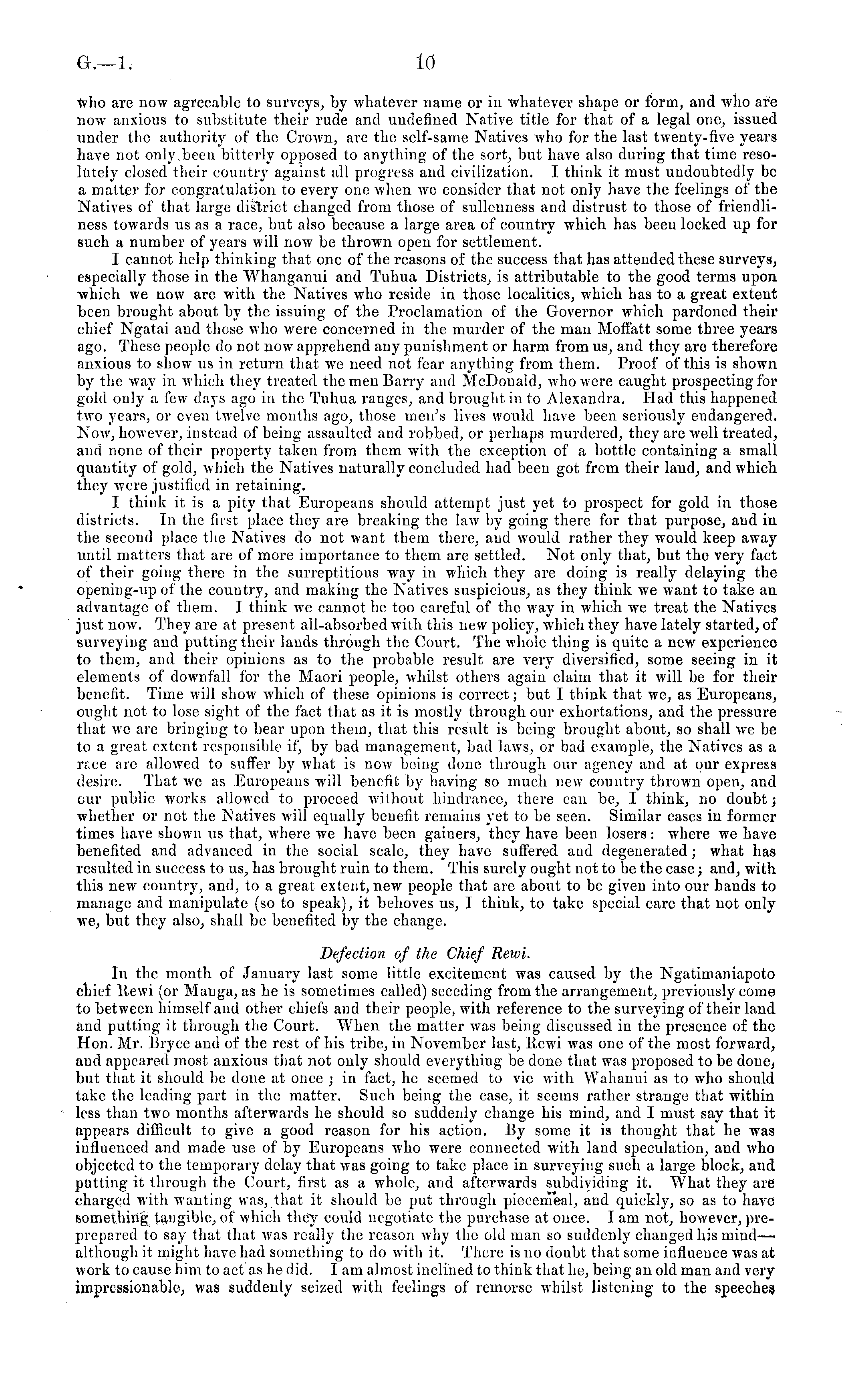 who arc now agreeable to surveys, by whatever name or in whatever shape or form, and who are now anxious to substitute their rude and undefined Native title for that of a legal one, issued under the authority of the Crown, are the self-same Natives who for the last twenty-five years have not only .been bitterly opposed to anything of the sort, but have also during that time resolutely closed their country against all progress and civilization. I think it must undoubtedly be a matter for congratulation to every one when we consider that not only have the feelings of the Natives of that large district changed from those of sullenness and distrust to those of friendliness towards us as a race, but also because a large area of country which has been locked up for such a number of years will now be thrown open for settlement. I cannot help thinking that one of the reasons of the success that has attended these surveys, especially those in the Whanganui and Tuhua Districts, is attributable to the good terms upon which we now are with the Natives who reside in those localities, which has to a great extent been brought about by the issuing of the Proclamation of the Governor which pardoned their chief Ngatai and those who were concerned in the murder of the man Moffatt some three years ago. These people do not now apprehend any punishment or harm from us, and they are therefore anxious to show us in return that we need not fear anything from them. Proof of this is shown by the way in which they treated the men Barry and McDonald, who were caught prospecting for gold only a few clays ago in the Tuhua ranges, and brought in to Alexandra. Had this happened two years, or even twelve months ago, those men's lives would have been seriously endangered. Now, however, instead of being assaulted and robbed, or perhaps murdered, they are well treated, and none of their property taken from them with the exception of a bottle containing a small quantity of gold, which the Natives naturally concluded had been got from their land, and which they were justified in retaining. I think it is a pity that Europeans should attempt just yet to prospect for gold in those districts. In the first place they are breaking the law by going there for that purpose, and in the second place the Natives do not want them there, and would rather they would keep away until matters that are of more importance to them are settled. Not only that, but the very fact of their going there in the surreptitious way in which they are doing is really delaying the opening-up of the country, and making the Natives suspicious, as they think we want to take an advantage of them. I think we cannot be too careful of the way in which we treat the Natives just now. They are at present all-absorbed with this new policy, which they have lately started, of surveying and putting their lands through the Court. The whole thing is quite a new experience to them, and their opinions as to the probable result are very diversified, some seeing in it elements of downfall for the Maori people, whilst others again claim that it will be for their benefit. Time will show which of these opinions is correct; but I think that we, as Europeans, ought not to lose sight of the fact that as it is mostly through our exhortations, and the pressure that we arc bringing to bear upon them, that this result is being brought about, so shall we be to a great extent responsible if, by bad management, bad laws, or bad example, the Natives as a rr.ee are allowed to suffer by what is now being done through our agency and at our express desire. That we as Europeans will benefit by having so much new country thrown open, and our public works allowed to proceed without hindrance, there can be, I think, no doubt; whether or not the .Natives will equally benefit remains yet to be seen. Similar cases in former times have shown us that, where we have been gainers, they have been losers: where we have benefited and advanced in the social scale, they have suffered and degenerated; what has resulted in success to us, has brought ruin to them. This surely ought not to be the case; and, with this new country, and, to a great extent, new people that are about to be given into our hands to manage and manipulate (so to speak), it behoves us, I think, to take special care that not only we, but they also, shall be benefited by the change. Defection of the Chief Rewi. In the month of January last some little excitement was caused by the Ngatimaniapoto chief Rewi (or Manga, as he is sometimes called) seceding from the arrangement, previously como to between himself and other chiefs and their people, with reference to the surveying of their land and putting it through the Court. When the matter was being discussed in the presence of the Hon. Mr. Bryce and of the rest of his tribe, in November last, Rewi was one of the most forward, and appeared most anxious that not only should everything be done that was proposed to be done, but that it should be done at once ; in fact, he seemed to vie with Wahanui as to who should take the leading part in the matter. Such being the case, it seems rather strange that within less than two months afterwards he should so suddenly change his mind, and I must say that it appears difficult to give a good reason for his action. Py some it is thought that he was influenced and made use of by Europeans who were connected with land speculation, and who objected to the temporary delay that was going to take place in surveying such a large block, and putting it through the Court, first as a whole, and afterwards subdividing it. What they are charged with wanting was, that it should be put through piecemeal, and quickly, so as to have something tangible, of which they could negotiate the purchase at once. lam not, however, preprepared to say that that was really the reason why the old man so suddenly changed his mind—although it might have had something to do with it. There is no