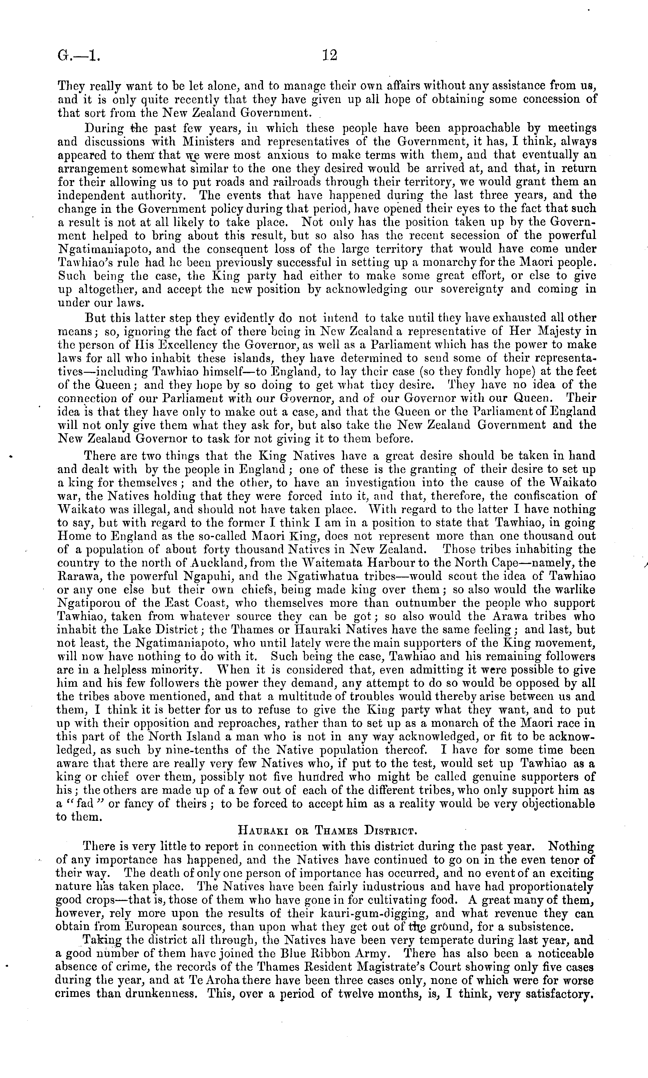 They really want to be let alone, and to manage their own affairs without any assistance from us, and it is only quite recently that they have given up all hope of obtaining some concession of that sort from the New Zealand Government. During the past few years, in which these people have been approachable by meetings and discussions with Ministers and rerjresentativcs of the Government, it has, I think, always appeared to them that we were most anxious to make terms with them, and that eventually an arrangement somewhat similar to the one they desired would be arrived at, and that, in return for their allowing us to put roads and railroads through their territory, we would grant them an independent authority. The events that have happened during the last three years, and the change in the Government policy during that period, have opened their eyes to the fact that such a result is not at all likely to take place. Not only has the position taken up by the Government helped to bring about this result, but so also has the recent secession of the powerful Ngatimaniapoto, and the consequent loss of the large territory that would have come under Tawhiao's rule had he been previously successful in setting up a monarchy for the Maori people. Such being the case, the King party had either to make some great effort, or else to give up altogether, and accept the new position by acknowledging our sovereignty and coming in under our laws. But this latter step they evidently do not intend to take until they have exhausted all other means; so, ignoring the fact of there being in New Zealand a representative of Her Majesty in the person of His Excellency the Governor, as well as a Parliament which has the power to make laws for all who inhabit these islands, they have determined to send some of their representatives —including Tawhiao himself—to England, to lay their case (so they fondly hope) at the feet of the Queen; and they hope by so doing to get what they desire. They have no idea of the connection of our Parliament with our Governor, and of our Governor with our Queen. Their idea is that they have only to make out a case, and that the Queen or the Parliament of England will not only give them what they ask for, but also take the New Zealand Government and the New Zealand Governor to task for not giving it to them before. There are two things that the King Natives have a great desire should be taken in hand and dealt with by the people in England ; one of these is the granting of their desire to set up a king for themselves ; and the other, to have an investigation into the cause of the Waikato war, the Natives holding that they were forced into it, and that, therefore, the confiscation of Waikato was illegal, and should not have taken place. With regard to tho latter I have nothing to say, but with regard to the former I think I am in a position to state that Tawhiao, in going Home to England as the so-called Maori King, does not represent more than one thousand out of a population of about forty thousand Natives in Ncav Zealand. Those tribes inhabiting the country to the north of Auckland, from the Waitemata Harbour to the North Cape—namely, the Rarawa, the powerful Ngapuhi, and the Ngatiwhatua tribes —would scout the idea of Tawhiao or any one else but their own chiefs, being made king over them; so also would the warlike Ngatiporou of the East Coast, who themselves more than outnumber the people who support Tawhiao, taken from whatever source they can be got; so also would the Arawa tribes who inhabit the Lake District; the Thames or Hauraki Natives have the same feeling; and last, but not least, the Ngatimaniapoto, who until lately were the main supporters of the King movement, will now have nothing to do with it. Such being the case, Tawhiao and his remaining followers are in a helpless minority. When it is considered that, even admitting it were possible to give him and his few followers the power they demand, any attempt to do so would be opposed by all the tribes above mentioned, and that a multitude of troubles would thereby arise between us and them, I think it is better for us to refuse to give the King party what they want, and to put up with their opposition and reproaches, rather than to set up as a monarch of the Maori race in this part of the North Island a man who is not in any way acknowledged, or fit to be acknowledged, as such by nine-tenths of the Native population thereof. I have for some time been aware that there are really very few Natives who, if put to the test, would set up Tawhiao as a king or chief over them, possibly not five hundred who might be called genuine supporters of his; the others are made up of a few out of each of the different tribes, who only support him as a "fad " or fancy of theirs ; to be forced to accept him as a reality would be very objectionable to them. Hauraki or Thames District. There is very little to report in connection with this district during the past year. Nothing of any importance has happened, and the Natives have continued to go on in the even tenor of their way. The death of only one person of importance has occurred, and no event of an exciting nature has taken place. The Natives have been fairly industrious and have had proportionately good crops —that is, those of them who have gone in for cultivating food. A great many of them, however, rely more upon the results of their kauri-gum-digging, and what revenue they can obtain from European sources, than upon what they get out of thg ground, for a subsistence. Taking the district all through, the Natives have been very temperate during last year, and a good number of them have joined tho Blue Ribbon Army. There has also been a noticeable absence of crime, the records of the Thames Resident Magistrate's Court showing only five cases during the year, and at TeAroha there have been three cases only, none of which were for worse crimes than drunkenness. This, over a period