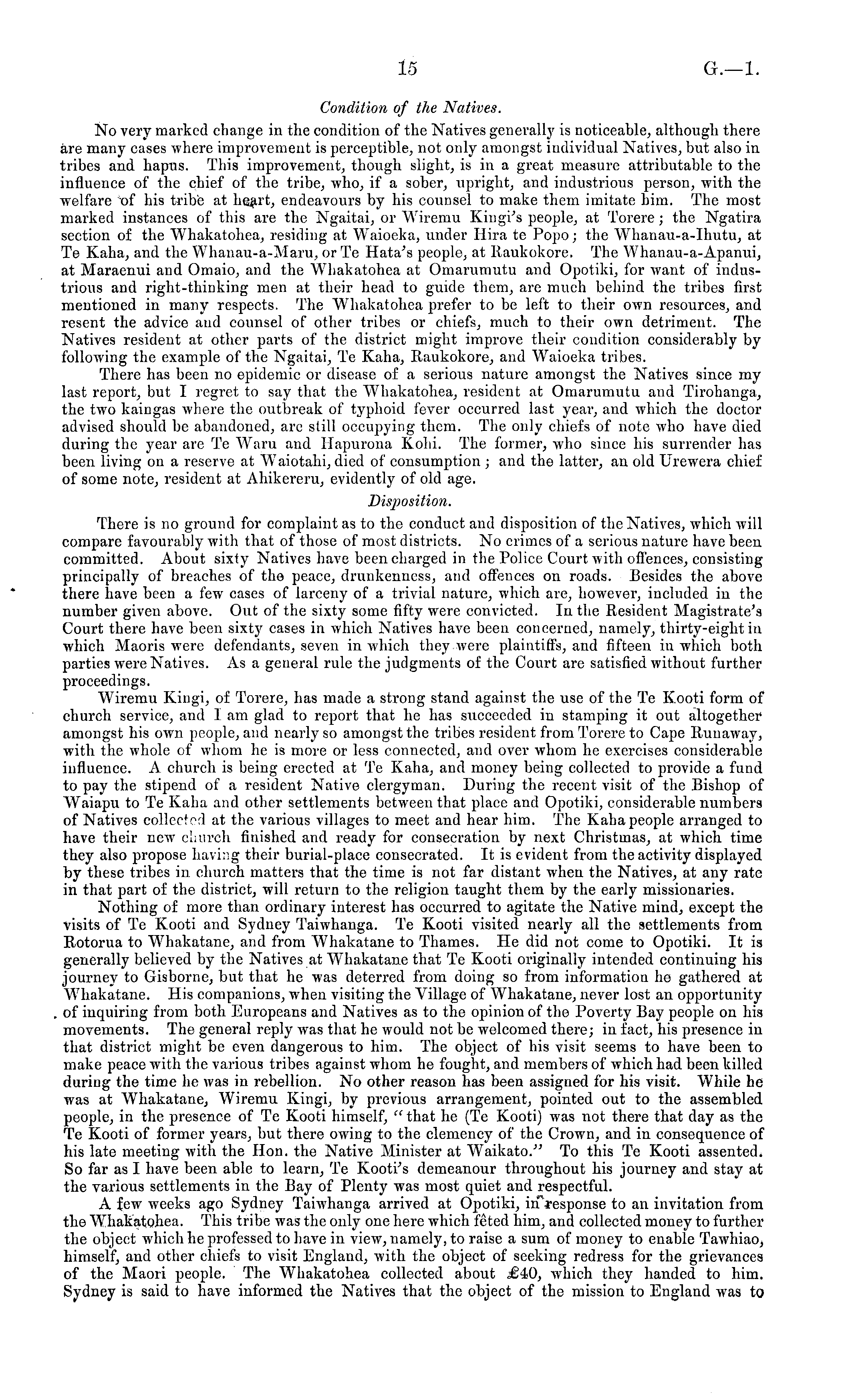 Condition of the Natives. No very marked change in the condition of the Natives generally is noticeable, although there are many cases where improvement is perceptible, not only amongst individual Natives, but also in tribes and hapus. This improvement, though slight, is in a great measure attributable to the influence of the chief of the tribe, who, if a sober, upright, and industrious person, with the welfare of his tribe at heart, endeavours by his counsel to make them imitate him. The most marked instances of this are the Ngaitai, or Wiremu Kingi's people, at Torere; the Ngatira section of the Whakatohea, residing at Waioeka, under Hira te Popo; the Whanau-a-Ihutu, at Te Kaha, and the Whanau-a-Maru, or Te Hata's people, at Raukokore. The Whanau-a-Apanui, at Maraenui and Omaio, and the Whakatohea at Omarumutu and Opotiki, for want of industrious and right-thinking men at their head to guide them, are much behind the tribes first mentioned in many respects. The Whakatohea prefer to be left to their own resources, and resent the advice and counsel of other tribes or chiefs, much to their own detriment. The Natives resident at other parts of the district might improve their condition considerably by following the example of the Ngaitai, Te Kaha, Raukokore, and Waioeka tribes. There has been no epidemic or disease of a serious nature amongst the Natives since my last report, but I regret to say that the Whakatohea, resident at Omarumutu and Tirohanga, the two kaingas where the outbreak of typhoid fever occurred last year, and which the doctor advised should be abandoned, are still occupying them. The only chiefs of note who have died during the year are Te Waru and Ilapurona Kohi. The former, who since his surrender has been living on a reserve at Waiotahi, died of consumption ; and the latter, an old Urewera chief of some note, resident at Ahikereru, evidently of old age. Disposition. There is no ground for complaint as to the conduct and disposition of the Natives, which will compare favourably with that of those of most districts. No crimes of a serious nature have been committed. About sixty Natives have been charged in the Police Court with offences, consisting principally of breaches of the peace, drunkenness, and offences on roads. Besides the above there have been a few cases of larceny of a trivial nature, which are, however, included in the number given above. Out of the sixty some fifty were convicted. In the Resident Magistrate's Court there have been sixty cases in which Natives have been concerned, namely, thirty-eight in which Maoris were defendants, seven in which they were plaintiffs, and fifteen in which both parties were Natives. As a general rule the judgments of the Court are satisfied without further proceedings. Wiremu Kingi, of Torere, has made a strong stand against the use of the Te Kooti form of church service, and I am glad to report that he has succeeded in stamping it out altogether amongst his own people, and nearly so amongst the tribes resident from Torere to Cape Runaway, with the whole of whom he is more or less connected, and over whom he exercises considerable influence. A church is being erected at Te Kaha, and money being collected to provide a fund to pay the stipend of a resident Native clergyman. During the recent visit of the Bishop of Waiapu to Te Kaha and other settlements between that place and Opotiki, considerable numbers of Natives collected at the various villages to meet and hear him. The Kaha people arranged to have their new church finished and ready for consecration by next Christmas, at which time they also propose having their burial-place consecrated. It is evident from the activity displayed by these tribes in church matters that the time is not far distant when the Natives, at any rate in that part of the district, will return to the religion taught them by the early missionaries. Nothing of more than ordinary interest has occurred to agitate the Native mind, except the visits of Te Kooti and Sydney Taiwhanga. Te Kooti visited nearly all the settlements from Rotorua to Whakatane, and from Whakatane to Thames. He did not come to Opotiki. It is generally believed by the Natives at Whakatane that Te Kooti originally intended continuing his journey to Gisborne, but that he was deterred from doing so from information he gathered at Whakatane. His companions, when visiting the Village of Whakatane, never lost an opportunity .of inquiring from both Europeans and Natives as to the opinion of the Poverty Bay people on his movements. The general reply was that he would not be welcomed there; in fact, his presence in that district might be even dangerous to him. The object of his visit seems to have been to make peace with the various tribes against whom he fought, and members of which had been killed during the time he was in rebellion. No other reason has been assigned for his visit. While he was at Whakatane, Wiremu Kingi, by previous arrangement, pointed out to the assembled people, in the presence of Te Kooti himself, " that he (Te Kooti) was not there that day as the Te Kooti of former years, but there owing to the clemency of the Crown, and in consequence of his late meeting with the Hon. the Native Minister at Waikato."''' To this Te Kooti assented. So far as I have been able to learn, Te Kooti's demeanour throughout his journey and stay at the various settlements in the Bay of Plenty was most quiet and respectful. A few weeks ago Sydney Taiwhanga arrived at Opotiki, in response to an invitation from the Whakatohea. This tribe was the only one here which feted him, and collected money to further the object which he professed to have in view, namely, to raise a sum of money to enable Tawhiao, himself, and other chiefs to visit England, with the object of seeking redress for the grievances of the Maori people. The Whakatohea collected about £40, which they handed to him. Sydney is said to have informed the Natives that the object of t