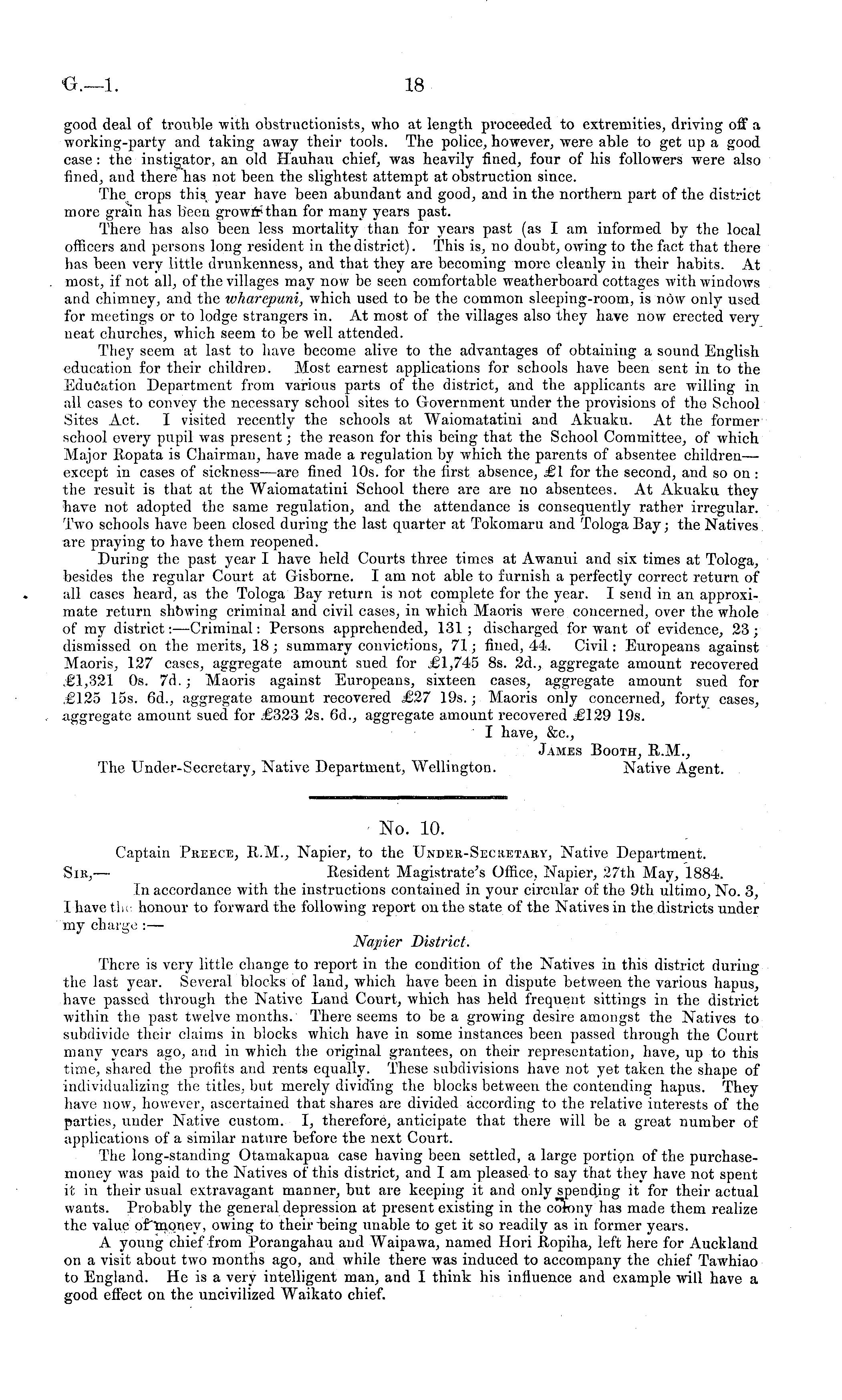 No. 10. Captain Preece, R.M., Napier, to the Under-Secretary, Native Department. Sir, — Resident Magistrate's Office, Napier, 27th May, 1884. In accordance with the instructions contained in your circular of the 9th ultimo, No. 3, I have the honour to forward the following report on the state of the Natives in the districts under my charge : — Napier District. There is very little change to report in the condition of the Natives in this district during the last year. Several blocks of land, which have been in dispute between the various hapus, have passed through the Native Land Court, which has held frequent sittings in the district within the past twelve months. There seems to be a growing desire amongst the Natives to subdivide their claims in blocks which have in some instances been passed through the Court many years ago, and in which the original grantees, on their representation, have, up to this time, shared the profits aud rents equally. These subdivisions have not yet taken the shape of individualizing the titles, but merely dividing the blocks between the contending hapus. They have now, however, ascertained that shares are divided according to the relative interests of the parties, under Native custom. I, therefore, anticipate that there will be a great number of applications of a similar nature before the next Court. The long-standing Otamakapua case having been settled, a large portion of the purchasemoney was paid to the Natives of this district, and I am pleased to say that they have not spent it in their usual extravagant manner, but are keeping it and only spending it for their actual wants. Probably the general depression at present existing in the colony has made them realize the value of money, owing to their being unable to get it so readily as in former years. A young chief from Porangahau and Waipawa, named Hori Ropiha, left here for Auckland on a visit about two months ago, and while there was induced to accompany the chief Tawhiao to England. He is a very intelligent man, and I think his influence and example will have a good effect on the uncivilized Waikato chief.