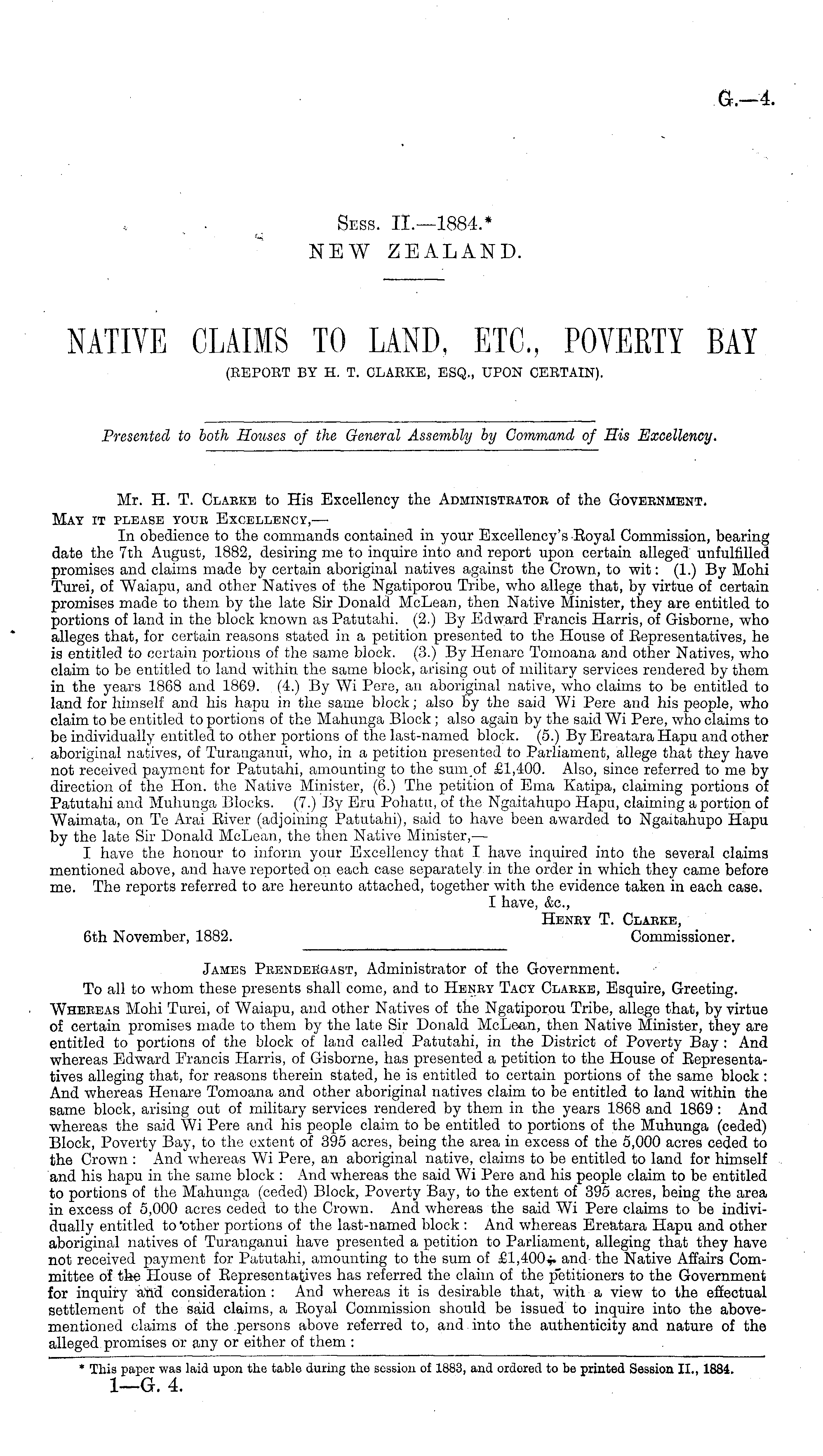James Prendergast, Administrator of the Government. To all to whom these presents shall come, and to Henry Tacy Clarke, Esquire, Greeting. Whereas Mohi Turei, of Waiapu, and other Natives of the Ngatiporou Tribe, allege that, by virtue of certain promises made to them by the late Sir Donald McLean, then Native Minister, they are entitled to portions of the block of land called Patutahi, in the District of Poverty Bay : And whereas Edward Francis Harris, of Gisborne, has presented a petition to the House of Kepresentatives alleging that, for reasons therein stated, he is entitled to certain portions of the same block : And whereas Henare Tomoana and other aboriginal natives claim to be entitled to land within the same block, arising out of military services rendered by them in the years 1868 and 1869 : And whereas the said Wi Pere and his people claim to be entitled to portions of the Muhunga (ceded) Block, Poverty Bay, to the extent of 395 acres, being the area in excess of the 5,000 acres ceded to the Crown : And whereas Wi Pere, an aboriginal native, claims to be entitled to land for himself and his hapu in the same block : And whereas the said Wi Pere and his people claim to be entitled to portions of the Mahunga (ceded) Block, Poverty Bay, to the extent of 395 acres, being the area in excess of 5,000 acres ceded to the Crown. And whereas the said Wi Pere claims to be individually entitled to 'other portions of the last-named block : And whereas Ereatara Hapu and other aboriginal natives of Turanganui have presented a petition to Parliament, alleging that they have not received payment for Patutahi, amounting to the sum of £1,400.;,. and the Native Affairs Committee of the House of Eepresentatives has referred the claim of the petitioners to the Government for inquiry and consideration : And whereas it is desirable that, with a view to the effectual settlement of the said claims, a Eoyal Commission should be issued to inquire into the abovementioned claims of the .persons above referred to, and into the authenticity and nature of the alleged promises or any or either of them :
