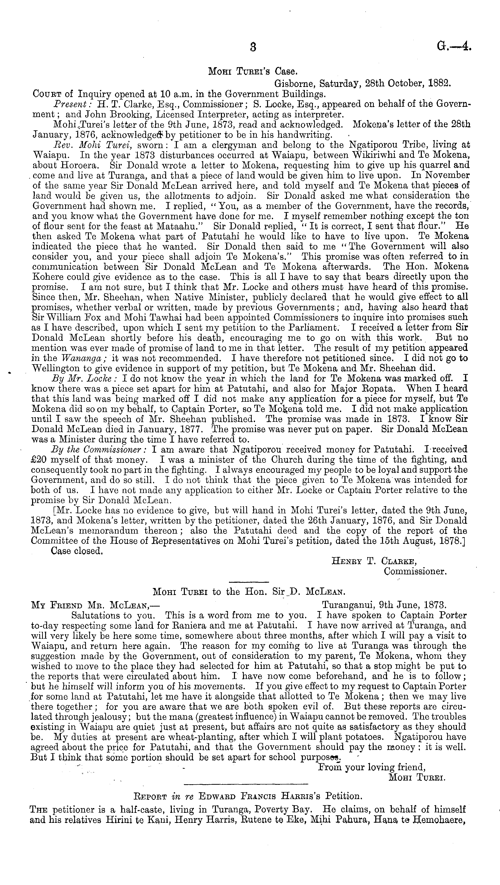 Mohi Turei's Case. Gisborne, Saturday, 28th October, 1882. Court of Inquiry opened at 10 a.m. in the Government Buildings. Present: H. T. Clarke, Esq., Commissioner; S. Locke, Esq., appeared on behalf of the Government ; and John Brooking, Licensed Interpreter, acting as interpreter. Mohi Turei's letter of the 9th June, 1873, read and acknowledged. Mokena's letter of the 28th January, 1876, acknowledged by petitioner to be in his handwriting. Rev. Mohi Turei, sworn: I am a clergyman and belong to the Ngatiporou Tribe, living at Waiapu. In the year 1873 disturbances occurred at Waiapu, between Wikiriwhi and Te Mokena, about Horoera. Sir Donald wrote a letter to Mokena, requesting him to give up his quarrel and come and live at Turanga, and that a piece of land would be given him to live upon. In November of the same year Sir Donald McLean arrived here, and told myself and Te Mokena that pieces of land would be given us, the allotments to adjoin. Sir Donald asked me what consideration the Government had shown me. I replied, "You, as a member of the Government, have the records, and you know what the Government have done for me. I myself remember nothing except the ton of flour sent for the feast at Mataahu." Sir Donald replied, "It is correct, I sent that flour." He then asked Te Mokena what part of Patutahi he would like to have to live upon. Te Mokena indicated the piece that he wanted. Sir Donald then said to me "The Government will also consider you, and your piece shall adjoin Te Mokena's." This promise was often referred to in communication between Sir Donald McLean and Te Mokena afterwards. The Hon. Mokena Kohere could give evidence as to the case. This is all I have to say that bears directly upon the promise. lam not sure, but I think that Mr. Locke and others must have heard of this promise. Since then, Mr. Sheehan, when Native Minister, publicly declared that he would give effect to all promises, whether verbal or written, made by previous Governments; and, having also heard that Sir William Fox and Mohi Tawhai had been appointed Commissioners to inquire into promises such as I have described, upon which I sent my petition to the Parliament. I received a letter from Sir Donald McLean shortly before his death, encouraging me to go on with this w rork. But no mention was ever made of promise of land to me in that letter. The result of my petition appeared in the Wananga ; it was not recommended. I have therefore not petitioned since. I did not go to Wellington to give evidence in support of my petition, but Te Mokena and Mr. Sheehan did. By Mr. Locke : Ido not know the year in which the land for Te Mokena was marked off. I know there was a piece set apart for him at Patutahi, and also for Major Eopata. When I heard that this land was being marked off I did not make any application for a piece for myself, but Te Mokena did so on my behalf, to Captain Porter, so Te Mokena told me. I did not make application until I saw the speech of Mr. Sheehan published. The promise was made in 1873. I know Sir Donald McLean died in January, 1877. The promise was never put on paper. Sir Donald McLean was a Minister during the time I have referred to. By the Commissioner: lam aware that Ngatiporou received money for Patutahi. I received £20 myself of that money. I was a minister of the Church during the time of the fighting, and consequently took no part in the fighting. I always encouraged my people to be loyal and support the Government, and do so still. Ido not think that the piece given to Te Mokena was intended for both of us. I have not made any application to either Mr. Locke or Captain Porter relative to the promise by Sir Donald McLean. [Mr. Locke has no evidence to give, but will hand in Mohi Turei's letter, dated the 9th June, 1873, and Mokena's letter, written by the petitioner, dated the 26th January, 1876, and Sir Donald McLean's memorandum thereon; also the Patutahi deed and the copy of the report of the Committee of the House of Eepfesentatives on Mohi Turei's petition, dated the 15th August, 1878.] Case closed, Henry T. Clarke, Commissioner.