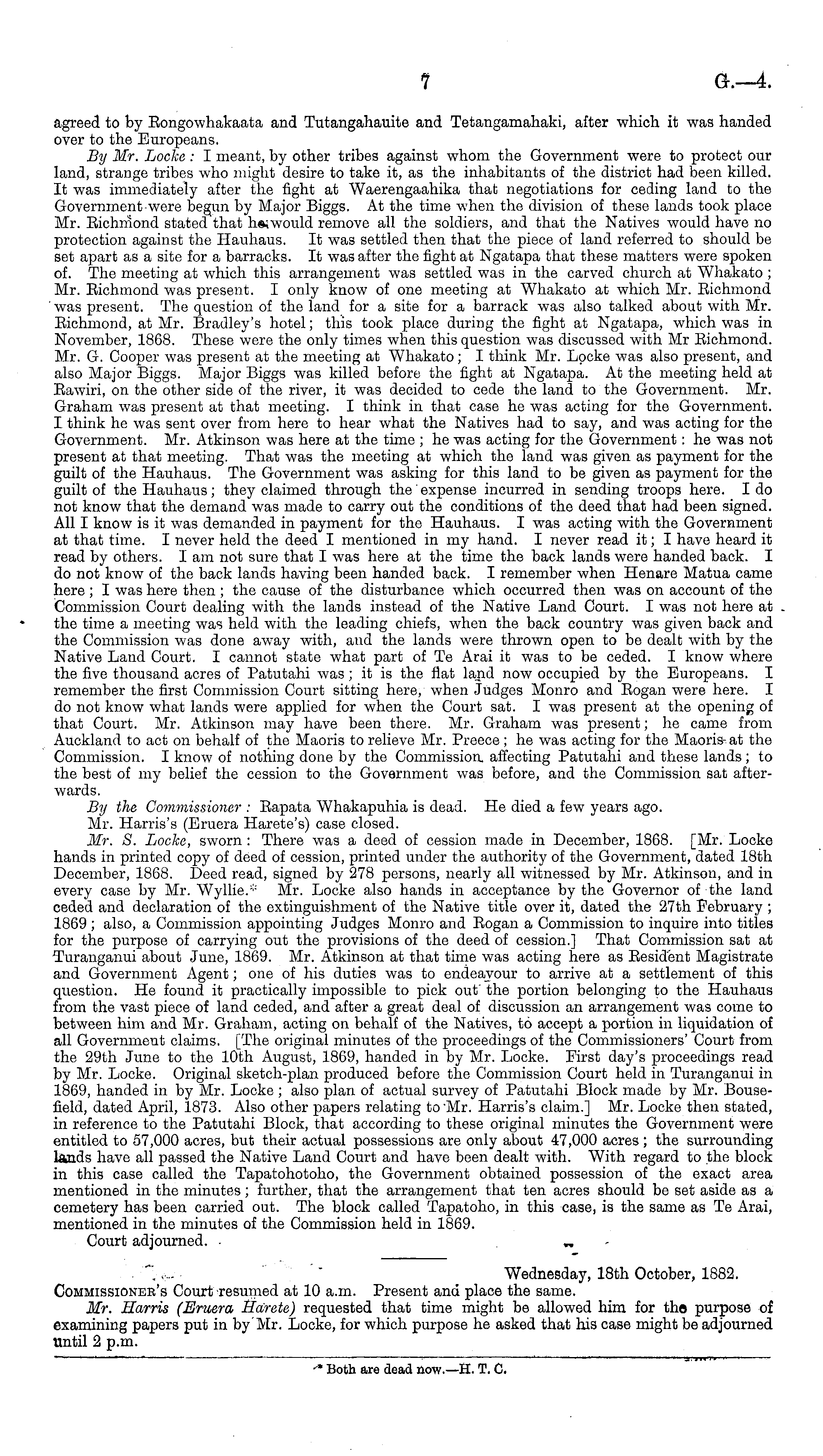 Wednesday, 18th October, 1882. Commissioner's Court resumed at 10 a.m. Present and place the same. Mr. Harris (Eruera Harete) requested that time might be allowed him for the purpose of examining papers put in by Mr. Locke, for which purpose he asked that his case might be adjourned until 2 p.m.