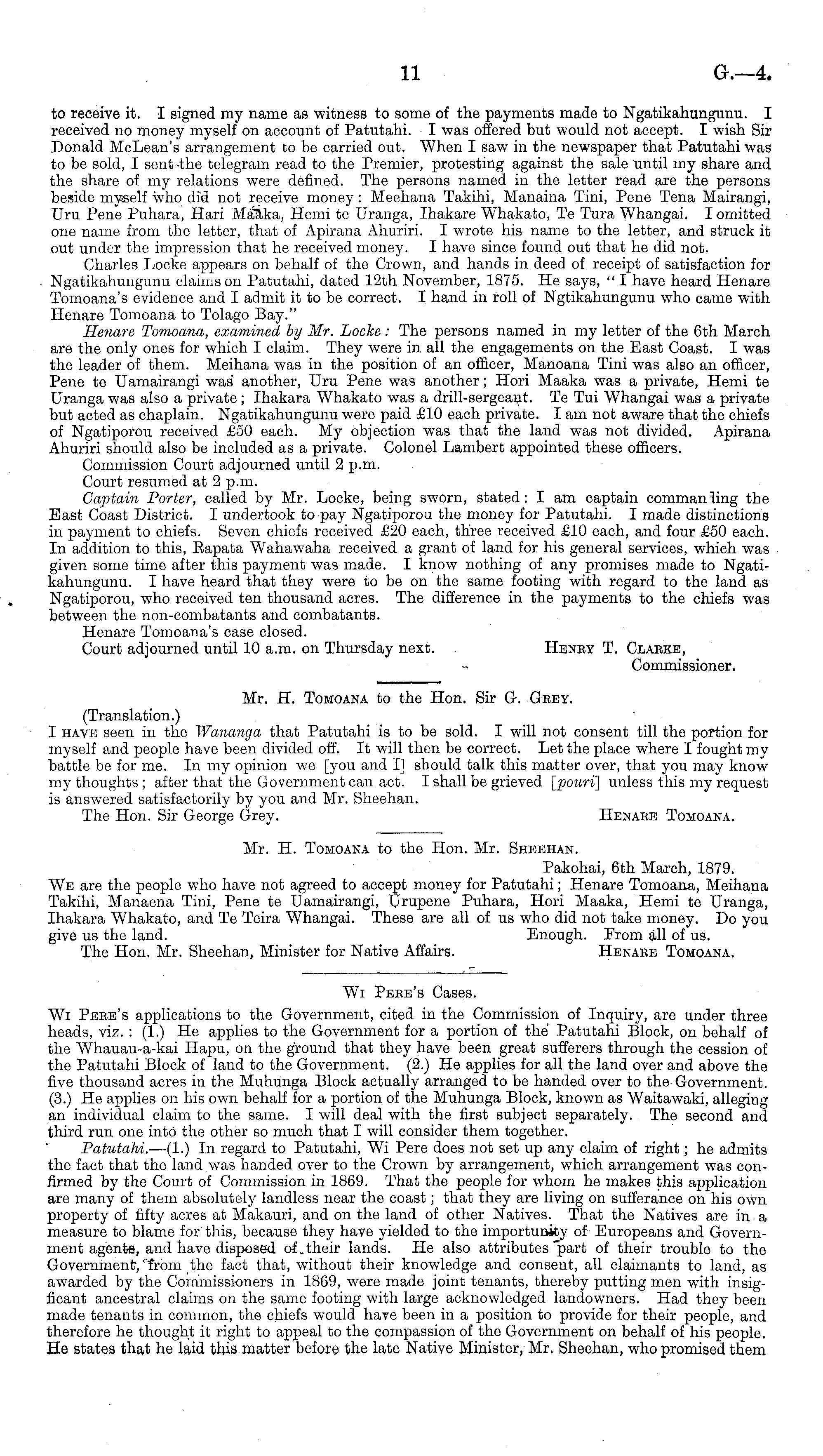 Wi Peee's Cases. Wi Pbre's applications to the Government, cited in the Commission of Inquiry, are under three heads, viz. : (1.) Pie applies to the Government for a portion of the Patutahi Block, on behalf of the Whauau-a-kai Hapu, on the ground that they have been great sufferers through the cession of the Patutahi Block of land to the Government. (2.) He applies for all the land over and above the five thousand acres in the Muhunga Block actually arranged to be handed over to the Government. (3.) He applies on his own behalf for a portion of the Muhunga Block, known as Waitawaki, alleging an individual claim to the same. I will deal with the first subject separately. The second and third run one into the other so much that I will consider them together. Patutahi. —(l.) In regard to Patutahi, Wi Pere does not set up any claim of right; he admits the fact that the land was handed over to the Crown by arrangement, which arrangement was confirmed by the Court of Commission in 1869. That the people for whom he makes this application are many of them absolutely landless near the coast; that they are living on sufferance on his own property of fifty acres at Makauri, and on the land of other Natives. That the Natives are in a measure to blame for'this, because they have yielded to the importunity of Europeans and Government agents, and have disposed of. their lands. He also attributes "part of their trouble to the Government, from the fact that, without their knowledge and consent, all claimants to laud, as awarded by the Commissioners in 1869, were made joint tenants, thereby putting men with insigficant ancestral claims on the same footing with large acknowledged landowners. Had they been made tenants in common, the chiefs would hare been in a position to provide for their people, and therefore he thought it right to appeal to the compassion of the Government on behalf of his people. He states that he laid this matter before the late Native Minister, Mr. Sheehan, who promised them