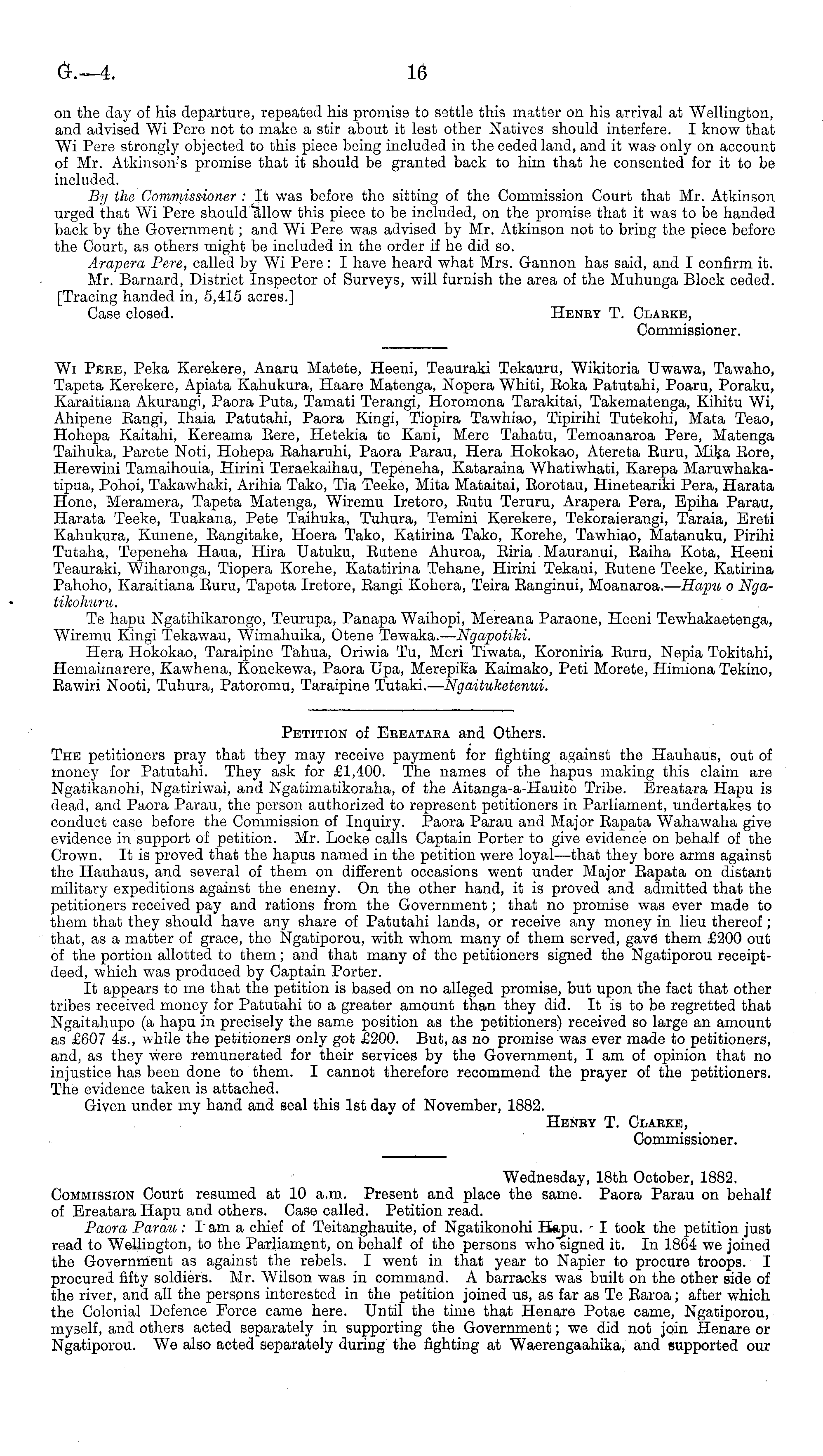 Wednesday, 18th October, 1882. Commission Court resumed at 10 a.m. Present and place the same. Paora Parau on behalf of Ereatara Hapu and others. Case called. Petition read. Paora Parau: lam a chief of Teitanghauite, of Ngatikonohi Hapu. I took the petition just read to Wellington, to the Parliament, on behalf of the persons who signed it. In 1864 we joined the Government as against the rebels. I went in that year to Napier to procure troops. I procured fifty soldiers. Mr. Wilson was in command. A barracks was built on the other side of the river, and all the persons interested in the petition joined us, as far as Te Earoa; after which the Colonial Defence Force came here. Until the time that Henare Potae came, Ngatiporou, myself, and others acted separately in supporting the Government; we did not join Henare or Ngatiporou. We also acted separately during the fighting at Waerengaahika, and supported our