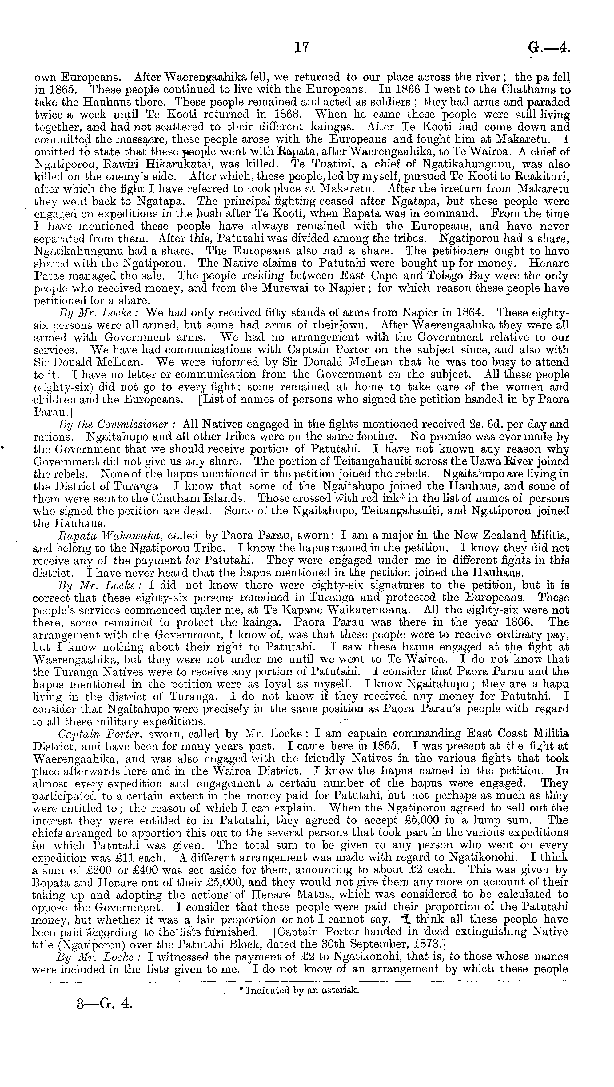 •own Europeans. After Waerengaahika fell, we returned to our place across the river; the pa fell in 1865. These people continued to live with the Europeans. In 1866 I went to the Chathams to take the Hauhaus there. These people remained and acted as soldiers ; they had arms and paraded twice a week until Te Kooti returned in 1868. When he came these people were still living together, and had not scattered to their different kaingas. After Te Kooti had come down and committed the massacre, these people arose with the Europeans and fought him at Makaretu. I omitted to state that these people went with Bapata, after Waerengaahika, to Te Wairoa. A chief of Ngatiporou, Eawiri Hikarukutai, was killed. Te Tuatini, a chief of Ngatikahungunu, was also killed on the enemy's side. After which, these people, led by myself, pursued Te Kooti to Euakituri, after which the fight I have referred to took place at Makarotu. After the irreturn from Makaretu they went back to Ngatapa. The principal fighting ceased after Ngatapa, but these people were engaged on expeditions in the bush after Te Kooti, when Eapata was in command. From the time I have mentioned these people have always remained with the Europeans, and have never separated from them. After this, Patutahi was divided among the tribes. Ngatiporou had a share, Ngatikahungunu had a share. The Europeans also had a share. The petitioners ought to have shared with the Ngatiporou. The Native claims to Patutahi were bought up for money. Henare Patae managed the sale. The people residing between East Cape and Tolago Bay were the only people who received money, and from the Murewai to Napier; for which reason these people have petitioned for a share. By Mr. Locke : We had only received fifty stands of arms from Napier in 1864. These eightysix persons were all armed, but some had arms of their'own. After Waerengaahika they were all armed with Government arms. We had no arrangement with the Government relative to our services. We have had communications with Captain Porter on the subject since, and also with Sir Donald McLean. We were informed by Sir Donald McLean that he was too busy to attend to it. I have no letter or communication from the Government on the subject. All these people (eighty-six) did not go to every fight; some remained at home to take care of the women and children and the Europeans. [List of names of persons who signed the petition handed in by Paora Parau.] By the Commissioner : All Natives engaged in the fights mentioned received 2s. 6d. per day and rations. Ngaitahupo and all other tribes were on the same footing. No promise was ever made by the Government that we should receive portion of Patutahi. I have not known any reason why Government did not give us any share. The portion of Teitangahauiti across the Uawa River joined the rebels. None of the hapus mentioned in the petition joined the rebels. Ngaitahupo are living in the District of Turanga. I know that some of the Ngaitahupo joined the Hauhaus, and some of them were sent to the Chatham Islands. Those crossed with red ink* in the list of names of persons who signed the petition are dead. Some of the Ngaitahupo, Teitangahauiti, and Ngatiporou joined the Hauhaus. Bapata Wahawaha, called by Paora Parau, sworn: I am a major in the New Zealand Militia, and belong to the Ngatiporou Tribe. I know the hapus named in the petition. I know they did not receive any of the payment for Patutahi. They were engaged under me in different fights in this district. I have never heard that the hapus mentioned in the petition joined the Hauhaus. By Mr. Locke : I did not know there were eighty-six signatures to the petition, but it is correct that these eighty-six persons remained in Turanga and protected the Europeans. These people's services commenced under me, at Te Kapane Waikaremoana. All the eighty-six were not there, some remained to protect the kainga. Paora Paraa was there in the year 1866. The arrangement with the Government, I know of, was that these people were to receive ordinary pay, but I know nothing about their right to Patutahi. I saw these hapus engaged at the fight at Waerengaahika, but they were not under me until we went to Te Wairoa. I do not know that the Turanga Natives were to receive any portion of Patutahi. I consider that Paora Parau and the hapus mentioned in the petition were as loyal as myself. I know Ngaitahupo ; they are a hapu living in the district of Turanga. I do not know if they received any money for Patutahi. I consider that Ngaitahupo were precisely in the same position as Paora Parau's people with regard to all these military expeditions. Captain Porter, sworn, called by Mr. Locke : I am captain commanding East Coast Militia District, and have been for many years past. I came here in 1865. I was present at the fi^ht at Waerengaahika, and was also engaged with the friendly Natives in the various fights that took place afterwards here and in the Wairoa District. I know the hapus named in the petition. In almost every expedition and engagement a certain number of the hapus were engaged. They participated to a certain extent in the money paid for Patutahi, but not perhaps as much as they were entitled to; the reason of which I can explain. When the Ngatiporou agreed to sell out the interest they were entitled to in Patutahi, they agreed to accept £5,000 in a lump sum. The chiefs arranged to apportion this out to the several persons that took part in the various expeditions for which Patutahi was given. The total sum to be given to any person who went on every expedition was £11 each. A different arrangement was made with regard to Ngatikonohi. I think a sum of £200 or £400 was set aside for them, amounting to about £2 each. This was given by Eopata and Henare out of their £5,000, and they would not give them any more on account of their taking up and adopting the actions of Henare Matua, which was considered to be calculated to oppose the Government. I 