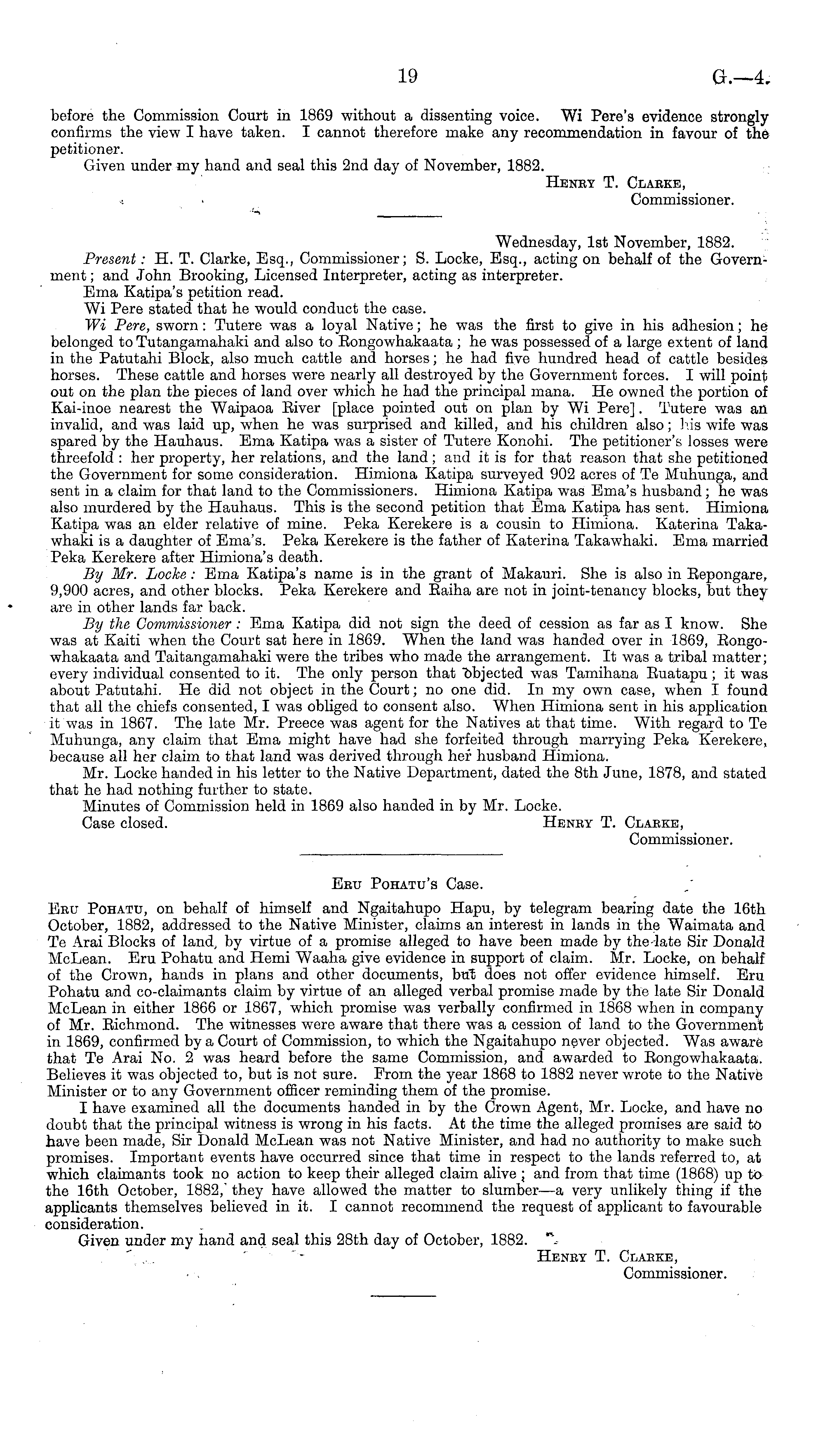 Ecu Pohatu's Case. Ecu Pohatu, on behalf of himself and Ngaitahupo Hapu, by telegram bearing date the 16th October, 1882, addressed to the Native Minister, claims an interest in lands in the Waimata and Te Arai Blocks of land, by virtue of a promise alleged to have been made by the late Sir Donald McLean. Eru Pohatu and Hemi Waaha give evidence in support of claim. Mr. Locke, on behalf of the Crown, hands in plans and other documents, but does not offer evidence himself. Eru Pohatu and co-claimants claim by virtue of an alleged verbal promise made by the late Sir Donald McLean in either 1866 or 1867, which promise was verbally confirmed in 1868 when in company of Mr. Richmond. The witnesses were aware that there was a cession of land to the Government in 1869, confirmed by a Court of Commission, to which the Ngaitahupo never objected. Was aware that Te Arai No. 2 was heard before the same Commission, and awarded to Bongowhakaata. Believes it was objected to, but is not sure. From the year 1868 to 1882 never wrote to the Native Minister or to any Government officer reminding them of the promise. I have examined all the documents handed in by the Crown Agent, Mr. Locke, and have no doubt that the principal witness is wrong in his facts. At the time the alleged promises are said to have been made, Sir Donald McLean was not Native Minister, and had no authority to make such promises. Important events have occurred since that time in respect to the lands referred to, at which claimants took no action to keep their alleged claim alive ; and from that time (1868) up to the 16th October, 1882, they have allowed the matter to slumber—a very unlikely thing if the applicants themselves believed in it. I cannot recommend the request of applicant to favourable consideration. Given under my hand and seal this 28th day of October, 1882. Henby T. Claekb, Commissioner.