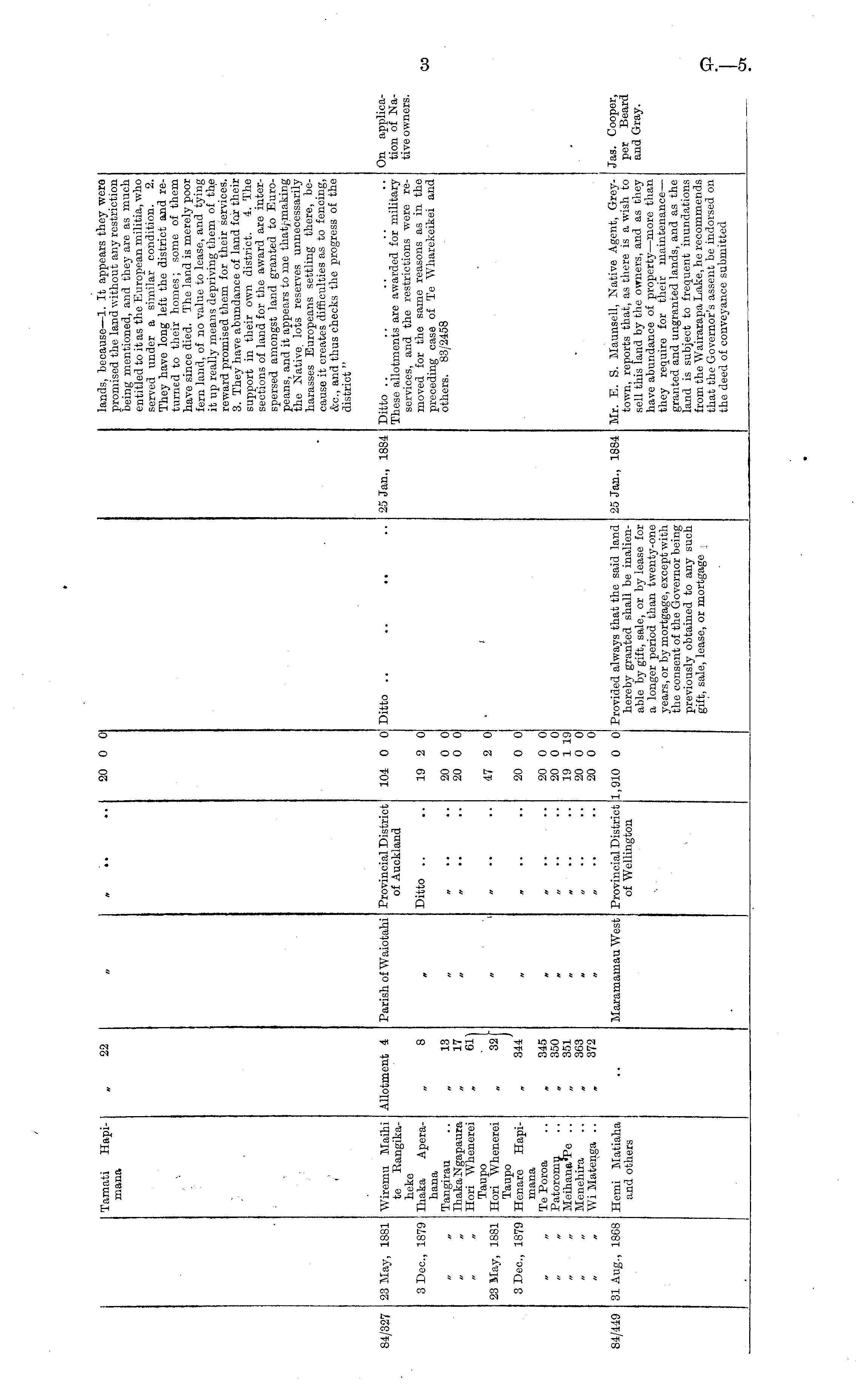 Tamati mana Hapi- . 22 n a •. 20 0 01 lands, because — 1. It appears they were promised the land without any restriction being mentioned, and they are as much entitled to it as the European militia, who served under a similar condition. 2. They have long left the district and returned to their homes; some of them have since died. The land is merely poor fern land, of no value to lease, and tying it up really means depriving them of the reward promised them for their services. 3. They have abundance of land for their support in their own district. 4. The sections of land for the award are interspersed amongst land granted to Europeans, and it appears to me that, making the Native, lots reserves unnecessarily harasses Europeans settling there, because it creates difficulties as to fencing, &c, and thus checks the progress of the district " 84/327 23 May, 1881 Wiremu Maihi te Bangikaheke Ihaka Aperahana Tangirau Ihaka Ngapaura Hori Whencrei Taupo Hori Whenerei Taupo Henare Hapimana Te Poroa Patoromu Meihana'Pe .. Menehira Wi Matenga .. Allotment 4 Parish of Waiotahi Provincial District of Auckland 104 0 0 Ditto .. 25 Jan., 1884 Ditto .. These allotments are awarded for military services, and the restrictions were removed for the same reasons as in the preceding case of Te Wharekeikei and others. 83/2458 On application of Native owners. 3 Dec, 1879 8 a Ditto 19 2 0 13 17 32 r 344 20 0 0 20 0 0 47 2 0 » 23 May, 1881 3 Dec, 1879 20 0 0 345 350 351 363 372 ' 20 0 0 20 0 0 19 1 19 20 0 0 20 0 0 Provided always that the said land hereby granted shall be inalienable by gift, sale, or by lease for a longer period than twenty-one years, or by mortgage, except with the consent of the Governor being previously obtained to any such gift, sale, lease, or mortgage 84/449 31 Aug., 1868 Hemi Matiaha and others Maramamau West Provincial District of Wellington 1,910 0 0 25 Jan., 1884 Mr. E. S. Maunsell, Native Agent, Greytown, reports that, as there is a wish to sell this land by the owners, and as they have abundance of property —more than they require for their maintenance — granted and ungranted lands, and as the land is subject to frequent inundations from the Wairarapa Lake, he recommends that the Governor's assent be indorsed on the deed of conveyance submitted Jas. Cooper, per Beard and Gray.