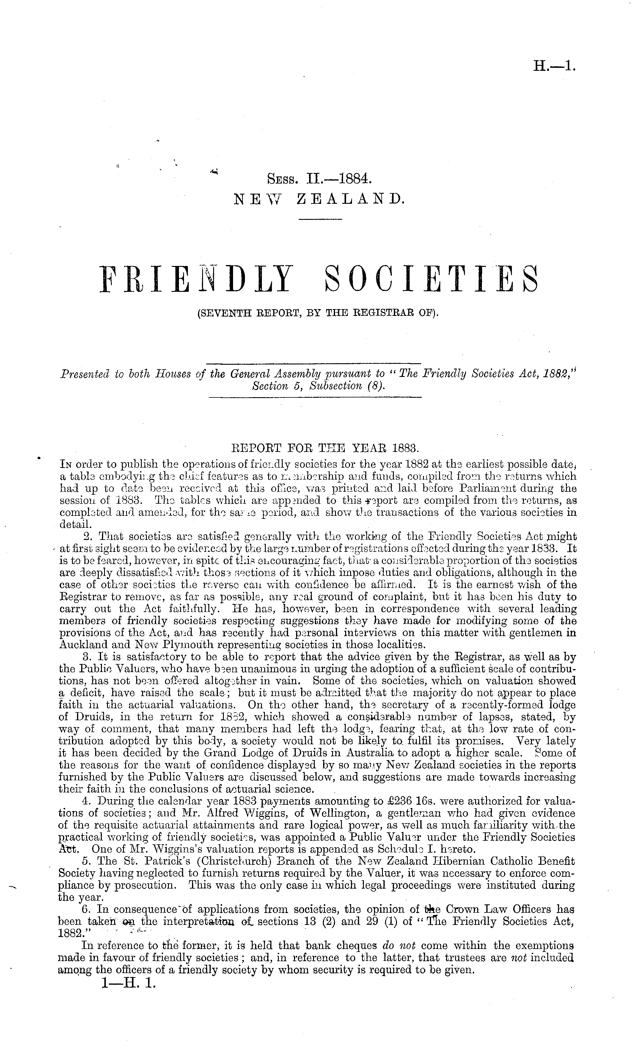 EEPOET FOE THE YEAE 1883. In order to publish the operations of friendly societies for the year 1882 at the earliest possible date* a table embodyii.g the chief features as to niKiberahip and funds, compiled from the returns which had up to date beeu received at thia office, wag printed and laid before Parliament during the session of 1883. The tables which are appended to this -report are compiled from the returns, as completed and amended, for the say io period, and show the transactions of the various societies in detail. 2. That societies are satisfied generally with the working of the Friendly Societies Act might at first sight seem to be evidenced by the large number of registrations effected during the year 1833. It is to be feared, however, in spite of this encouraging fact, t] iafr a considerable proportion of the societies are deeply dissatisfied with those sections of it which impose duties and obligations, although in the case of other societies the reverse can with confidence be affirmed. It is the earnest wish of the Ecgistrar to remove, as far as possible, any real ground of complaint, but it has been his duty to carry out the Act faithfully. lie has, however, been in correspondence with several leading members of friendly societies respecting suggestions they have made for modifying some of the provisions cf the Act, and has recently had personal interviews on this matter with gentlemen in Auckland and New Plymouth representing societies in those localities. 3. It is satisfactory to be able to report that the advice given by the Eegistrar, as well as by the Public Valuers, who have b^en unanimous in urging the adoption of a sufficient scale of contributions, has not been offered altogether in vain. Some of the societies, which on valuation showed a deficit, have raised the scale; but it must be admitted that the majority do not appear to place faith in the actuarial valuations. On the other hand, the secretary of a recently-formed lodge of Druids, in the return for 18-32, which showed a considerable number of lapses, stated, by way of comment, that many members had left the lodgi, fearing that, at the low rate of contribution adopted by this body, a society would not be likely to fulfil its promises. Very lately it has been decided by the Grand Lodge of Druids in Australia to adopt a higher scale. Pome of the reasons for the want of confidence displayed by so many New Zealand societies in the reports furnished by the Public Valuers are discussed, below, and suggestions are made towards increasing their faith in the conclusions of actuarial science. i. During the calendar year 1883 payments amounting to £236 16s. were authorized for valuations of societies; and Mr. Alfred Y/iggins, of Wellington, a gentleman who had given evidence of the requisite actuarial attainments and rare logical power, as well as much familiarity with the practical working of friendly societies, was appointed a Public Valuer under the Friendly Societies Act. One of Mr. Wiggins's valuation reports is appended as Schedule I. hereto. 5. The St. Patrick's (Christchurch) Branch of the New Zealand Hibernian Catholic Benefit Society having neglected to furnish returns required by the Valuer, it was necessary to enforce compliance by prosecution. This was the only case in which legal proceedings were instituted during the year. 6. In consequence of applications from societies, the opinion of the Crown Law Officers has been taken on the interpretation of. sections 13 (2) and 29 (1) of " Tlie Friendly Societies Act, 1882." In reference to the former, it is held that bank cheques do not come within the exemptions made in favour of friendly societies ; and, in reference to the latter, that trustees are not included among the officers of a friendly society by whom security is required to be given. I—H. 1.