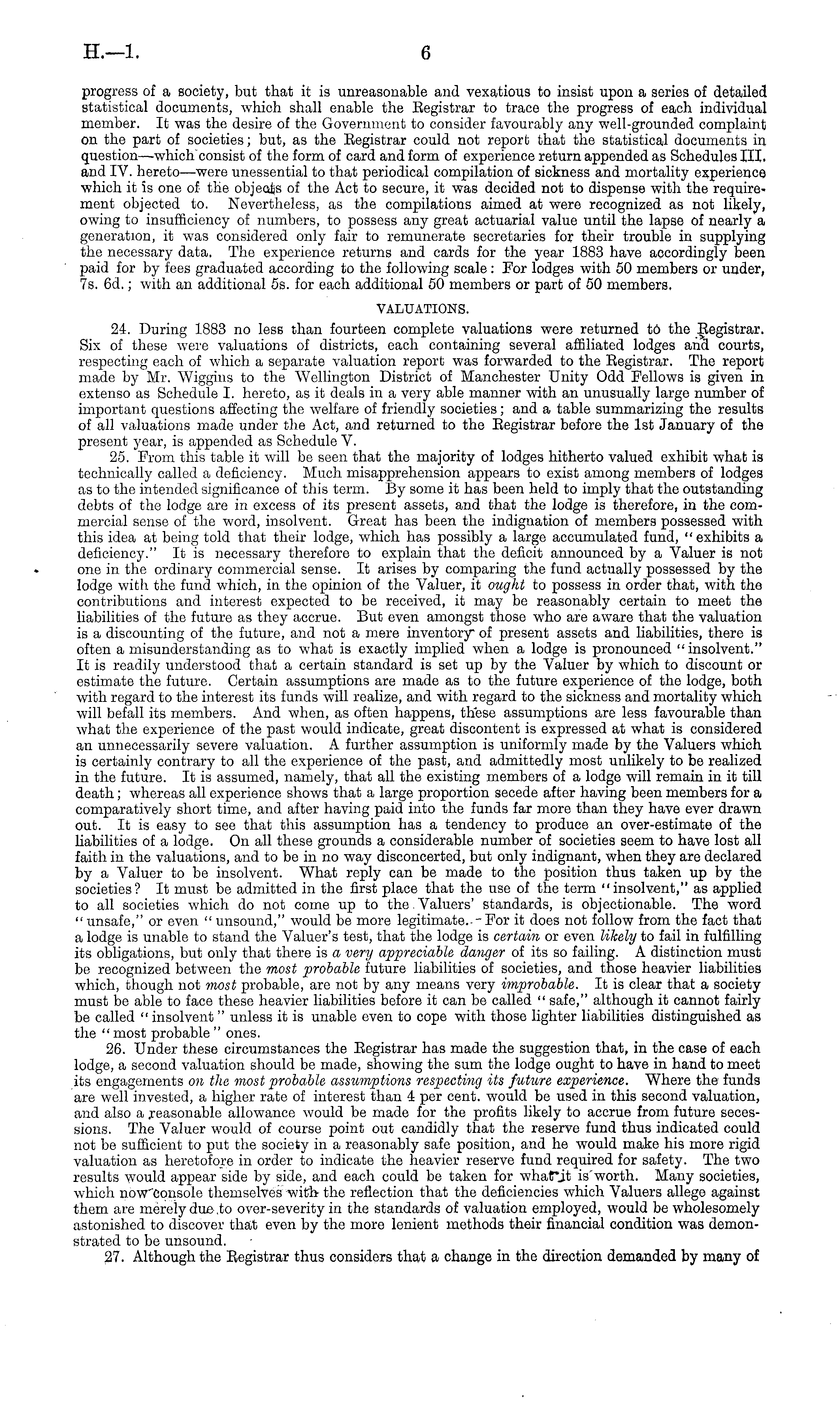 progress of a society, but that it is unreasonable and vexatious to insist upon a series of detailed statistical documents, which shall enable the Eegistrar to trace the progress of each individual member. It was the desire of the Government to consider favourably any well-grounded complaint on the part of societies; but, as the Eegistrar could not report that the statistical documents, in question—which consist of the form of card and form of experience return appended as Schedules 111, and IV. hereto—were unessential to that periodical compilation of sickness and mortality experience which it is one of the objeois of the Act to secure, it was decided not to dispense with the requirement objected to. Nevertheless, as the compilations aimed at were recognized as not likely, owing to insufficiency of numbers, to possess any great actuarial value until the lapse of nearly a generation, it was considered only fair to remunerate secretaries for their trouble in supplying the necessary data. The experience returns and cards for the year 1883 have accordingly been paid for by fees graduated according to the following scale: For lodges with 50 members or under, 7s. 6d.; with an additional ss. for each additional 50 members or part of 50 members. VALUATIONS. 24. During 1883 no less than fourteen complete valuations were returned to the Eegistrar. Six of these were valuations of districts, each containing several affiliated lodges and courts, respecting each of which a separate valuation report was forwarded to the Eegistrar. The report made by Mr. Wiggins to the Wellington District of Manchester Unity Odd Fellows is given in extenso as Schedule I. hereto, as it deals in a very able manner with an unusually large number of important questions affecting the welfare of friendly societies; and a table summarizing the results of all valuations made under the Act, and returned to the Eegistrar before the Ist January of the present year, is appended as Schedule V. 25. From this table it will be seen that the majority of lodges hitherto valued exhibit what is technically called a deficiency. Much misapprehension appears to exist among members of lodges as to the intended significance of this term. By some it has been held to imply that the outstanding debts of the lodge are in excess of its present assets, and that the lodge is therefore, in the commercial sense of the word, insolvent. Great has been the indignation of members possessed with this idea at being told that their lodge, which has possibly a large accumulated fund, "exhibits a deficiency." It is necessary therefore to explain that the deficit announced by a Valuer is not one in the ordinary commercial sense. It arises by comparing the fund actually possessed by the lodge with the fund which, in the opinion of the Valuer, it ought to possess in order that, with the contributions and interest expected to be received, it may be reasonably certain to meet the liabilities of the future as they accrue. But even amongst those who are aware that the valuation is a discounting of the future, and not a mere inventory of present assets and liabilities, there is often a misunderstanding as to what is exactly implied when a lodge is pronounced "insolvent." It is readily understood that a certain standard is set up by the Valuer by which to discount or estimate the future. Certain assumptions are made as to the future experience of the lodge, both with regard to the interest its funds will realize, and with regard to the sickness and mortality which will befall its members. And when, as often happens, these assumptions are less favourable than what the experience of the past would indicate, great discontent is expressed at what is considered an unnecessarily severe valuation. A further assumption is uniformly made by the Valuers which is certainly contrary to all the experience of the past, and admittedly most unlikely to be realized in the future. It is assumed, namely, that all the existing members of a lodge will remain in it till death; whereas all experience shows that a large proportion secede after having been members for a comparatively short time, and after having paid into the funds far more than they have ever drawn out. It is easy to see that this assumption has a tendency to produce an over-estimate of the liabilities of a lodge. On all these grounds a considerable number of societies seem to have lost all faith in the valuations, and to be in no way disconcerted, but only indignant, when they are declared by a Valuer to be insolvent. What reply can be made to the position thus taken up by the societies? It must be admitted in the first place that the use of the term "insolvent," as applied to all societies which do not come up to the. Valuers' standards, is objectionable. The word " unsafe," or even " unsound," would be more legitimate.- - For it does not follow from the fact that a lodge is unable to stand the Valuer's test, that the lodge is certain or even likely to fail in fulfilling its obligations, but only that there is a very appreciable danger of its so failing. A distinction must be recognized between the most probable future liabilities of societies, and those heavier liabilities which, though not most probable, are not by any means very improbable. It is clear that a society must be able to face these heavier liabilities before it can be called " safe," although it cannot fairly be called " insolvent " unless it is unable even to cope with those lighter liabilities distinguished as the "most probable " ones. 26. Under these circumstances the Eegistrar has made the suggestion that, in the case of each lodge, a second valuation should be made, showing the sum the lodge ought to have in hand to meet its engagements on the most probable assumptions respecting its future experience. Where the funds are well invested, a higher rate of interest than 4 per cent, would be used in this second valuation, and also a reasonable allowance 