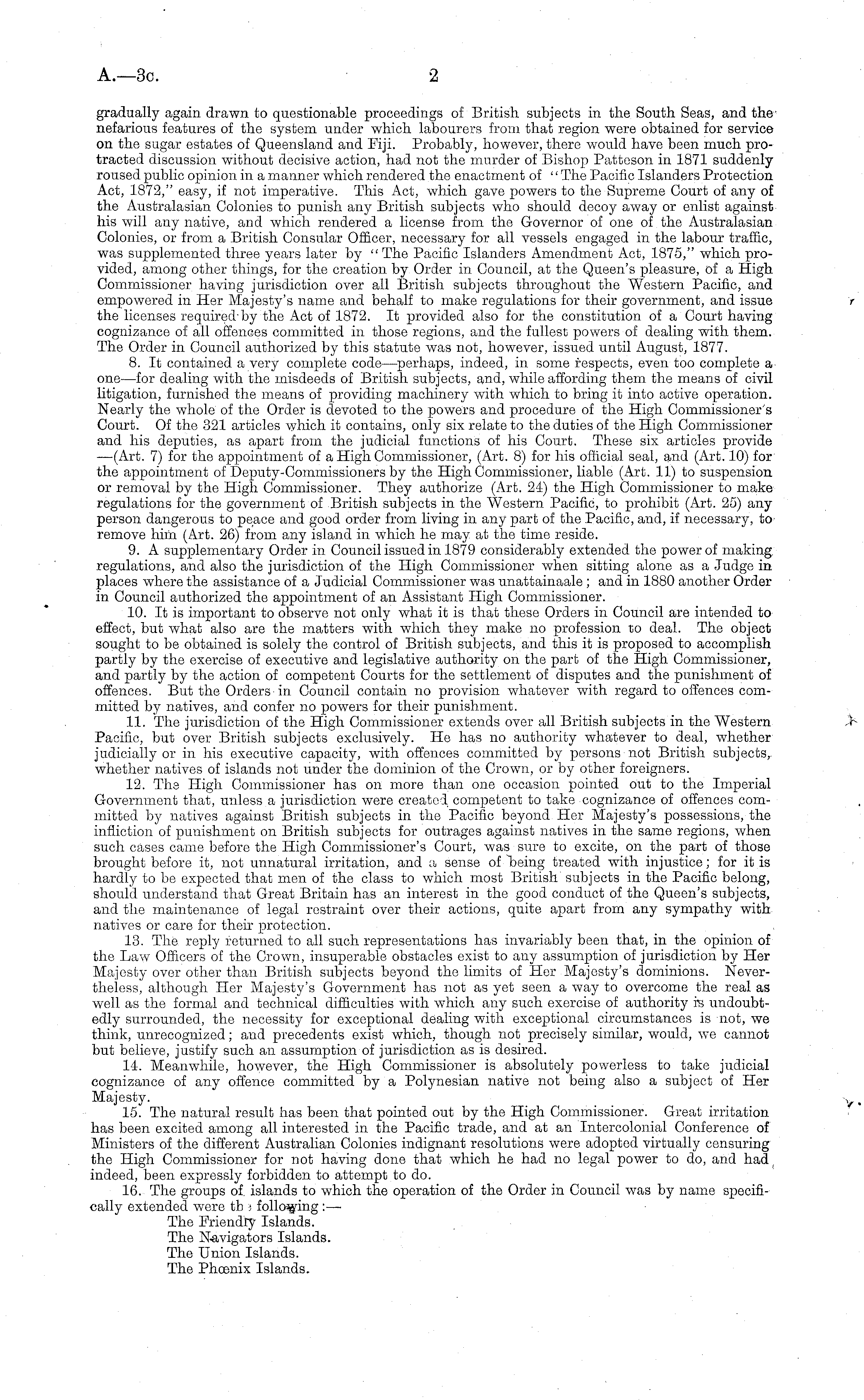 gradually again drawn to questionable proceedings of British subjects in the South Seas, and the nefarious features of the system under which labourers from that region were obtained for service on the sugar estates of Queensland and Fiji. Probably, however, there would have been much protracted discussion without decisive action, had not the murder of Bishop Pattoson in 1871 suddenly roused public opinion in a manner which rendered the enactment of '' The Pacific Islanders Protection Act, 1872," easy, if not imperative. This Act, which gave powers to the Supreme Court of any of the Australasian Colonies to punish any British subjects who should decoy away or enlist against his will any native, and which rendered a license from the Governor of one of the Australasian Colonies, or from a British Consular Officer, necessary for all vessels engaged in the labour traffic, was supplemented three years later by " The Pacific Islanders Amendment Act, 1875," which provided, among other things, for the creation by Order in Council, at the Queen's pleasure, of a High Commissioner having jurisdiction over all British subjects throughout the Western Pacific, and empowered in Her Majesty's name and behalf to make regulations for their government, and issue the licenses required"by the Act of 1872. It provided also for the constitution of a Court having cognizance of all offences committed in those regions, and the fullest powers of dealing with them. The Order in Council authorized by this statute was not, however, issued until August, 1877. 8. It contained a very complete code—perhaps, indeed, in some respects, even too complete a one—for dealing with the misdeeds of British subjects, and, while affording them the means of civil litigation, furnished the means of providing machinery with which to bring it into active operation. Nearly the whole of the Order is devoted to the powers and procedure of the High Commissioner's Court. Of the 321 articles which it contains, only six relate to the duties of the High Commissioner and his deputies, as apart from the judicial functions of his Court. These six articles provide —(Art. 7) for the appointment of a High Commissioner, (Art. 8) for his official seal, and (Art. 10) for the appointment of Deputy-Commissioners by the High Commissioner, liable (Art. 11) to suspension or removal by the High Commissioner. They authorize (Art. 24) the High Commissioner to make regulations for the government of British subjects in the Western Pacific, to prohibit (Art. 25) any person dangerous to peace and good order from living in any part of the Pacific, and, if necessary, to remove him (Art. 26) from any island in which he may at the time reside. 9. A supplementary Order in Council issued in 1879 considerably extended the power of making regulations, and also the jurisdiction of the High Commissioner when sitting alone as a Judge in places where the assistance of a Judicial Commissioner was unattainaale ; and in 1880 another Order in Council authorized the appointment of an Assistant High Commissioner. 10. It is important to observe not only what it is that these Orders in Council are intended to effect, but what also are the matters with which they make no profession to deal. The object sought to be obtained is solely the control of British subjects, and this it is proposed to accomplish partly by the exercise of executive and legislative authority on the part of the High Commissioner, and partly by the action of competent Courts for the settlement of disputes and the punishment of offences. But the Orders in Council contain no provision whatever with regard to offences committed by natives, and confer no powers for their punishment. 11. The jurisdiction of the High Commissioner extends over all British subjects in the Western Pacific, but over British subjects exclusively. He has no authority whatever to deal, whether judicially or in his executive capacity, with offences committed by persons not British subjects,, whether natives of islands not under the dominion of the Crown, or by other foreigners. 12. The High Commissioner has on more than one occasion pointed out to the Imperial Government that, unless a jurisdiction were created competent to take cognizance of offences committed by natives against British subjects in the Pacific beyond Her Majesty's possessions, the infliction of punishment on British subjects for outrages against natives in the same regions, when such cases came before the High Commissioner's Court, was sure to excite, on the part of those brought before it, not unnatural irritation, and a sense of "being treated with injustice; for it is hardly to be expected that men of the class to which most British subjects in the Pacific belong, should understand that Great Britain has an interest in the good conduct of the Queen's subjects, and the maintenance of legal restraint over their actions, quite apart from any sympathy with natives or care for their protection. 13. The reply returned to all such representations has invariably been that, in the opinion of the Law Officers of the Grown, insuperable obstacles exist to any assumption of jurisdiction by Her Majesty over other than British subjects beyond the limits of Her Majesty's dominions. Nevertheless, although Her Majesty's Government has not as yet seen a way to overcome the real as well as the formal and technical difficulties with which any such exercise of authority is undoubtedly surrounded, the necessity for exceptional dealing with exceptional circumstances is not, we think, unrecognized; and precedents exist which, though not precisely similar, would, we cannot but believe, justify such an assumption of jurisdiction as is desired. 14. Meanwhile, however, the High Commissioner is absolutely powerless to take judicial cognizance of any offence committed by a Polynesian native not being also a subject of Her Majesty. 15. The natural result has been that pointed out by the High Commissio