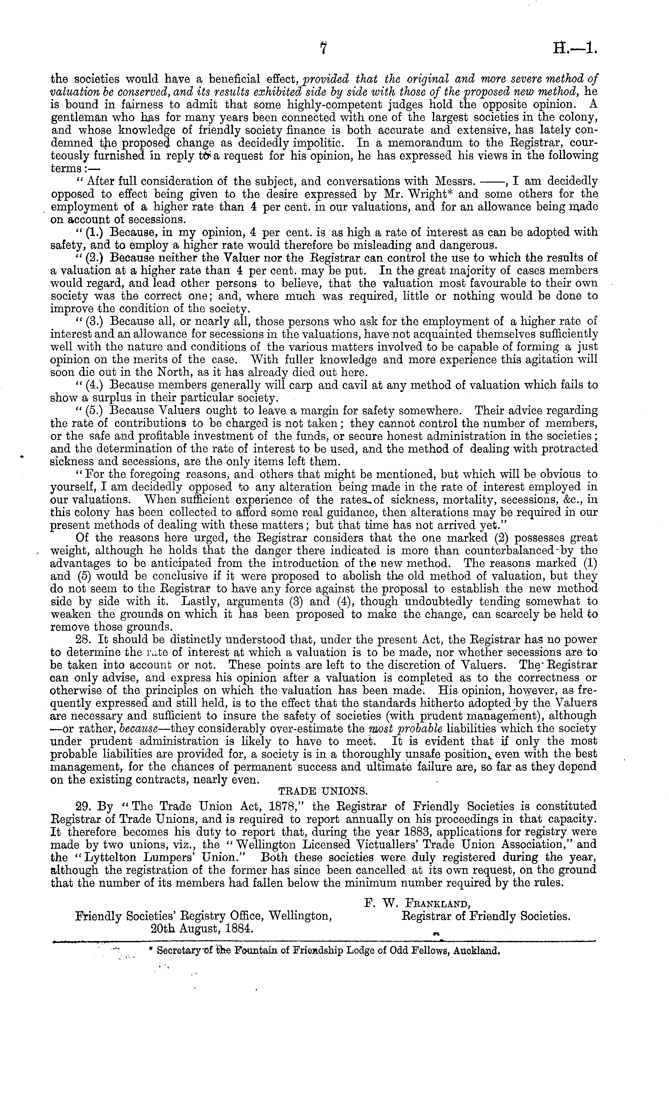 the societies would have a beneficial effect, provided that the original and more severe method of valuation be conserved, and its results exhibited side by side with those of the proposed new method, he is bound in fairness to admit that some highly-competent judges hold the opposite opinion. A gentleman who has for many years been connected with one of the largest societies in the colony, and whose knowledge of friendly society finance is both accurate and extensive, has lately condemned the proposed change as decidedly impolitic. In a memorandum to the Eegistrar, courteously furnished in reply to a request for his opinion, he has expressed his views in the following terms:— " After full consideration of the subject, and conversations with Messrs. , I am decidedly opposed to effect being given to the desire expressed by Mr. Wright* and some others for the employment of a higher rate than 4 per cent, in our valuations, and for an allowance being made on account of secessions. " (1.) Because, in my opinion, 4 per cent, is as high a rate of interest as can be adopted with safety, and to employ a higher rate would therefore be misleading and dangerous. " (2.) Because neither the Valuer nor the Eegistrar can control the use to which the results of a valuation at a higher rate than 4 per cent, may be put. In the great majority of cases members would regard, and lead other persons to believe, that the valuation most favourable to their own society was the correct one; and, where much was required, little or nothing would be done to improve the condition of the society. " (3.) Because all, or nearly all, those persons who ask for the employment of a higher rate of interest and an allowance for secessions in the valuations, have not acquainted themselves sufficiently well with the nature and conditions of the various matters involved to be capable of forming a just opinion on the merits of the case. With fuller knowledge and more experience this agitation will soon die out in the North, as it has already died out here. " (4.) Because members generally will carp and cavil at any method of valuation which fails to show a surplus in their particular society. " (5.) Because Valuers ought to leave a margin for safety somewhere. Their advice regarding the rate of contributions to be charged is not taken; they cannot control the number of members, or the safe and profitable investment of the funds, or secure honest administration in the societies; and the determination of the rate of interest to be used, and the method of dealing with protracted sickness and secessions, are the only items left them. " For the foregoing reasons, and others that might be mentioned, but which will be obvious to yourself, I am decidedly opposed to any alteration being made in the rate of interest employed in our valuations. When sufficient experience of the rates, of sickness, mortality, secessions, &c, in this colony has been collected to afford some real guidance, then alterations may be required in our present methods of dealing with these matters; but that time has not arrived yet." Of the reasons here urged, the Eegistrar considers that the one marked (2) possesses great weight, although he holds that the danger there indicated is more than counterbalanced by the advantages to be anticipated from the introduction of the new method. The reasons marked (1) and (5) would bo conclusive if it were proposed to abolish the old method of valuation, but they do not seem to the Eegistrar to have any force against the proposal to establish the new method side by side with it. Lastly, arguments (3) and (4), though undoubtedly tending somewhat to weaken the grounds on which it has been proposed to make the change, can scarcely be held to remove those grounds. 28. It should be distinctly understood that, under the present Act, the Eegistrar has no power to determine the r^te of interest at which a valuation is to be made, nor whether secessions are to be taken into account or not. These points are left to the discretion of Valuers. The Eegistrar can only advise, and express his opinion after a valuation is completed as to the correctness or otherwise of the principles on which the valuation has been made. His opinion, however, as frequently expressed and still held, is to the effect that the standards hitherto adopted by the Valuers are necessary and sufficient to insure the safety of societies (with prudent management), although —or rather, because —they considerably over-estimate the most probable liabilities which the society under prudent administration is likely to have to meet. It is evident that if only the most probable liabilities are provided for, a society is in a thoroughly unsafe position,, even with the best management, for the chances of permanent success and ultimate failure are, so far as they depend on the existing contracts, nearly even. TRADE UNIONS. 29. By " The Trade Union Act, 1878," the Eegistrar of Friendly Societies is constituted Eegistrar of Trade Unions, and is required to report annually on his proceedings in that capacity. It therefore becomes his duty to report that, during the year 1883, applications for registry were made by two unions, viz., the "Wellington Licensed Victuallers' Trade Union Association," and the " Lyttelton Lumpers' Union." Both these societies were duly registered during the year, although the registration of the former has since been cancelled at its own request, on the ground that the number of its members had fallen below the minimum number required by the rules. F. W. Feankland, Friendly Societies' Eegistry Office, Wellington, Eegistrar of Friendly Societies. 20th August, 1884.