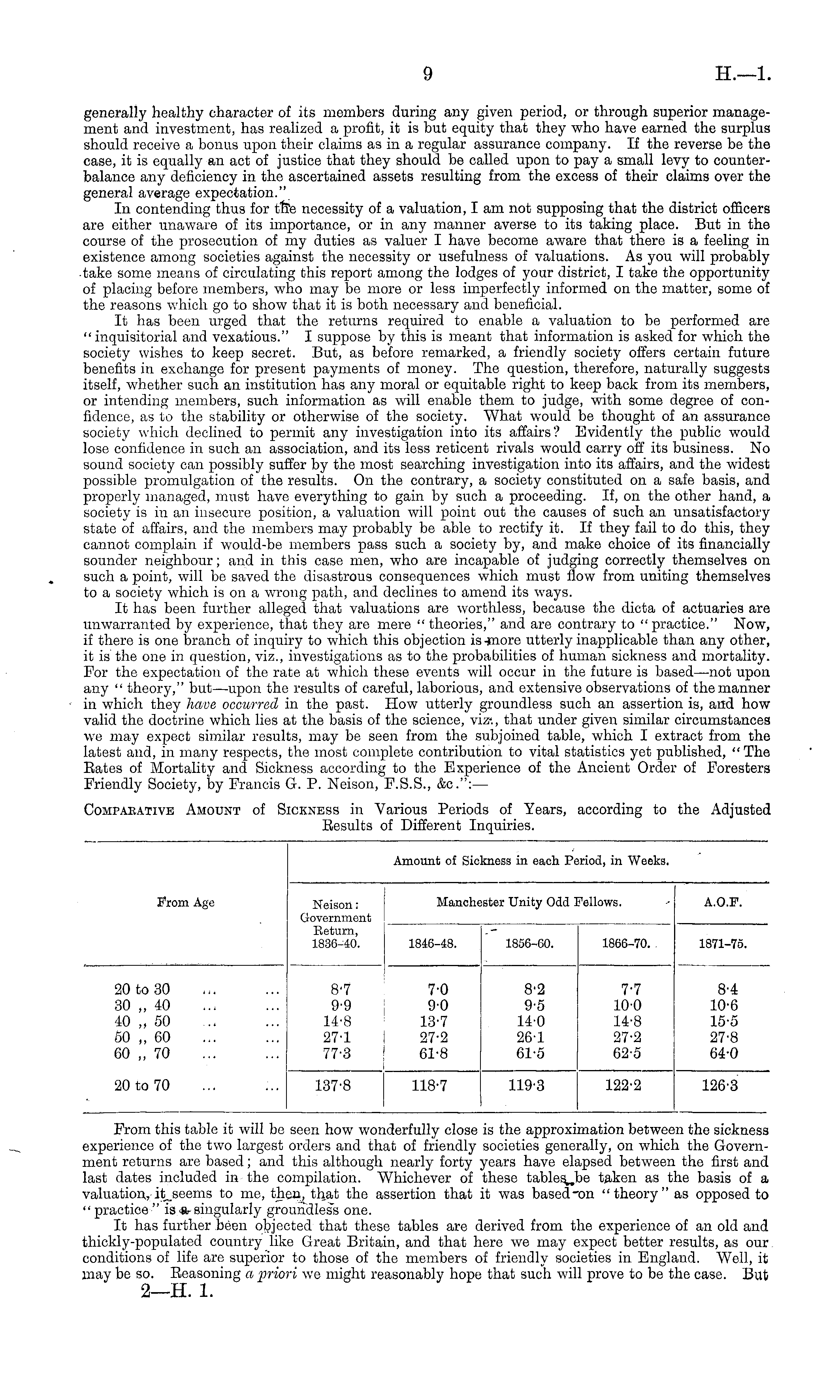 From this table it will be seen how wonderfully close is the approximation between the sickness experience of the two largest orders and that of friendly societies generally, on which the Government returns are based; and this although nearly forty years have elapsed between the first and last dates included in the compilation. Whichever of these tables, be taken as the basis of a valuation, it seems to me, then, that the assertion that it was based-on "theory" as opposed to " practice " is & singularly groundless one. It has further been objected that these tables are derived from the experience of an old and thickly-populated country like Great Britain, and that here we may expect better results, as our conditions of life are superior to those of the members of friendly societies in England. Well, it may be so. Reasoning a priori we might reasonably hope that such will prove to be the case. But 2—H. 1.