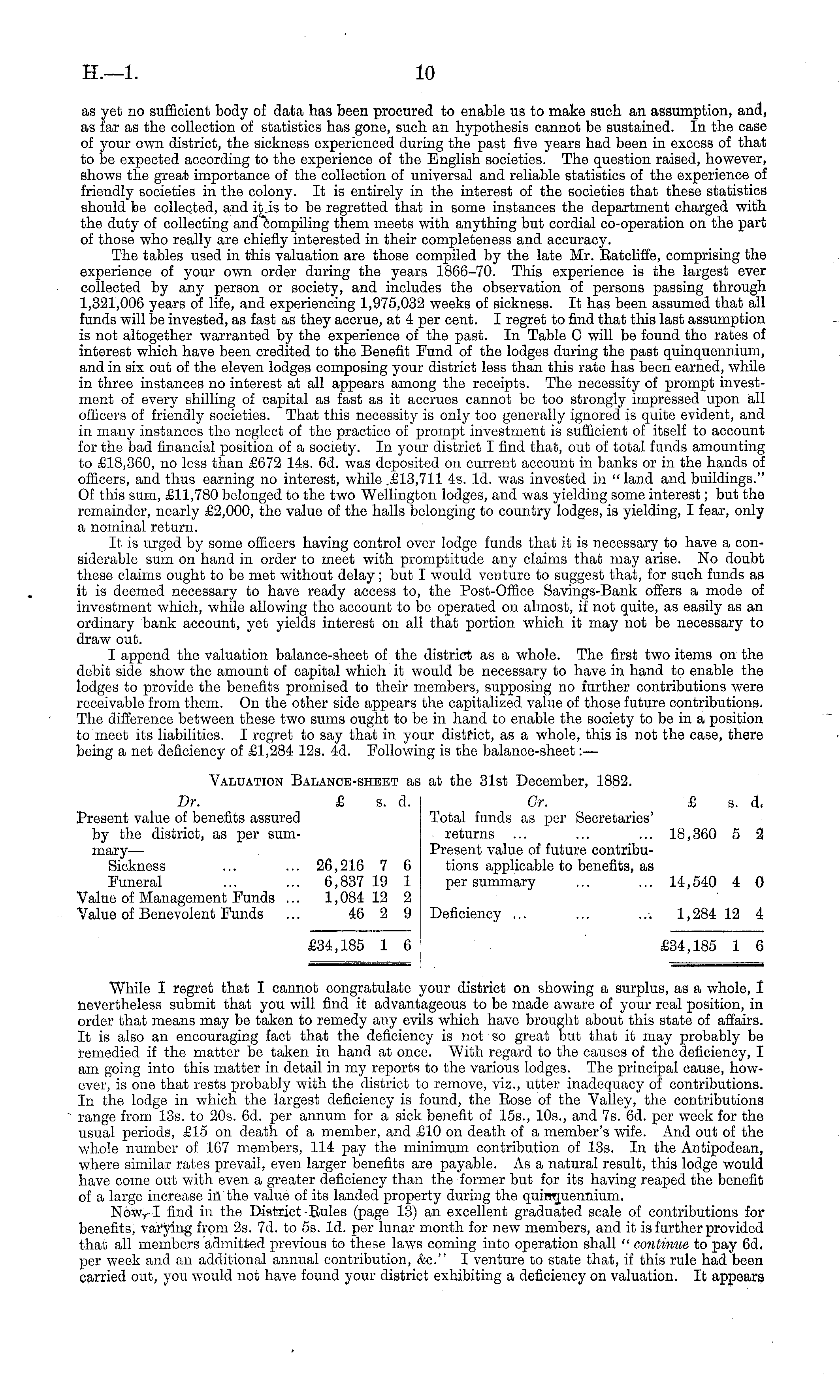 as yet no sufficient body of data has been procured to enable us to make such an assumption, and, as far as the collection of statistics has gone, such an hypothesis cannot be sustained. In the case of your own district, the sickness experienced during the past five years had been in excess of that to be expected according to the experience of the English societies. The question raised, however, shows the great importance of the collection of universal and reliable statistics of the experience of friendly societies in the colony. It is entirely in the interest of the societies that these statistics should be collected, and it is to be regretted that in some instances the department charged with the duty of collecting and compiling them meets with anything but cordial co-operation on the part of those who really are chiefly interested in their completeness and accuracy. The tables used in this valuation are those compiled by the late Mr. Ratcliffe, comprising the experience of your own order during the years 1866-70. This experience is the largest ever collected by any person or society, and includes the observation of persons passing through 1,321,006 years of life, and experiencing 1,975,032 weeks of sickness. It has been assumed that all funds will be invested, as fast as they accrue, at 4 per cent. I regret to find that this last assumption is not altogether warranted by the experience of the past. In Table C will be found the rates of interest which have been credited to the Benefit Fund of the lodges during the past quinquennium, and in six out of the eleven lodges composing your district less than this rate has been earned, while in three instances no interest at all appears among the receipts. The necessity of prompt investment of every shilling of capital as fast as it accrues cannot be too strongly impressed upon all officers of friendly societies. That this necessity is only too generally ignored is quite evident, and in many instances the neglect of the practice of prompt investment is sufficient of itself to account for the bad financial position of a society. In your district I find that, out of total funds amounting to £18,360, no less than £672 14s. 6d. was deposited on current account in banks or in the hands of officers, and thus earning no interest, while .£13,711 4s. Id. was invested in "land and buildings." Of this sum, £11,780 belonged to the two Wellington lodges, and was yielding some interest; but the remainder, nearly £2,000, the value of the halls belonging to country lodges, is yielding, I fear, only a nominal return. It is urged by some officers having control over lodge funds that it is necessary to have a considerable sum on hand in order to meet with promptitude any claims that may arise. No doubt these claims ought to be met without delay; but I would venture to suggest that, for such funds as it is deemed necessary to have ready access to, the Post-Office Savings-Bank offers a mode of investment which, while allowing the account to be operated on almost, if not quite, as easily as an ordinary bank account, yet yields interest on all that portion which it may not be necessary to draw out. I append the valuation balance-sheet of the district as a whole. The first two items on the debit side show the amount of capital which it would be necessary to have in hand to enable the lodges to provide the benefits promised to their members, supposing no further contributions were receivable from them. On the other side appears the capitalized value of those future contributions. The difference between these two sums ought to be in hand to enable the society to be in a position to meet its liabilities. I regret to say that in your district, as a whole, this is not the case, there being a net deficiency of £1,284 12s. 4d. Following is the balance-sheet :— Valuation Balance-sheet as at the 31st December, 1882. Dr. £ s. d. Gr. £ s. d. Present value of benefits assured Total funds as per Secretaries' by the district, as per sum- returns ... ... ... 18,360 5 2 mary— Present value of future contribuSickness ... ... 26,216 7 6 tions applicable to benefits, as Funeral ... ... 6,837 19 1 per summary ... ... 14,540 4 0 Value of Management Funds ... 1,084 12 2 j Value of Benevolent Funds ... 46 2 9 Deficiency ... ... ... 1,284 12 4 £34,185 1 6 J £34,185 1 6 While I regret that I cannot congratulate your district on showing a surplus, as a whole, I nevertheless submit that you will find it advantageous to be made aware of your real position, in order that means may be taken to remedy any evils which have brought about this state of affairs. It is also an encouraging fact that the deficiency is not so great but that it may probably be remedied if the matter be taken in hand at once. With regard to the causes of the deficiency, I am going into this matter in detail in my reports to the various lodges. The principal cause, however, is one that rests probably with the district to remove, viz., utter inadequacy of contributions. In the lodge in which the largest deficiency is found, the Eose of the Valley, the contributions range from 13s. to 20s. 6d. per annum for a sick benefit of 155., 10s., and 7s. 6d. per week for the usual periods, £15 on death of a member, and £10 on death of a member's wife. And out of the whole number of 167 members, 114 pay the minimum contribution of 13s. In the Antipodean, where similar rates prevail, even larger benefits are payable. As a natural result, this lodge would have come out with even a greater deficiency than the former but for its having reaped the benefit of a large increase ill the value of its landed property during the quinquennium. Now, I find in the District Eules (page 13) an excellent graduated scale of contributions for benefits, varying from 2s. 7d. to ss. Id. per lunar month for new members, and it is further provided that all members admitted previous to these laws coming into operation shall " continue to pay 6d. p
