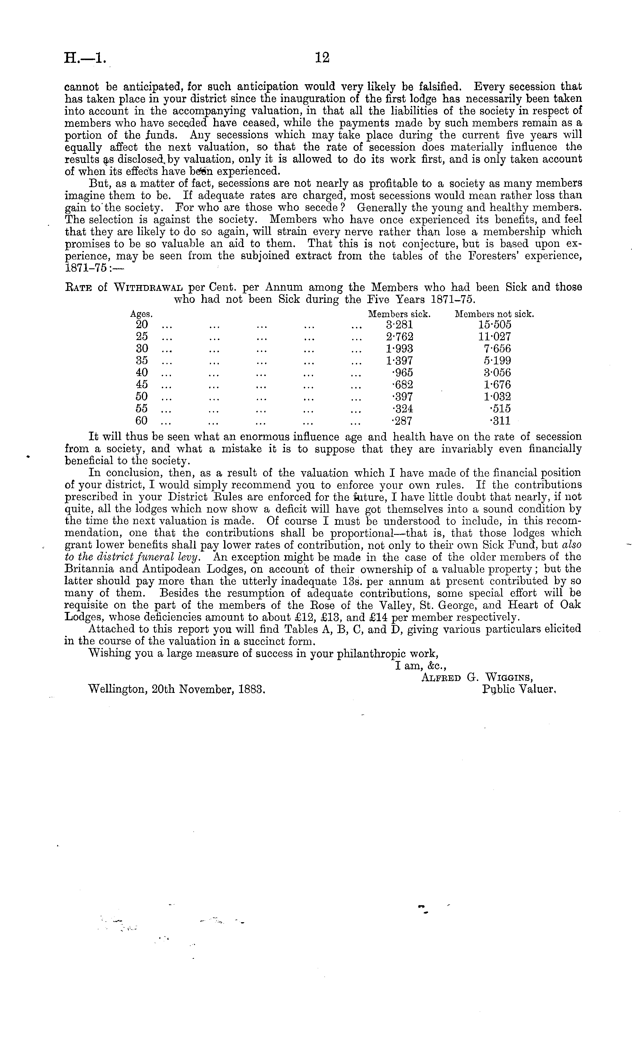 cannot be anticipated, for such anticipation would very likely be falsified. Every secession that has taken place in your district since the inauguration of the first lodge has necessarily been taken into account in the accompanying valuation, in that all the liabilities of the society in respect of members who have seceded have ceased, while the payments made by such members remain as a portion of the funds. Any secessions which may take place during the current five years will equally affect the next valuation, so that the rate of secession does materially influence the results as disclosed by valuation, only it is allowed to do its work first, and is only taken account of when its effects have been experienced. But, as a matter of fact, secessions are not nearly as profitable to a society as many members imagine them to be. If adequate rates are charged, most secessions would mean rather loss than gain to the society. For who are those who secede ? Generally the young and healthy members. The selection is against the society. Members who have once experienced its benefits, and feel that they are likely to do so again, will strain every nerve rather than lose a membership which promises to be so valuable an aid to them. That this is not conjecture, but is based upon experience, may be seen from the subjoined extract from the tables of the Foresters' experience, 1871-75 :— Bate of Withdrawal per Cent, per Annum among the Members who had been Sick and those who had not been Sick during the Five Years 1871-75. Ages. Members sick. Members not sick. 20 ... ... ... ... ... 3-281 15-505 25 ... ... ... ... ... 2-762 11-027 30 ... ... ... ... ... 1-993 7-656 35 ... ... ... ... ... 1-397 5-199 40 ... ..: ... ... ... -965 3-056 45 -682 1-676 50 -397 1-032 55 -324 -515 60 ... ... ... ... ... -287 -311 It will thus be seen what an enormous influence age and health have on the rate of secession from a society, and what a mistake it is to suppose that they are invariably even financially beneficial to the society. In conclusion, then, as a result of the valuation which I have made of the financial position of your district, I would simply recommend you to enforce your own rules. If the contributions prescribed in your District Eules are enforced for the future, I have little doubt that nearly, if not quite, all the lodges which now show a deficit will have got themselves into a sound condition by the time the next valuation is made. Of course I must be understood to include, in this recommendation, one that the contributions shall be proportional—that is, that those lodges which grant lower benefits shall pay lower rates of contribution, not only to their own Sick Fund, but also to the district funeral levy. An exception might be made in the case of the older members of the Britannia and Antipodean Lodges, on account of their ownership of a valuable property; but the latter should pay more than the utterly inadequate 13s. per annum at present contributed by so many of them. Besides the resumption of adequate contributions, some special effort will be requisite on the part of the members of the Eose of the Valley, St. George, and Heart of Oak Lodges, whose deficiencies amount to about £12, £13, and £14 per member respectively. Attached to this report you will find Tables A, B, C, and D, giving various particulars elicited in the course of the valuation in a succinct form. "Wishing you a large measure of success in your philanthropic work, I am, &c, Alfred G. Wiggins, Wellington, 20th November, 1883. Public Valuer.