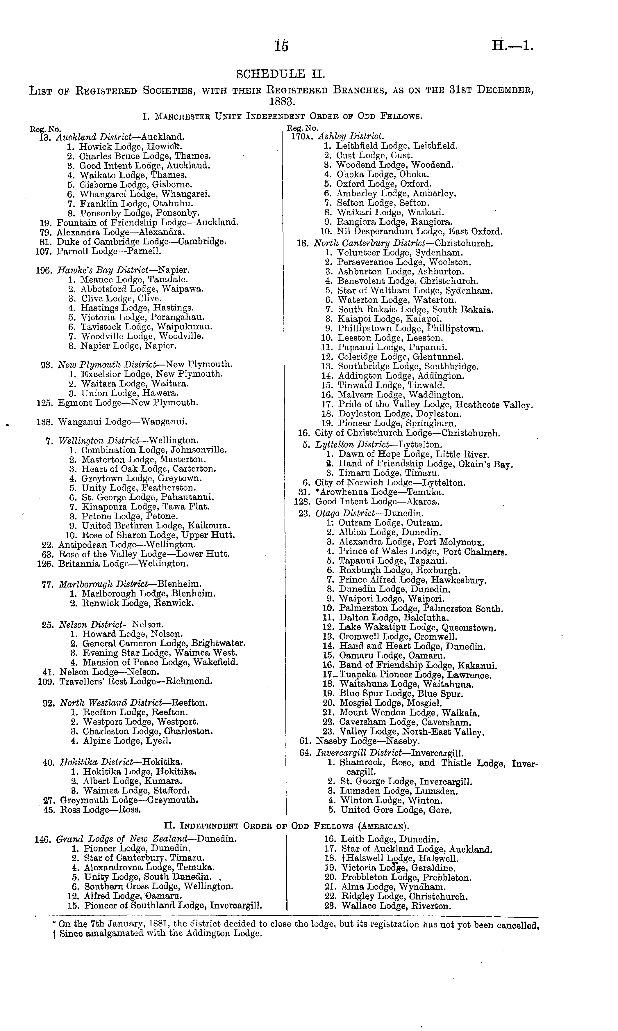 Beg. No. 170a. Ashley District. 1. Leithfield Lodge, Leithfield. 2. Oust Lodge, Cust. 3. Woodend Lodge, Woodend. 4. Ohoka Lodge, Ohoka. 5. Oxford Lodge, Oxford. 6. Amberley Lodge, Amberley. 7. Sefton Lodge, Sefton. 8. Waikari Lodge, Waikari. 9. Bangiora Lodge, Rangiora. 10. Nil Dosperandum Lodge, East Oxford. 18. North Canterbury District —Christchurch. 1. Volunteer Lodge, Sydenham. 2. Perseverance Lodge, Woolston. 3. Ashburton Lodge, Ashburton. 4. Benevolent Lodge, Christchurch. 5. Star of Waltham Lodge, Sydenham. 6. Waterton Lodge, Waterton. 7. South Eakaia Lodge, South Rakaia. 8. Kaiapoi Lodge, Kaiapoi. 9. Phillipstown Lodge, Phillipstown. 10. Leeston Lodge, Leeston. 11. Papanui Lodge, Papanui. 12. Coleridge Lodge, Glentunnel. 13. Southbridge Lodge, Southbridge. 14. Addington Lodge, Addington. 15. Tinwald Lodge, Tinwald. 16. Malvern Lodge, Waddington. 17. Pride of the Valley Lodge, Heathcote Valley. 18. Doyleston Lodge, Doyleston. 19. Pioneer Lodge, Springburn. 16. City of Christchurch Lodge—Christchurch. 5. Lyttelton District —Lyttelton. 1. Dawn of Hope Lodge, Little River. 2. Hand of Friendship Lodge, Okain's Bay. 3. Timaru Lodge, Timaru. 6. City of Norwich Lodge—Lyttelton. 81. 'Arowhenua Lodge—Temuka. 128. Good Intent Lodge—Akaroa. 23. Otago District —Dunedin. 1. Outram Lodge, Outram. 2. Albion Lodge, Dunedin. 3. Alexandra Lodge, Port Molyneux. 4. Prince of Wales Lodge, Port Chalmers. 5. Tapanui Lodge, Tapanui. 6. Roxburgh Lodge, Roxburgh. 7. Prince Alfred Lodge, Hawkesbury. 8. Dunedin Lodge, Dunedin. 9. Waipori Lodge, Waipori. 10. Palmerston Lodge, Palmerston South. 11. Dalton Lodge, Balolutha. 12. Lake Wakatipu Lodge, Queenstown. 13. Cromwell Lodge, Cromwell. 14. Hand and Heart Lodge, Dunodin. 15. Oamaru Lodge, Oamaru. 16. Band of Friendship Lodge, Kakanui. 17. Tuapeka Pioneer Lodge, Lawrence. 18. Waitahuna Lodge, Waitahuna. 19. Blue Spur Lodge, Blue Spur. 20. Mosgiel Lodge, Mosgiel. 21. Mount Wendon Lodge, Waikaia. 22. Caversham Lodge, Caversham. 23. Valley Lodge, North-East Valley. 61. Naseby Lodge—Naseby. 64. Invercargill District —lnvercargill. 1. Shamrock, Rose, and Thistle Lodge, Invercargill. 2. St. George Lodge, Invercargill. 3. Lumsden Lodge, Lumsden. 4. Winton Lodge, Winton. 5. United Gore Lodge, Gore.