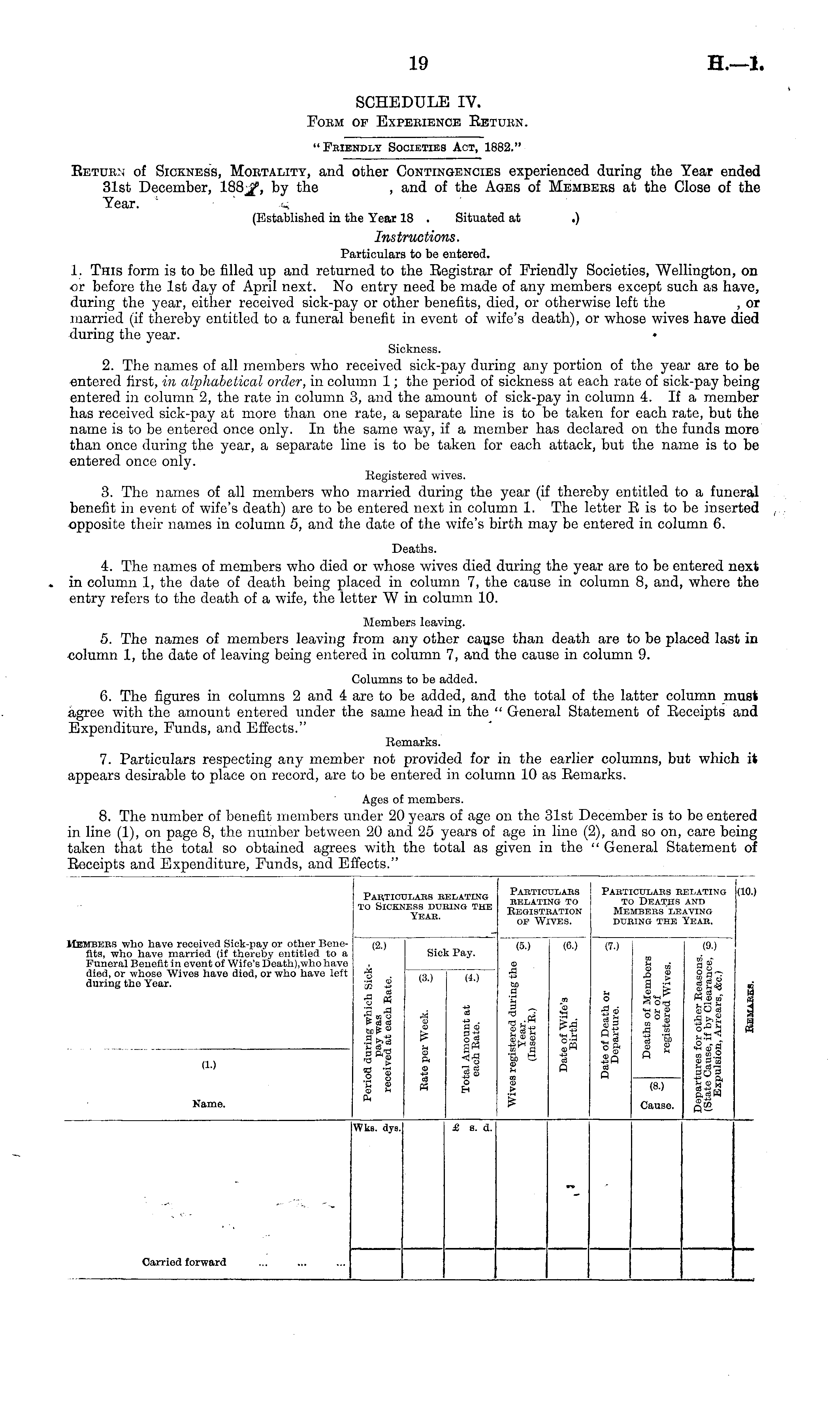 Betukn of Sickness, Mortality, and other Contingencies experienced during the Year ended 31st December, 188^, by the , and of the Ages of Members at the Close of the Year. (Established in the Year 18 . Situated at .) Instructions. Particulars to be entered. 1. This form is to be filled up and returned to the Registrar of Friendly Societies, Wellington, on or before the Ist day of April next. No entry need be made of any members except such as have, during the year, either received sick-pay or other benefits, died, or otherwise left the , or married (if thereby entitled to a funeral benefit in event of wife's death), or whose wives have died during the year. Sickness. 2. The names of all members who received sick-pay during any portion of the year are to be entered first, in alphabetical order, in column 1; the period of sickness at each rate of sick-pay being entered in column 2, the rate in column 3, and the amount of sick-pay in column 4. If a member has received sick-pay at more than one rate, a separate line is to be taken for each rate, but the name is to be entered once only. In the same way, if a member has declared on the funds more than once during the year, a separate line is to be taken for each attack, but the name is to be entered once only. Registered wives. 3. The names of all members who married during the year (if thereby entitled to a funeral benefit in event of wife's death) are to be entered next in column 1. The letter Risto be inserted opposite their names in column 5, and the date of the wife's birth may be entered in column 6. Deaths. 4. The names of members who died or whose wives died during the year are to be entered next in column 1, the date of death being placed in column 7, the cause in column 8, and, where the entry refers to the death of a wife, the letter W in column 10. Members leaving. 5. The names of members leaving from any other cause than death are to be placed last in column 1, the date of leaving being entered in column 7, and the cause in column 9. Columns to be added. 6. The figures in columns 2 and 4 are to be added, and the total of the latter column must agree with the amount entered under the same head in the " General Statement of Eeceipts and Expenditure, Funds, and Effects." Remarks. 7. Particulars respecting any member not provided for in the earlier columns, but which it appears desirable to place on record, are to be entered in column 10 as Remarks. Ages of members. 8. The number of benefit members under 20 years of age on the 31st December is to be entered in line (1), on page 8, the number between 20 and 25 years of age in line (2), and so on, care being taken that the total so obtained agrees with the total as given in the " General Statement of Receipts and Expenditure, Funds, and Effects."