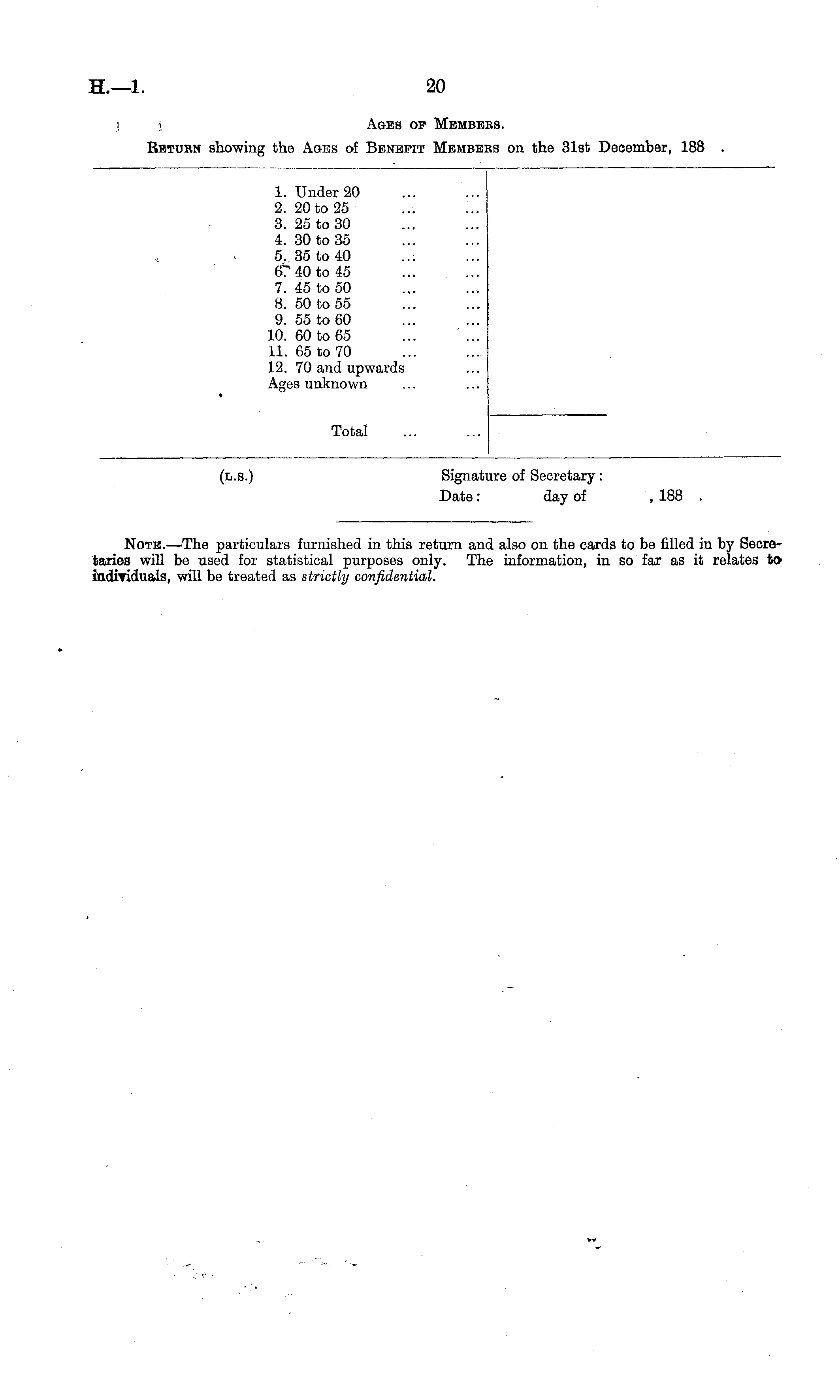1. Under 20 2. 20 to 25 3. 25 to 30 4. 30 to 35 5. 35 to 40 6. 40 to 45 7. 45 to 50 8. 50 to 55 9. 55 to 60 10. 60 to 65 11. 65 to 70 12. 70 and upwards Ages unknown » Total (L.S.) Signafr ire of Secretary: day of Date: ,188