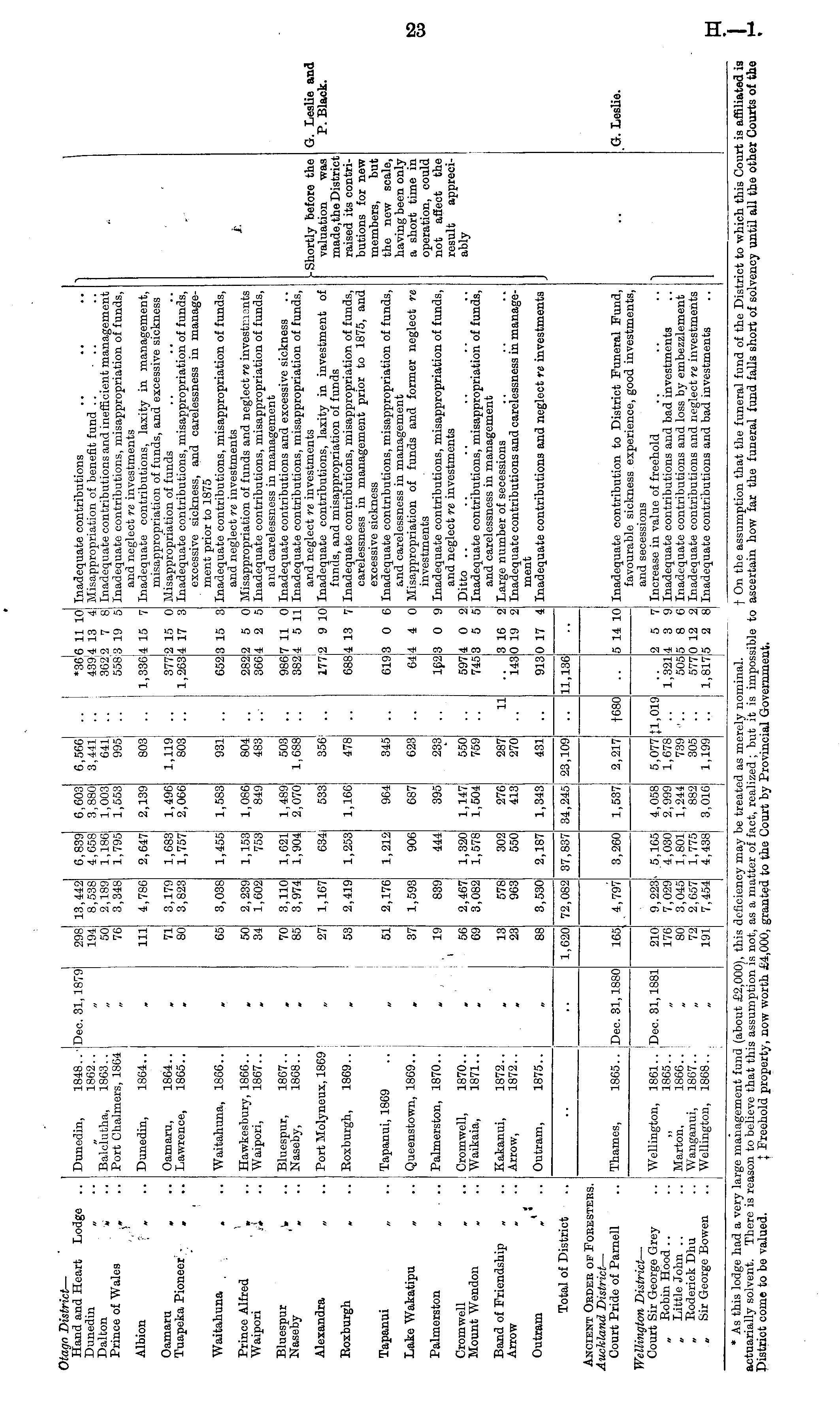Otagn District — Hand and Heart Lodge .. Dunedin „ Dalton „ Prince of Wales „ Albion , Dunedin, 1848.. 1862.. Balclutha, 1863.. Port Chalmers, 1864 Dec. 31,1879 I 298 trtA 298 194 50 76 13,442 8,538 2,189 3,348 6,839 4,658 1,186 1,795 6,603 3,880 1,003 1,553 6,566 3,441 641 995 *36l 439. 362! 558: 1 6 11 10 4 13 4 2 7 8 3 19 5 Inadequate contributions Misappropriation of benefit fund .. • .. Inadequate contributions and inefficient management Inadequate contributions, misappropriation of funds, and neglect re investments Inadequate contributions, laxity in management, misappropriation of funds, and excessive sickness Misappropriation of funds Inadequate contributions, misappropriation of funds, excessive sickness, and carelessness in management prior to 1875 Inadequate contributions, misappropriation of funds, and neglect re investments Misappropriation of funds and neglect re investments Inadequate contributions, misappropriation of funds, and carelessness in management Inadequate contributions and excessive sickness Inadequate contributions, misappropriation of funds, and neglect re investments Inadequate contributions, laxity in investment of funds, and misappropriation of funds Inadequate contributions, misappropriation of funds, carelessness in management prior to 1875, and excessive sickness Inadequate contributions, misappropriation of funds, and carelessness in management Misappropriation of funds and former neglect re investments Inadequate contributions, misappropriation of funds, and neglect re investments Ditto .. Inadequate contributions, misappropriation of funds, and carelessness in management Large number of secessions Inadequate contributions and carelessness in management Inadequate contributions and neglect re investments 76 Dunedin, 1864.. • 111 111 4,786 2,647 2,139 803; 1,336 !4 15 7 Oamaru „ Tuapeka Pioneer „ Oamaru, 1864.. Lawrence, 1865.. # m 71 on 71 80 3,179 3,823 1,683 1,757 1,496 2,066 1,119 803 377 1,263 2 15 0 4 17 3 » Waitahuna « , Waitahuna, 1866.. 65 65 3,038 1,455 1,583 931 652 3 15 3 I Prince Alfred » Waipori , Hawkesbury, 1866.. Waipori, 1867.. 50 50 34 2,239 1,602 1,153 753 1,086 849 804 483 282 366 1 2 5 0 4 2 5 Bluespur , Naseby ' „ Bluespur, 1867.. Naseby, 1868.. 70 OCT 70 85 3,110 3,974 1,621 1,904 1,489 2,070 503J 1,688 986 382; 7 11 0 4 5 11 Shortly before the valuation was made,the District raised its contributions for new members, but the new scale, having been only a short time in operation, could not affect the result appreciably Alexandra „ Port Molyneux, 1869 i 1 27! 27 1,167 6341 533 356 17 T 2 9 10 G. Leslie and P. Black. Eoxburgh „ Eoxburgh, 1869.. w 53 53 2,419 1,253 1,166 478 688, 4 13 7 Tapanui „ Tapanui, 1869 " 51 2,176 1,212 964 345! 619 3 0 6 Lake Wakatipu ,, Queenstown, 1869.. * 37 1,593 906 687 623 64 ;4 4 0 Palmerston „ ... Palmerston, 1870.. a 19 i » 839 444 395 233 162' 3 0 9 ! Cromwell „ Mount Wendon . Cromwell, 1870.. Waikaia, 1871.. # 56 69 2,467 3,082 1,320 1,578 1,147 1,504 550 759 597 745 4 0 21 3 5 5| Band of Friendship „ Arrow „ Kakanui, 1872.. Arrow, 1872.. - „ 13 23 578 963 302 550 276 413 287 270 111 143; |3 16 2! JO 19 2; Outram , * Outram, 1875.. 88 3,530 2,187 1,343 431 913! 'o 17 4 Total of District 1,020 72,082; 37,837 34,245 23,109 11,136 •• Ancient Obder of Foresters. Auckland District — Court Pride of Parnoll 1680 5 14 10 Inadequate contribution to District Funeral Fund, favourable sickness experience, good investments, and secessions Increase in value of freehold Inadequate contributions and bad investments Inadequate contributions and loss by embezzlement Inadequate contributions and neglect re investments Inadequate contributions and bad investments Thames, 1865.. pec. 31,1880 165 4,797 3,260 1,537 2,217 G. Leslie. •• Wellington District — Court Sir George Grey „ Eobin Hood .. „ Little John .. „ Eoderick Dhu „ Sir George Bowen Wellington, 1861.. Dec. 31,1881 1865.. ' Marton, 1866.. Wanganui, 1867.. Wellington, 1868.. 210 176 80 72 191 9,223 7,029 3,045 2,657 7,454 5,165 4,030 1,801 1,775 4,438 4,058 2,999 1,244 882 3,016 5,077! 1,678! 739 305| 1,199! jU.019 505 577 1,817! j2 5 7 4 3 9 5 8 0 0 12 2 5 2 8 ; •• * As this lodge had a very large management fund (about £2,000), this deficiency may be treate actuarially solvent. There is reason to believe that this assumption is not, as a matter of fact, reali District come to be valued. J Freehold property, now worth £4,000, granted to the Court by :d as merely n< ized ; but it if Provincial Go 1 iminal. f On the assumption that the funeral fund of the District to which this Court is affiliated is impossible to ascertain how far the funeral fund falls short of solvency until all the other Courts of the 'eminent.
