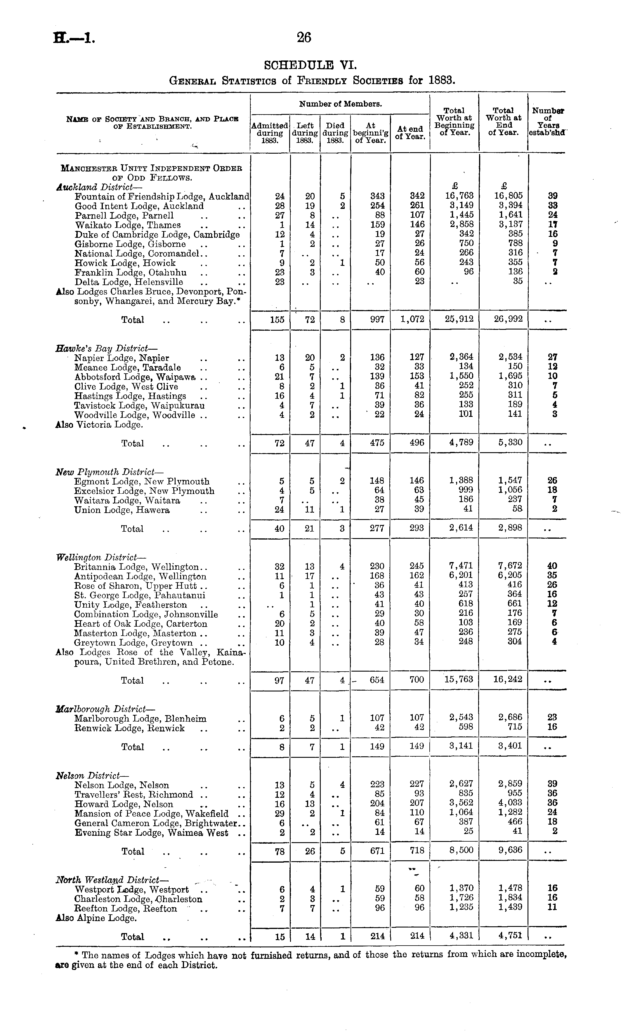 Name of Society and Bbanch, and PnACK of Establishment. admitted Left during during 1883. 1883. Numl >er of [embers. Total Worth at Beginning of Year. Total Worth at End of Year. Number of Years estab'shd Died during 1883. At begiimi'g of Year. At end of Year. Manchester Unity Independent Order of Odd Fellows. Auckland District — Fountain of Friendship Lodge, Auckland Good Intent Lodge, Auckland Parnell Lodge, Parnell Waikato Lodge, Thames Duke of Cambridge Lodge, Cambridge Gisborno Lodge, Gisborne National Lodge, Coromandel.. Howick Lodge, Howiok Franklin Lodge, Otahuhu Delta Lodge, Helensville Also Lodges Charles Bruce, Devonport, Ponsonby, Whangarei, and Mercury Bay.* 24 28 27 1 12 1 7 9 23 23 20 19 8 14 4 2 5 2 343 254 88 159 19 27 17 50 40 342 261 107 146 27 26 24 56 60 23 £ 16,763 3,149 1,445 2,858 342 750 266 243 96 £ 16,805 3,394 1,641 3,137 385 788 316 355 136 35 39 33 24 IT 16 9 7 7 2 2 3 "l Total 155 72 997 1,072 25,912 20,992 Eawke's Bay District — Napier Lodge, Napier Meanee Lodge, Taradale Abbotsford Lodge, Waipawa Clive Lodge, West Clive Hastings Lodge, Hastings Tavistock Lodge, Waipukurau Woodvillo Lodge, Woodville Also Victoria Lodge. 18 6 21 8 16 4 4 20 5 7 2 4 7 2 2 "l 1 136 32 139 36 71 39 ' 22 127 33 153 41 82 36 24 2,364 134 1,550 252 255 133 101 2,534 150 1,695 310 311 189 141 27 12 10 7 5 4 3 Total 72 47 475 496 4,789 5,330 New Plymouth District — Egmont Lodge, New Plymouth Excelsior Lodge, Now Plymouth Waitara Lodge, Waitara Union Lodge, Hawera 5 4 7 24 5 5 2 148 64 38 27 146 63 45 39 1,388 999 186 41 1,547 1,056 237 58 26 18 7 2 11 "l Total 40 21 277 293 2,614 2,898 Wellington District — Britannia Lodge, Wellington.. Antipodean Lodge, Wellington Boso of Sharon, Upper Hutt St. George Lodge, Pahautanui Unity Lodge, Featherston Combination Lodge, Johnsonville Heart of Oak Lodge, Carterton Masterton Lodge, Masterton Greytown Lodge, Greytown Also Lodges Eose of the Valley, Kainapoura, United Brethren, and Potone. 32 11 6 1 13 17 1 1 1 5 2 3 4 4 230 168 36 43 41 29 40 39 28 245 162 41 43 40 30 58 47 34 7,471 6,201 413 257 618 216 103 236 248 7,672 6,205 416 364 661 176 169 275 304 40 35 26 16 12 7 6 G 4 6 20 11 10 Total 97 47 654 700 15,763 16,242 Marlborough District — Marlborough Lodge, Blenheim Eenwick Lodge, Eenwick 6 2 5 2 1 107 42 107 42 2,543 598 2,686 715 23 16 Total 149 149 3,141 3,401 Nelson District — Nelson Lodge, Nelson Travellers' Best, Bichmond Howard Lodge, Nelson Mansion of Peace Lodge, Wakefield .. General Cameron Lodge, Brightwater.. Evening Star Lodge, Waimea West .. 13 ia 16 29 6 2 5 4 13 2 4 "l 223 85 204 84 61 14 227 93 207 110 67 14 2,027 835 3,562 1,064 387 25 2,859 955 4,033 1,282 466 41 39 36 86 24 18 2 "2 Total 78 26 671 718 8,500 9,636 North Westland District — Westport Lodge, Westport Charleston Lodge, Charleston Eeefton Lodge, Beefton Also Alpine Lodge. e 2 7 4 3 7 1 59 59 96 60 58 96 1,370 1,726 1,235 1,478 1,834 1,439 16 16 11 Total 15 14 214 214 4,331 4,751 * The names of Lodges which have not furnished retur] given at the end of each District. is, and of those tho returns from which are incomplete,