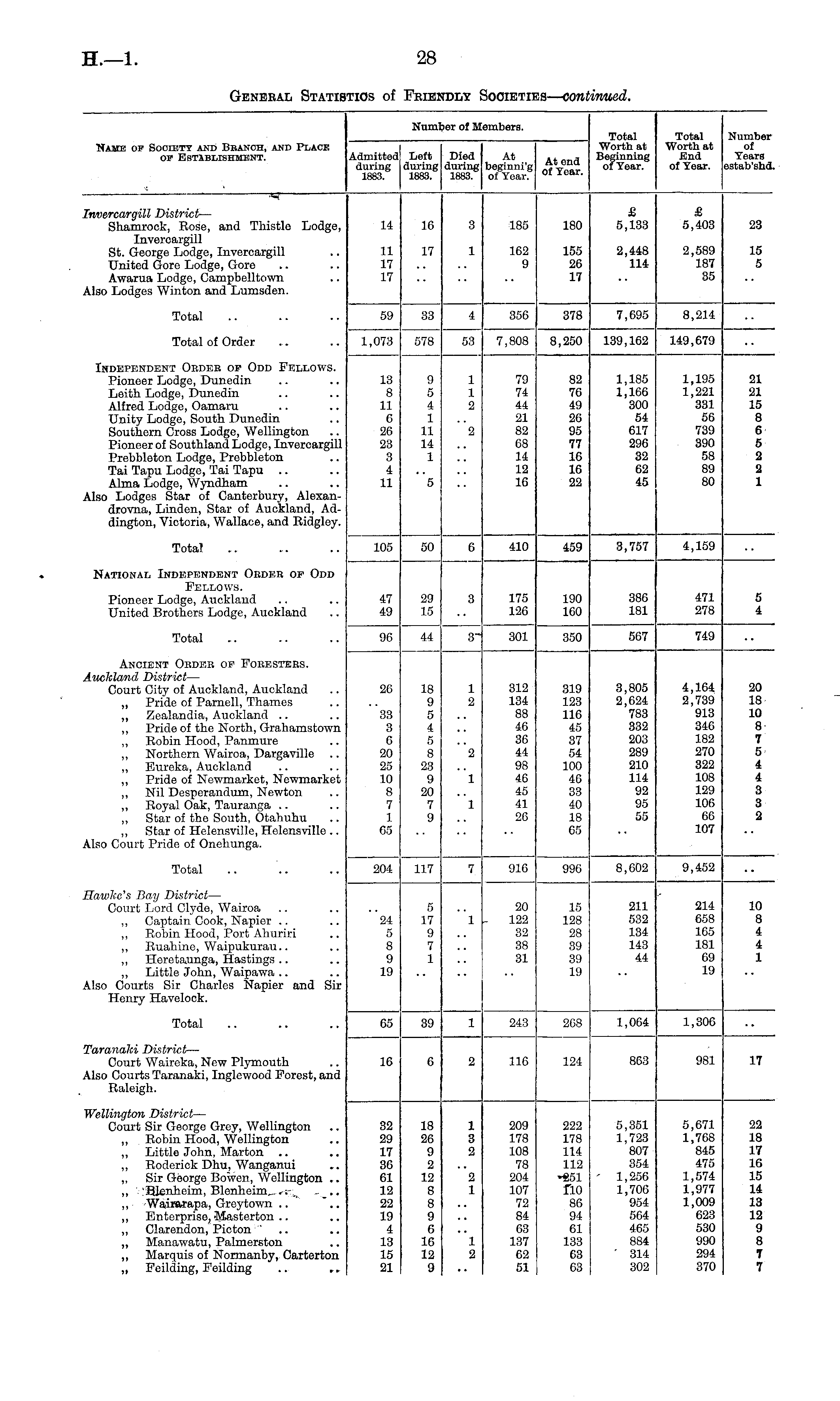 Numl ler of [embers. Name of Society akd Bbanoh, and Place op Establishment. of Year. ot YoarTotal Worth at Beginning of Year. Total Worth at End of Year. Number ol Years estab'shd. Admitted during 1883. Left during 1883. Died during 1883. r nvercargill District — Shamrock, Rose, and Thistlo Lodge, Inveroargill St. George Lodge, Invercargill United Gore Lodge, Gore Awarna Lodge, Campbelltown Uso Lodges Winton and Lumsden. 14 11 17 17 16 17 3 1 185 162 9 180 155 26 17 £ 5,133 2,448 114 £ 5,403 2,589 187 35 28 15 5 Total 59 33 356 378 7,695 8,214 Total of Order 1,073 578 53 7,808 8,250 139,162 149,679 Independent Order op Odd Fellows. Pioneer Lodge, Dunedin Leith Lodge, Dunedin Alfred Lodge, Oamaru Unity Lodge, South Dunedin Southern Cross Lodge, Wellington Pioneer of Southland Lodge, Invorcargill Prebbleton Lodge, Prebbleton Tai Tapu Lodge, Tai Tapu Alma Lodge, Wyndham Uso Lodges Star of Canterbury, Alexandrovna, Linden, Star of Auckland, Addington, Victoria, Wallace, and Ridgley. 13 8 11 6 26 28 3 4 11 9 5 4 1 11 14 1 1 1 2 "2 79 74 44 21 82 68 14 12 L6 82 76 49 2G 95 77 16 16 22 1,185 1,166 300 54 617 296 32 62 45 1,195 1,221 331 56 739 390 58 89 80 21 21 15 8 6 5 2 2 1 "5 Total 105 50 410 459 3,757 4,159 National Independent Order op Odd Fellows. Pioneer Lodge, Auckland United Brothers Lodge, Auckland 386 181 471 278 5 4 47 4'J 29 15 3 175 126 190 160 Total 96 44 301 350 567 749 Ancient Order op Foresters. Auckland District — Court City of Auckland, Auckland ,, Pride of Parnell, Thames „ Zealandia, Auckland .. ,, Pride of the North, Grahamstown ,, Robin Hood, Panmure ,, Northern Wairoa, Dargavillo ,, Eureka, Auckland „ Pride of Newmarket, Newmarket ,, Nil Desperandum, Newton ,, Royal Oak, Tauranga .. ,, Star of the South, Otahuhu „ Star of Helonsville, Helensville .. Uso Court Pride of Onehunga. 26 33 3 6 20 25 10 8 7 1 65 18 9 5 4 5 8 23 9 20 7 9 1 2 "2 312 134 88 46 36 44 98 40 45 41 26 319 123 116 45 37 54 100 46 33 40 18 65 3,805 2,624 783 332 203 289 210 114 92 95 55 4,164 2,739 913 346 182 270 322 108 129 106 66 107 20 18 10 8 7 5 4 4 3 3 2 1 1 Total 204 117 916 996 8,602 9,452 lawlce's Bay District — Court Lord Clyde, Wairoa „ Captain Cook, Napier .. ,, Robin Hood, Port Ahuriri ,, Ruahine, Waipukurau.. ,, Heretaunga, Hastings .. ,, Little John, Waipawa .. Uso Courts Sir Charles Napier and Sir Henry Havelock. 24 5 8 9 19 5 17 9 7 1 1 20 122 32 38 31 15 128 28 39 39 19 211 532 134 143 44 214 658 165 181 69 19 10 8 4 4 1 65 Total 39 243 208 1,064 1,306 Varanaki District — Court Waireka, New Plymouth Uso Courts Taranaki, Inglewood Forest, and Raleigh. 16 116 124 863 981 17 Wellington District — Court Sir George Grey, Wellington „ Robin Hood, Wellington ,, Little John, Marton „ Roderick Dhu, Wanganui „ Sir George Bowen, Wellington .. ,, Blenheim, Blenheim .. ,, Wairarapa, Grcytown .. ,, Fjnterprise, Masterton .. ,, Clarendon, Picton „ Manawatu, Palmerston „ Marquis of Norrnanby, Carterton „ Feilding, Feilding .. ,. 32 a;» 17 86 (il 12 22 19 4 13 15 21 18 26 9 2 12 8 8 9 6 16 12 9 1 3 2 2 1 209 178 108 78 204 107 72 84 63 137 62 51 222 178 114 112 •851 no 86 94 61 133 63 63 5,351 1,723 807 354 1,256 1,706 954 564 465 884 ' 314 302 5,671 1,768 845 475 1,574 1,977 1,009 623 530 990 294 370 22 18 17 h; 15 lit 13 12 9 8 7 7 1 2