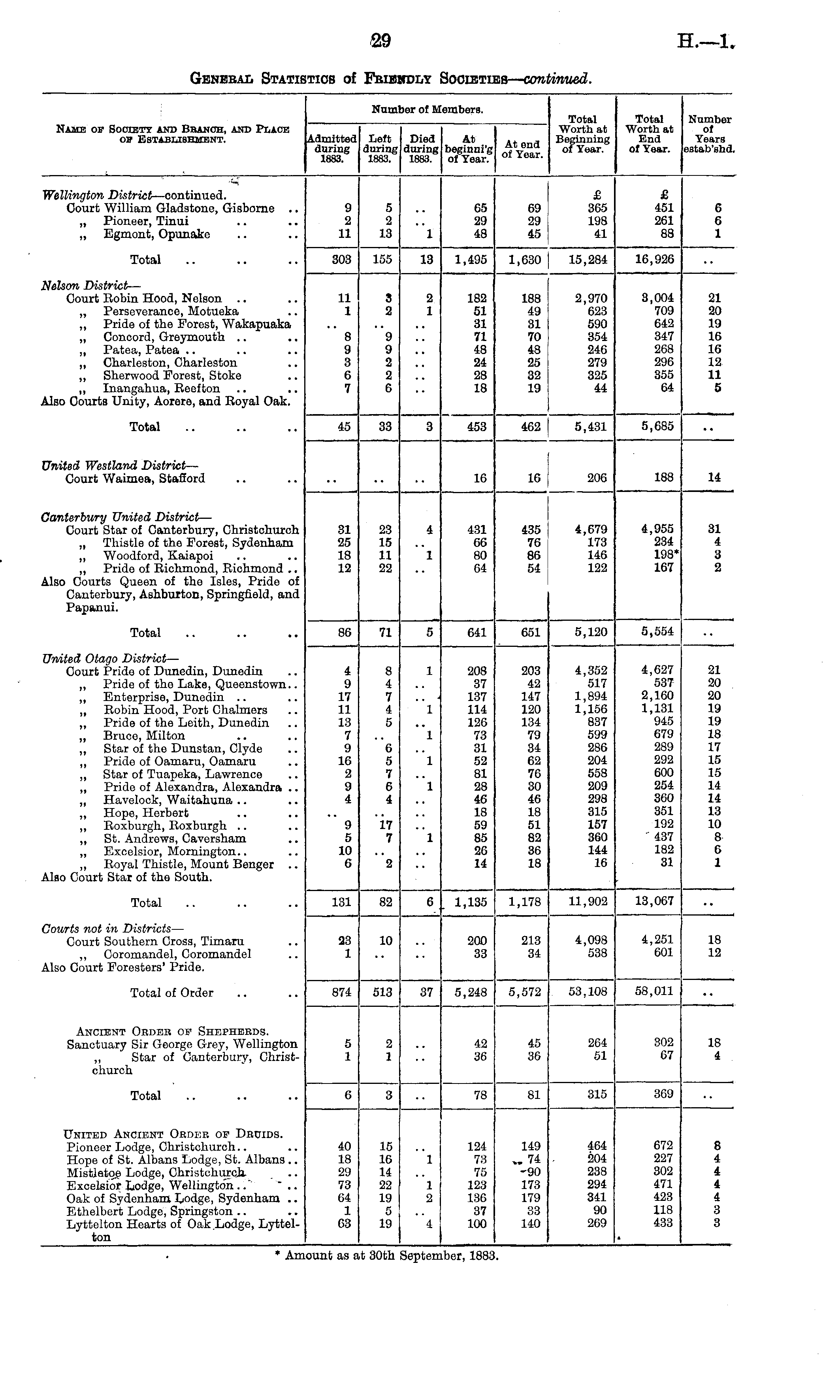 Numl lor of [embers. Name of Society and Bbanob, and Place of Establishment. idmitted during 1883. Left during 1883. Died during 1883. At beginni'g of Year. Worth at Beginning of Year. Total Total Worth at End of Year. Number of Years estab'shd. At end of Year. Wellington District —continued. Court William Gladstone, Gisborne .. „ Pioneer, Tinui „ Egmont, Opunake 9 2 11 5 2 13 65 29 48 69 29 45 £ 365 198 41 £ 451 261 88 6 6 1 1 Total 303 155 IB 1,495 1,630 15,284 16,926 Nelson District — Court Eobin Hood, Nelson .. „ Perseverance, Motueka ,, Pride of the Forest, Wakapuaka „ Concord, Greymouth .. „ Patea, Patea „ Charleston, Charleston „ Sherwood Forest, Stoke ,, Inangahua, Eeefton Also Courts Unity, Aorere, and Eoyal Oak. 11 1 8 9 3 6 7 3 2 9 9 2 2 6 2 1 182 51 31 71 48 24 28 18 188 49 31 70 48 25 32 19 2,970 623 590 354 246 279 325 44 3,004 709 642 347 268 296 355 64 21 20 19 16 16 12 11 5 Total 45 33 453 462 5,431 5,685 United Westland District — Court Waimea, Stafford 16 10 206 188 14 ■■ Canterbury United District — Court Star of Canterbury, Christchurch „ Thistle of the Forest, Sydenham „ Woodford, Kaiapoi „ Pride of Eiohmond, Bichmond .. Also Courts Queen of the Isles, Pride of Canterbury, Ashburton, Springfield, and Papanui. 31 25 18 12 23 15 11 22 4 1 431 66 80 64 435 76 86 54 4,679 173 146 122 4,955 234 198* 167 31 4 3 2 Total 86 71 641 651 5,120 5,554 United Otago District — Court Pride of Dunedin, Dunedin „ Pride of the Lake, Queenstown.. ,, Enterprise, Dunedin .. „ Eobin Hood, Port Chalmers „ Pride of the Leith, Dunedin „ Bruce, Milton „ Star of the Dunstan, Clyde „ Prido of Oamaru, Oamaru „ Star of Tuapeka, Lawrence „ Pride of Alexandra, Alexandra .. „ Havelock, Waitahuna .. „ Hope, Herbert „ Eoxburgh, Eoxburgh .. ,, St. Andrews, Caversham „ Excelsior, Mornington.. ,, Eoyal Thistle, Mount Benger .. Also Court Star of the South. 4 9 17 11 13 7 9 16 2 9 4 8 4 7 4 5 6 5 7 6 4 1 "l "l 1 208 37 137 114 126 73 31 52 81 28 46 18 59 85 26 14 203 42 147 120 134 79 34 62 76 30 46 18 51 82 36 18 4,352 517 1,894 1,156 837 599 286 204 558 209 298 315 157 360 144 16 4,627 537 2,160 1,131 945 679 289 292 600 254 360 351 192 437 182 31 21 20 20 19 19 18 17 15 15 14 14 13 10 8 6 1 1 9 5 10 6 17 7 1 "2 Total 131 82 6 1,135 1,178 11,902 13,067 Courts not in Districts — Court Southern Cross, Timaru ,, Coromandel, Coromandel Also Court Forestors' Pride. 23 1 10 200 33 213 34 4,098 538 4,251 601 18 12 Total of Order 874 513 37 5,248 5,572 53,108 58,011 Ancient Order of Shepherds. Sanctuary Sir George Grey, Wellington ,, Star of Canterbury, Christchurch 5 1 a i 42 36 45 36 264 51 302 67 18 4 Total 78 81 315 369 United Ancient Order of Druids. Pioneer Lodge, Christchurch.. Hope of St. Albans Lodge, St. Albans .. Mistletoe Lodge, Christchurch Excelsior Lodge, Wellington .. Oak of Sydenham Lodge, Sydenham .. Ethelbert Lodge, Springston Lyttelton Hearts of Oak Lodge, Lyttelton 40 18 29 73 64 1 63 15 16 14 22 19 5 1!) 1 1 2 124 73 75 123 136 37 100 149 .. 74 -90 173 179 33 140 464 204 238 294 341 90 269 672 227 302 471 423 118 433 8 4 4 4 4 3 8 "i * Amount as at 30th September, 1883.
