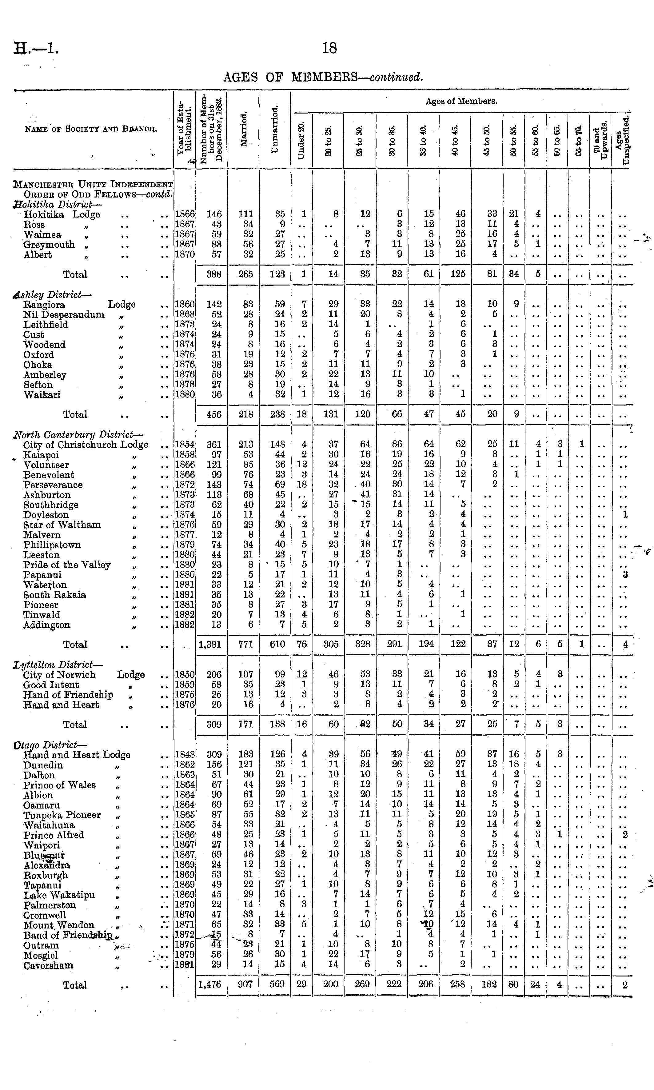 Name of Society and Branch. ■e 3 2g| .§£§ Ill id i V | a 1 a Q i 6 o i o i Agos of Members. s 9 s s 3 i 3 S 3 o 3 o 3 4 B as Manchbsteh Unity Independent Okdek of Odd Fellows— contd. Sokitika District — Hokitika Lodge Boss „ .. Waimea „ Greymouth „ Albert 1866 1867 1867 1867 1870 146 43 59 83 57 111 34 32 56 32 35 9 27 27 25 1 8 12 3 7 13 6 3 3 11 9 15 12 8 13 13 46 13 25 25 16 33 11 16 17 4 21 4 i 5 4 4 2 i Total 388 265 123 1 14 35 32 61 125 81 34 5 Ashley District — Bangiora Lodge Nil Desperandum „ Leithfield Oust Woodend Oxford Ohoka Amberley „ Sefton Waikari „ 1860 1868 1873 1874 1874 1876 1876 1876 1878 1880 142 52 24 24 24 31 38 58 27 36 83 28 8 9 8 19 23 28 8 4 59 24 16 15 16 12 15 30 19 32 7 2 2 2 2 29 11 14 5 6 7 11 22 14 12 33 20 1 6 4 7 11 13 9 16 22 8 4 2 4 9 11 3 3 14 4 1 2 3 7 2 10 1 3 18 2 6 6 6 3 3 10 5 1 3 1 9 'i 1 Total 456 218 238 18 131 120 66 47 45 20 9 North Canterbury District —■ City of Christohurch Lodgo Kaiapoi „ Volunteer „ Benevolent „ Perseverance „ Ashburton „ Southbridge „ Doyleston „ Star of Waltham Malvern „ Phillipstown „ Leeston „ Pride of tho Valley Papanui „ Waterton „ South ftakaia „ Pioneer „ Tinwald Addington „ 1854 1858 1866 1866 1872 1873 1873 1874 1876 1877 1879 1880 1880 1880 1881 1881 1881 1882 1882 361 97 121 99 143 113 62 15 59 12 74 44 23 22 33 35 35 20 13 213 53 85 76 74 68 40 11 29 8 34 21 8 5 12 13 8 7 6 148 44 36 23 69 45 22 4 30 4 40 23 15 17 21 22 27 13 7 4 2 12 3 18 2 2 1 5 7 5 1 2 37 30 24 14 32 27 15 3 18 2 23 9 10 11 12 13 17 6 2 64 16 22 24 40 41 15 2 17 4 18 13 7 4 10 11 9 8 3 86 19 25 24 30 31 14 3 14 2 17 5 1 3 5 4 5 1 2 64 16 22 18 14 14 11 2 4 2 8 7 62 9 10 12 7 5 4 4 1 3 3 25 3 4 3 2 11 1 4 1 1 3 1 1 1 i .. _ 3 4 6 1 1 3 4 5 "l 1 Total 1,381 771 610 76 305 328 291 194 122 37 12 5 1 4 ' Lyttelton District —■ City of Norwich Lodge Good Intent „ Hand of Friendship „ Hand and Heart „ 1850 1859 1875 1876 206 58 25 20 107 35 13 16 09 23 12 4 12 1 3 46 g 3 2 53 13 8 8 33 11 2 4 21 7 4 2 16 6 3 2 13 8 2 2 5 2 4 1 3 Total 309 171 16 | 60 82 50 34 27 25 7 3 138 5 Otago District — Hand and Heart Lodgo Dunedin „ Dalton „ Prince of Wales Albion „ Oamaru „ Tuapeka Pioneer „ ,. Waitahuna „ Prince Alfred „ Waipori „ Bluespur „ Alexandra „ Boxburgh „ Tapamii „ Lake Wakatipu „ Palmerston „ Cromwell „ Mount Wendon „ Band of Friendship „ Outram „ Mosgiel „ • .. Caversham „ I 1848 1862 1863 1864 1864 1864 1865 1866 1866 1867 1867 1869 1869 1869 1869 1870 1870 1871 1872 1875 1879 1881 309 156 51 67 90 69 87 54 48 27 69 24 53 49 45 22 47 65 15 44 56 29 183 121 30 44 61 52 55 88 25 13 46 12 31 22 29 14 33 32 8 "23 26 14 126 35 21 23 29 17 32 21 23 14 23 12 22 27 1G 8 14 33 7 21 30 15 4 1 1 1 2 2 i 2 39 11 10 8 '} 2 7 13 - 4 5 2 10 4 4 10 7 1 2 1 4 10 22 14 56 34 10 12 20 14 11 5 11 2 13 3 7 8 14 1 7 10 49 26 8 9 15 10 11 5 5 2 8 7 9 9 7 6 5 8 1 10 9 3 41 22 6 11 11 14 5 8 3 5 11 4 7 6 6 7 12 •10 4 8 5 59 27 11 8 13 14 20 12 8 6 10 2 12 6 5 4 15 12 4 7 1 2 37 13 4 9 13 5 19 14 5 5 12 2 10 8 4 16 18 2 7 4 3 5 4 4 4 3 5 4 2 1 1 2 3 1 2 1 3 1 2 1 3 1 2 3 5 6 14 1 4 i i 1 1 4 8 17 6 1 Total 1,476 907 5C9 29 200 269 222 206 258 182 80 24 4 2