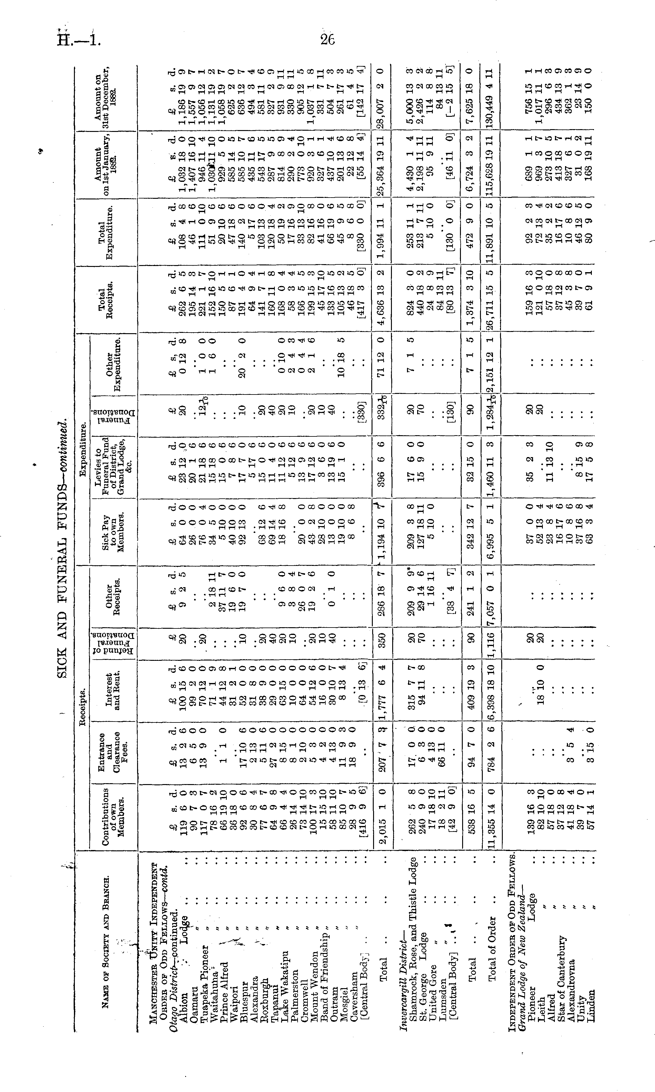 Name of Society axd Branch. Contributions of own Members. Entrance °s § and Interest ao'S Clearance and Bent. a a g Fees. irg o Eeceipts. Other Receipts. Sick Pay to own Members. Levies to Funoral Fund of District, Grand Lodge, &c. Expenditure. a a Other Expenditure. Total Eeceipts. Total Expenditure. Amount on 1st January, 18S2. Amount on 31st December, 1882. Manchester Unity Independent Obdeb of Odd Fellows — contd. Otago District—continued. Albion . Lodge Oamaru „ Tuapeka Pioneer „ Waitahulia „ Prince Alfred „ Waipori Bluespur „ Alexandra „ Boxburgh. ' „ Tapanui „ Lake Wakatipu , Palmerston Cromwell „ Mount Wendon Band of Friendship „ Outram „ Mosgiel Caversham [Central Body] £ s. d. 119 6 0 90 7 3 117 0 7 78 16 2 66 19 10 36 18 0 92 6 6 30 8 4 77 6 7 64 9 8 66 4 4 26 14 0 73 14 10 100 17 3 15 15 10 58 11 10 85 10 7 28 9 5 [416 9 6] £ s. a. 13 2 6 6 5 0 13 9 0 l"l 0 17 10 6 2 13 0 5 11 6 27 2 0 8 15 0 8 10 2 10 0 5 3 0 4 2 0 4 13 0 11 9 3 18 9 0 £ s. a. 100 15 6 99 2 0 70 12 0 71 1 9 44 12 8 31 2 1 52 0 0 31 8 0 38 9 0 29 0 0 63 15 0 10 0 0 64 0 0 54 12 6 16 0 0 30 10 7 8 13 4 20 20 io 20 40 20 10 £ s. a. 9 2 5 2 18 11 37 11 7 19 6 0 19 7 0 £ s. a. 64 0 0 26 0 0 76 0 4 34 5 0 5 10 0 40 10 0 92 13 0 68 12 0 69 14 4 18 16 8 £ s. d. 23 12 0 20 1 6 21 18 6 15 18 6 15 0 6 7 8 6 17 7 0 5 17 6 15 0 6 11 4 0 11 12 6 5 12 6 13 9 6 17 12 6 3 6 0 13 19 6 15 1 0 £ 20 'l2A io 20 40 20 10 £ s, a. 0 12 8 10 0 16 0 30*2 0 £ s. a. 262 6 5 195 14 3 221 1 7 152 16 10 150 5 1 87 6 1 191 4 0 64 9 4 141 7 1 160 11 8 168 0 4 58 3 4 166 5 5 199 15 3 45 17 10 133 16 5 105 13 2 46 18 5 [417 3 0] £ a. a. 108 4 8 4G 1 6 111 0 10 51 9 6 20 10 6 47 18 6 140 2 0 5 17 6 103 13 0 120 18 4 50 19 2 17 16 9 33 13 10 82 16 8 41 16 0 66 19 6 45 9 5 8 6 8 [330 0 0] £ b. a. 1,032 18 0 1,407 16 10 946 11 4 1,030 11 10 929 5 0 585 14 5 585 10 7 435 11 6 543 17 5 287 9 5 814 8 9 290 2 4 773 0 10 920 3 1 327 6 1 437 10 4 201 13 6 22 12 8 [55 14 4] £ s. a. 1,186 19 9 1,557 9 7 1,056 12 1 1,131 19 2 1,058 19 7 625 2 0 636 12 7 494 3 4 581 11 6 327 2 9 931 9 11 330 8 11 905 12 5 1,037 1 8 331 7 11 504 7 3 261 17 3 61 4 5 [142 17 4] 9 6 0 3 8 4 26 0 7 19 2 6 20 0 0 43 2 8 28 10 0 18 0 0 19 10 0 8 6 8 0 10 0 2 4 3 0 4 4 2 16 20 10 40 20 10 40 o"i o 10 18 5 [013 6] [330] Total .. 2,015 1 0 207 7 3 1,777 6 4 350 286 18 7 1,194 10 T 396 6 6 332-A 71 12 0 4,636 13 2 1,994 11 1 25,364 19 11 28,007 2 0 Invcrcargill District — Shamrock, Rose, and Thistle Lodge St. George Lodge United Goro Lumsden „ [Central Body] .. < J 262 5 8 240 9 0 17 18 10 18 2 11 [42 9 0" 17 0 0 6 3 0 4 13 0 66 11 0 315 7 7 94 11 8 20 70 209 9 9* 29 14 6 1 16 11 209 3 8 127 18 11 5 10 0 17 6 0 15 9 0 20 70 7 15 824 3 0 440 18 2 24 8 9 84 13 11 [80 13 7] 253 11 1 213 7 11 5 10 0 4,430 1 4 2,198 11 11 95 9 11 5,000 13 3 2,426 2 2 114 8 8 84 13 11 [-2 15 5] [33"4 7] [130] [130 0 0] [46 il 0] Total .. 538 16 5 94 7 0 409 19 3 241 1 2 342 12 7 32 15 0 90 7 15 1,374 3 10 472 9 0 6,724 3 2 7,625 18 0 Total of Order [11,355 14 0 784 2 6 16,398 18 10 1,116 7,057 0 1 6,995 5 1 1,460 11 3 1.284A !2,151 12 1 26,711 15 5 ill, 891 10 5 115,628 19 11 130,449 4 11 Independent Obdeb op Odd Fellows. Grand Lodge of New Zealand — Pioneer Lodge Leith Alfred Star of Canterbury „ Alexandrovna „ Unity Linden „ .. 139 16 3 82 10 10 57 18 0 37 12 8 41 18 4 39 7 0 57 14 1 18 10 0 20 20 37 0 0 52 13 4 23 8 4 16 17 6 10 8 6 37 16 8 63 3 4 35 2 3 11 13 10 20 20 159 16 3 121 0 10 57 18 0 37 12 8 45 3 8 39 7 0 61 9 1 92 2 3 72 13 4 35 2 2 16 17 6 10 8 6 46 12 5 80 9 0 689 1 1 969 3 7 273 10 5 413 18 7 327 6 1 31 0 2 168 19 11 756 15 1 1,017 11 1 296 6 3 434 13 9 362 1 3 23 14 9 150 0 0 3 5 4 8 15 9 17 5 8 315 0