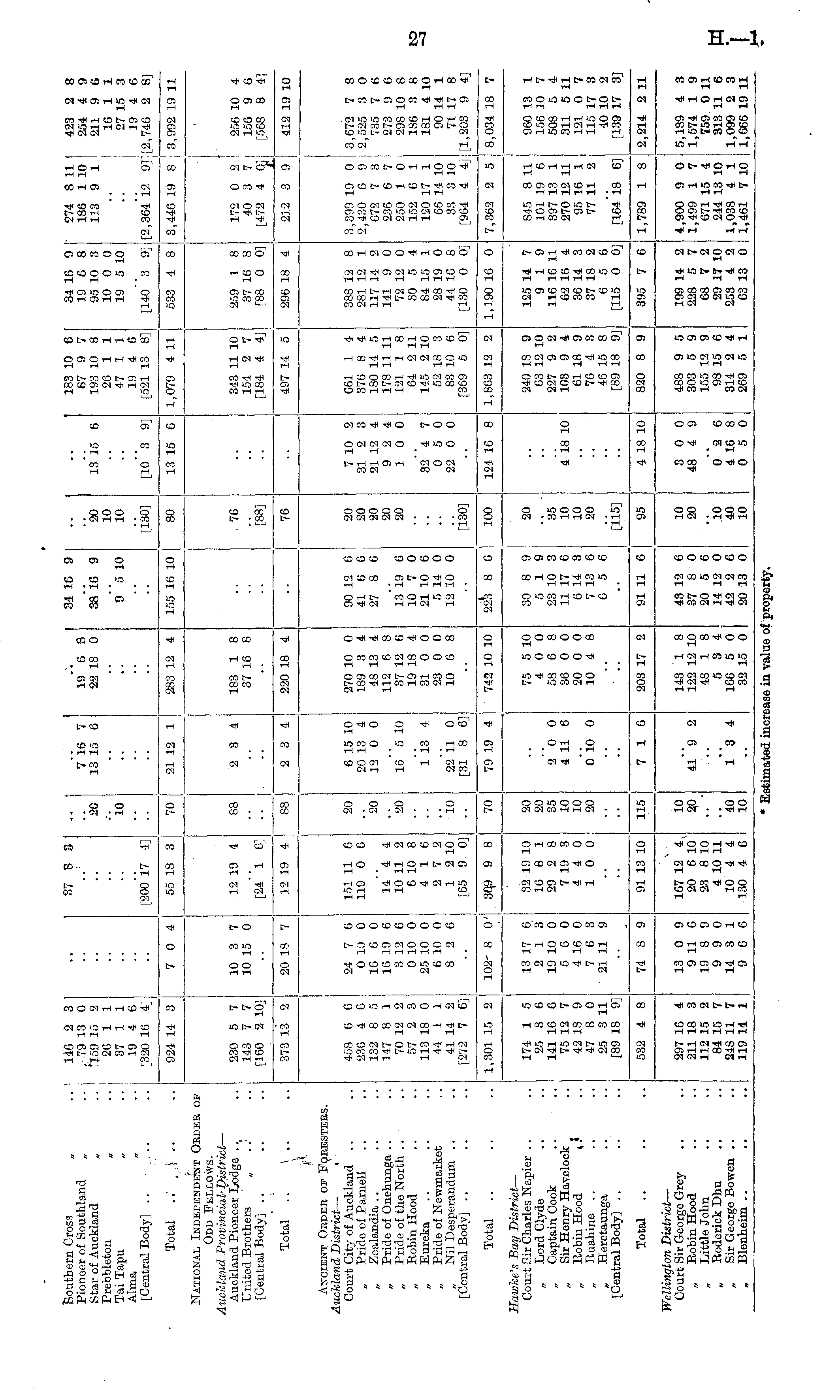 Southern Cross „ Pioneer of Southland Star of Auckland Prebbleton „ Tai Tapu Alma [Central Body] 146 2 3 79 13 0 159 15 2 26 1 1 37 1 1 19 4 6 [320 16 4] 37 8 3 *20 io 7*IS 7 13 15 6 19**6 8 22 18 0 34 16 9 38*i6 9 9 5 10 20 10 10 13 15 6 183 10 6 87 9 7 193 10 8 26 1 1 47 1 1 19 4 6 [521 13 8] 34 16 9 19 6 8 95 10 3 10 0 0 19 5 10 274 8 11 186 1 10 113 9 1 423 2 8 254 4 9 211 9 6 16 1 1 27 15 3 19 4 6 [3,746 2 8] [200 17 4] [130] [10**3 9] [140**3 9] [2,364 12 9] Total ..' ■• .. National Independent Order of Odd Fellows. Auckland Provincial District — Auckland Pioneer Lodge United Brothers „ > ,\ [Central Body] .. 924 14 3 230 5 7 143 7 7 [160 2 10] 7 0 4 10 3 7 10 15 0 12 19 4 55 18 3 70 21 12 1 283 12 4 155 16 10 80 13 15 6 1,079 4 11 533 4 8 j 172 0 2 • 256 10 4 40 3 7 ! 156 9 6 [472 4 OJ | [568 8 4! 212 3 9 j 412 19 10 3,446 19 8 3,992 19 11 88 2 3 4 183 1 8 37 16 8 76 343 11 10 154 2 7 [184 4 4] 259 1 8 37 16 8 [88 0 0] [24**1 o; '[88] •■ Total .. Ancient Order of Foresters. Auckland District — Court City of Auckland „ Pride of Parnell „ Zealandia .. „ Pride of Onehunga .. „ Pride of the North .. ■ „ Eobin Hood „ Eureka „ Pride of Newmarket Nil Desperandum [Central Body] .. 373 13* 2 20 18 7 12 19 4 88 2 3 4 220 18 4 70 497 14 5 296 18 4 ! 3,399 19 0 3,672 7 8 2,430 6 9 2,525 3 0 672 7 3 735 7 6 236 6 7 273 9 0 250 1 0 298 10 B 152 6 1 186 3 8 120 17 1 181 4 10 66 14 10 90 14 1 33 3 10 71 17 8 [964 4 4] [1,203 9 4] 458 6 0 236 4 6 132 8 5 147 8 1 70 12 2 57 2 3 113 18 0 44 1 1 41 14 2 [272 7 6] 24 7 6 0 10 0 16 6 0 10 19 6 3 12 6 0 10 0 25 10 0 6 10 0 8 2 6 151 11 6 119 0 6 14 4 4 10 11 2 6 10 8 4 10 2 7 2 1 2 10 [65 9 0] 20 20 20 6 15 10 20 13 4 12 0 0 16 5 10 270 10 0 189 3 4 48 13 4 112 6 8 37 12 6 19 18 4 31 0 0 23 0 0 10 6 8 90 12 6 41 6 6 27 8 6 13 19 6 10 7 0 21 10 6 5 14 0 12 10 0 20 20 20 20 20 7 10 2 31 2 3 21 12 4 9 2 4 10 0 661 1 4 376 8 4 180 14 5 178 11 11 121 1 8 04 2 11 145 2 10 52 18 3 83 10 6 [369 5 0] 388 12 8 281 12 1 117 14 2 141 9 0 72 12 0 30 5 4 84 15 1 28 19 0 44 16 8 [130 0 0" 113 4 32 4 7 0 5 0 22 0 0 10 22 11 0 [31 8 6] [130] Total .. 1,301 15 2 102- 8 0 309 9 8 70 79 19 4 742 10 10 223 8 6 100 124 16 8 1,863 12 2 1,190 10 0 7,362 2 5 8,034 18 7 Hawke's Bay District — Court Sir Charles Napier .. „ Lord Clyde „ Captain Cook Sir Henry Havelock . „ Bobin Hood (." „ Buahine .. „ Heretaunga [Central Body] 174 1 5 25 3 6 141 16 6 75 12 7 42 18 9 47 8 0 25 3 11 T89 18 9] 13 17 6 2 13 19 10 0 5 0 0 4 16 0 7 6 3 21 11 9 32 19 10 16 8 1 29 2 8 7 19 3 4 4 0 10 0 20 20 35 10 10 20 2 "o 0 4 11 6 75 5 10 4 0 0 58 6 8 36 0 0 20 0 0 10 4 8 30 8 9 5 19 23 10 3 11 17 6 6 14 3 7 13 6 0 5 6 20 35 10 10 20 4 18 10 240 18 9 63 12 10 227 9 2 103 9 4 61 18 9 76 4 3 46 15 8 [89 18 9] 125 14 7 9 19 116 16 11 62 16 4 36 14 3 37 18 2 6 5 6 [115 0 0] 845 8 11 101 19 6 397 13 1 270 12 11 95 16 1 77 11 2 960 13 1 156 10 7 508 5 4 311 5 11 121 0 7 115 17 3 40 10 2 [139 17 3] 0 10 0 [ii5] [164 18 6] Total .. 532 4 8 74 8 9 91 13 10 115 7 16 203 17 2 91 11 6 95 4 18 10 820 8 9 395 7 6 1,789 1 8 2,214 2 11 Wellington District — Court Sir George Grey „ Bobin Hood Little John „ Boderick Dhu Sir George Bowen .. „ Blenheim 297 16 4 211 18 3 112 15 2 84 15 7 248 11 7 119 14 1 13 0 9 9 11 6 19 8 9 9 9 0 14 3 1 9 6 6 167 12 4 20 6 10 23 8 10 4 10 11 10 4 4 130 4 6 10 20 41**9 2 143 1 8 122 12 10 48 1 8 5 3 4 166 5 0 32 15 0 43 12 6 37 8 0 20 5 6 14 12 0 42 2 6 20 13 0 10 20 3 0 0 48 4 9 488 9 5 303 5 9 155 12 9 98 15 6 314 2 4 269 5 1 199 14 2 228 5 7 68 7 2 29 17 10 253 4 2 63 13 0 4,900 9 0 1,499 1 7 671 15 4 244 13 10 1,038 4 1 1,461 7 10 5,189 4 3 1,574 1 9 759 0 11 313 11 6 1,099 2 3 1,666 19 11 *40 10 l'*3 4 10 40 10 0 2 6 4 16 8 0 5 0 * Estimated increase in value of property.