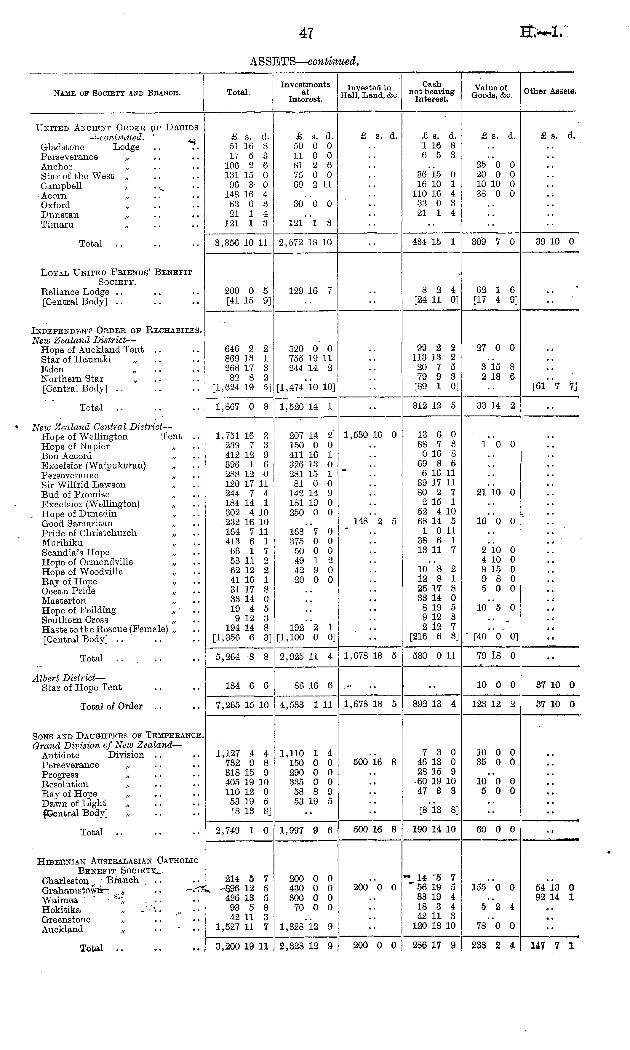 Name of Society and Beanch. Total. Investments at Interest. Invested in Hall, Land, &c. Cash not bearing Interest. Value of Goods, &o. Other Assets. United Ancient Obdeb of Druids —continued. Gladstone Lodge Perseverance „ Anchor „ Star of the West „ Campbell ,, . • Acorn „ Oxford Dunstan „ Timaru „ £ s. d. 51 16 8 17 5 3 106 2 G 131 15 0 9G 3 0 148 16 4 63 0 3 21 1 4 121 1 3 £ s. d. 50 0 0 11 0 0 81 2 6 75 0 0 69 2 11 £ s. d. £ s. a. 1 16 8 G 5 3 3G 15 0 16 10 1 110 16 4 33 0 3 21 1 4 £ s. d. 25 0 0 20 0 0 10 10 0 38 0 0 £ s. d. 30 0 0 121 1 3 Total 3,356 10 11 2,572 18 10 434 15 1 309 7 0 39 10 0 Loyal United Fbiends' Benefit Society. Eeliance Lodge [Central Body] 8 2 4 [24 11 0] 02 1 6 [17 4 9] 200 0 5 [41 15 9] 129 16 7 Independent Order of Bechabites. New Zealand District — Hope of Auckland Tent Star of Hauraki „ Eden Northern Star „ [Central Body] 646 2 2 8G9 13 1 268 17 3 82 8 2 [1,624 19 5] 520 0 0 755 19 11 244 14 2 99 2 2 113 13 2 20 7 5 79 9 8 [89 1 0] 27 0 0 8*16 8 2 18 6 [1,474 10 10] [Gl'> 7] Total 1,867 0 8 1,520 14 1 312 12 5 33 14 2 New Zealand Central District — Hope of Wellington Tent .. Hope of Napier „ Bon Accord „ Excelsior (Waipukurau) „ Perseverance „ Sir Wilfrid Lawson „ Bud of Promise Excelsior (Wellington) , Hope of Dunedin „ Good Samaritan „ Pride of Christehurch Murihiku „ ; • Scandia's Hope „ Hope of Ormondvillc „ Hope of Woodville „ Ray of Hope „ Ocean Pride Masterton „ Hope of Feilding Southern Cross „ Haste to the Rescue (Female) „ [Central Body] 1,751 16 2 239 7 3 412 12 9 39G 1 G 288 12 0 120 17 11 244 7 4 184 14 1 302 4 10 232 16 10 164 7 11 413 6 1 66 1 7 53 11 2 62 12 2 41 16 1 31 17 8 33 14 0 19 4 5 9 12 3 194 14 8 [1,356 6 3] 207 14 2 150 0 0 411 10 1 326 13 0 281 15 1 81 0 0 142 14 9 181 19 0 250 0 0 163 7 0 875 0 0 50 0 0 49 1 2 42 9 0 20 0 0 1,530 16 0 148"2 5 13 0 0 88 7 3 0 16 8 69 8 6 6 16 11 39 17 11 80 2 7 2 15 1 52 4 10 63 14 5 1 0 11 38 6 1 13 11 7 i"o o ai'io o ig"o o 10 8 2 12 8 1 26 17 8 33 14 0 8 19 5 9 12 3 2 12 7 [216 6 3] 2 10 0 4 10 0 9 15 0 9 8 0 5 0 0 10"5 0 . . 192 2 1 [1,100 0 0] [40 "o 0] Total 5,264 8 8 2,925 11 4 1,678 18 5 580 0 11 79 18 0 Albert District — Star of Hope Tent 134 6 6 86 16 6 10 0 0 37 10 0 Total of Order 7,265 15 10 4,533 1 11 1,678 18 5 892 13 4 123 12 2 37 10 0 Sons and Daughters of Temperance. Grand Division of New^ Zealand — Antidote 'Division .. Perseverance „ Progress „ Resolution „ Ray of Hope „ Dawn of Light „ [Central Body] 1,127 4 4 732 9 8 318 15 9 405 19 10 110 12 0 53 19 5 [8 13 8] 1,110 1 4 150 0 0 290 0 0 335 0 0 58 8 9 53 19 5 500'16 8 7 3 0 46 13 0 28 15 9 60 19 10 47 3 3 10 0 0 35 0 0 10**0 0 5 0 0 ro 1 O Ql Total .. 2,749 1 0 1,997 9 6 500 16 8 . 190 14 10 60 0 0 Hibernian Australasian Catholic Benefit Society., Charleston Branch Grahamstown „ Waimea „ . ■ • Hokitika „ .'-".. Greenstone Auckland „ 214 5 7 89G 12 5 426 13 5 93 5 8 42 11 3 1,527 11 7 200 0 0 430 0 0 300 0 0 70 0 0 200 0 0 " 14 5 7 " 56 19 5 33 19 4 18 3 4 42 11 3 120 18 10 186*0 0 5413 0 92 14 1 5 2 4 I,328"i2 9 re"o o Total .. 3,200 19 11 2,328 12 9 200 0 0 286 17 9 238 2 4 147 7 1