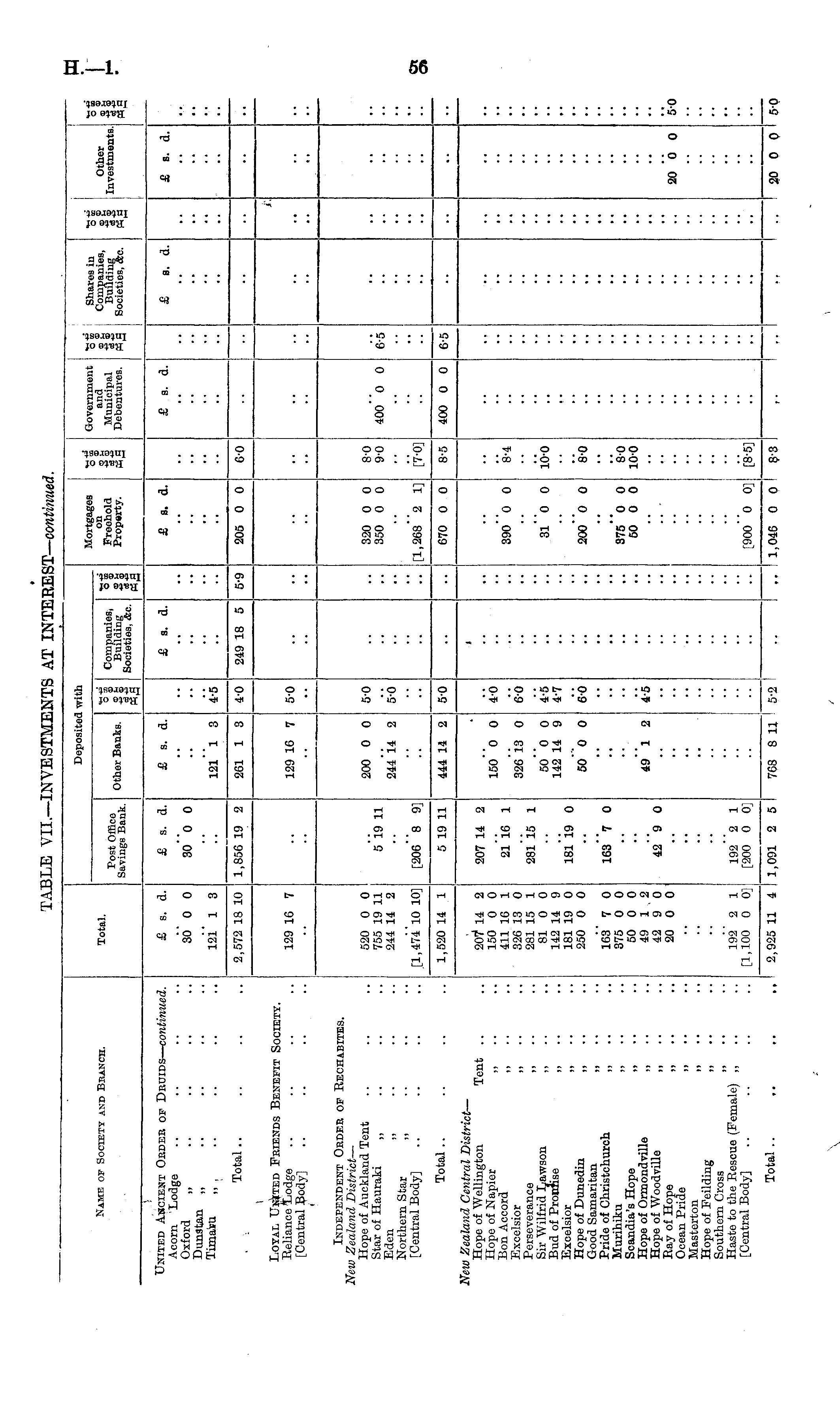 Deposits! with Name or Society and Eeancb. Total. - 9 is Companies, Building Societies, &c. - - Mortgages on Freehold Property. O to "5 © Government and Municipal Debentures. Si Shares in Companies, Building Societies, &c. •t-l+3 Other Investments. If i x 9 Post Office Savings Bank. Other Banks. United Ancient Obdeb of Dbuids — continued. Acorn Lodge Oxford „ Dunstan ,, Timaru „ . £ s. d. 30* 0 0 £ s. d. 30**0 0 £ s. d. £ s. a. £ s. a. £ s. d. £ s. d. £ s. d. - - 121* 1 3 - 121*1 3 4*5 - - Total 2,572 18 10 1,856 19 2 261 1 3 4-0 249 18 5 5-9 205 0 0 60 - Loyal United Fbiends Benefit Society. Beliance Lodge [Central Body] 129 16 7 129 16 7 50 •• •• Independent Obdeb of Bechabites. Jew Zealand District — Hope of Auckland Tent Star of Hauraki ,, Eden „ Northern Star ,, [Central Body] 520 0 0 755 19 11 244 14 2 5*19 11 200 0 0 244*14 2 5-0 5*6 320 0 0 350 0 0 8-0 9-0 400* 0 0 C*5 •• [1,474*10 10] [206**8 9] [1,268**2 1] [7-0] •• •• Total .. 1,520 14 1 5 19 11 444 14 2 5-0 670 0 0 8-5 400 0 0 05 •• .. Tew Zealand Central District — Hope of Wellington Tent Hope of Napier ,, Bon Accord ,, Excelsior ,, Perseverance ,, Sir Wilfrid Lawson ,, Bud of Promise ,, Excelsior „ Hope of Dunedin ,, Good Samaritan ,, Pride of Christchurch ,, Murihiku „ Scandia's Hope „ Hope of Ormondville ,, Hope of Woodville ,, Bay of Hope ,, Ocean Pride „ Masterton ,, Hope of Feilding ,, Southern Cross ,, Haste to the Bescue (Female) ,, [Central Body] .. 207 14 2 150 0 0 411 16 1 326 13 0 281 15 1 81 0 0 142 14 9 181 19 0 250 0 0 163 7 0 375 0 0 50 0 0 49 1 2 42 9 0 20 0 0 207 14 2 2116 1 281 15 1 181 19 0 163**7 0 150 "o 0 326* 13 0 50 "o 0 142 14 9 50* 0 0 4-6 60 4*-5 4-7 6-6 390**0 0 31**0 0 20o"o 0 875*'o 0 50 0 0 8*4 i'o'o 8*0 80 100 - - •• •• •• - •• ■• " - - " •• 42**9 0 49 "l 2 4*5 •• •• i 20 0 0 5i •• 1 192* 2 1 [1,100 0 0] 2,925 11 4 192 2 1 [200 0 01 [900 "o 0] [8*5] - - Total 1,091 2 5 768 8 11 20 0 0 I 5-2 1,046 0 0 S-3 ! ., I 5-1 f • t t