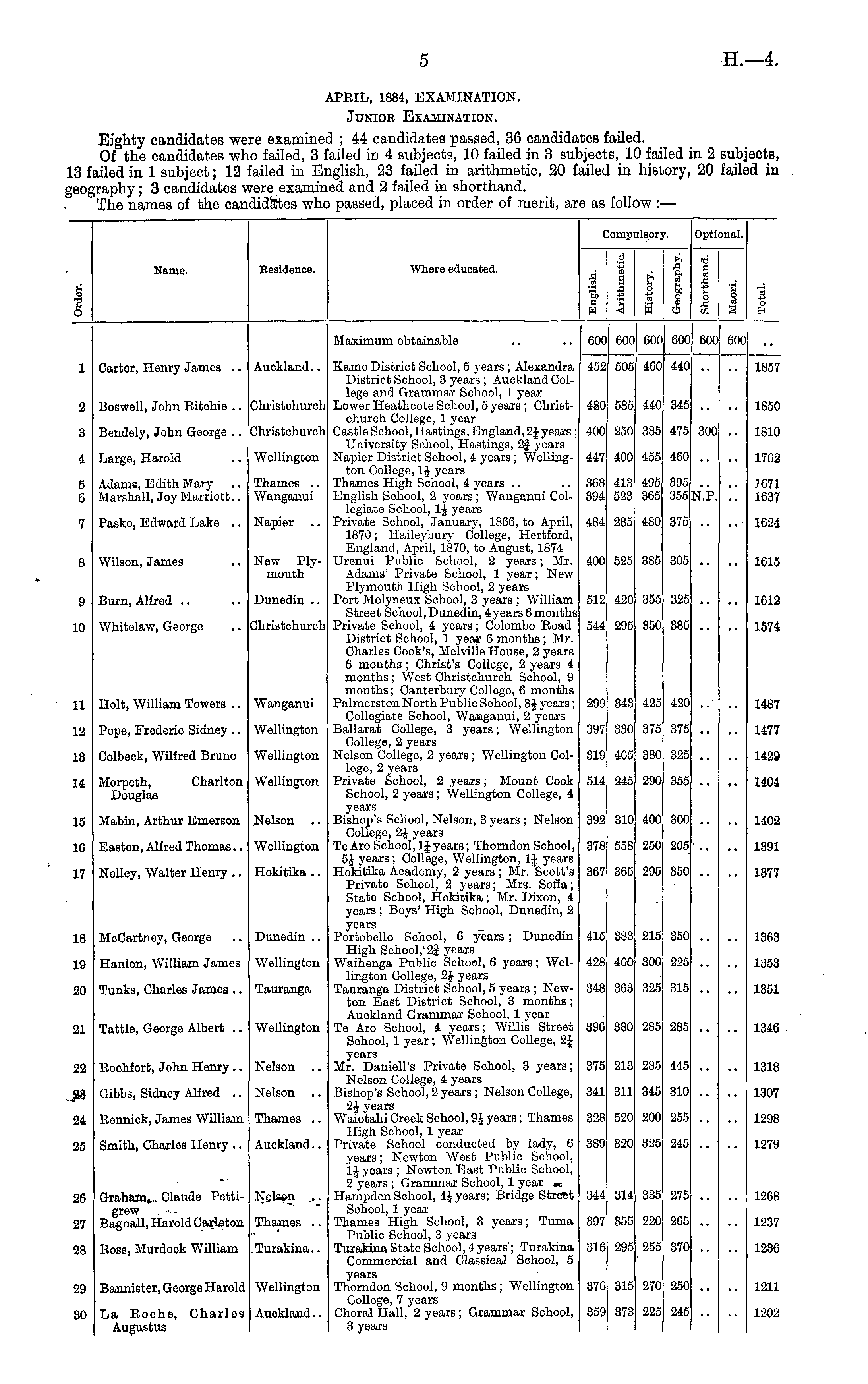 APRIL, 1884, EXAMINATION. Junioe Examination. Eighty candidates were examined ; 44 candidates passed, 36 candidates failed. Of the candidates who failed, 3 failed in 4 subjects, 10 failed in 3 subjects, 10 failed in 2 subjects, 13 failed in 1 subject; 12 failed in English, 23 failed in arithmetic, 20 failed in history, 20 failed in geography; 3 candidates were examined and 2 failed in shorthand. The names of the candidates who passed, placed in order of merit, are as follow :—