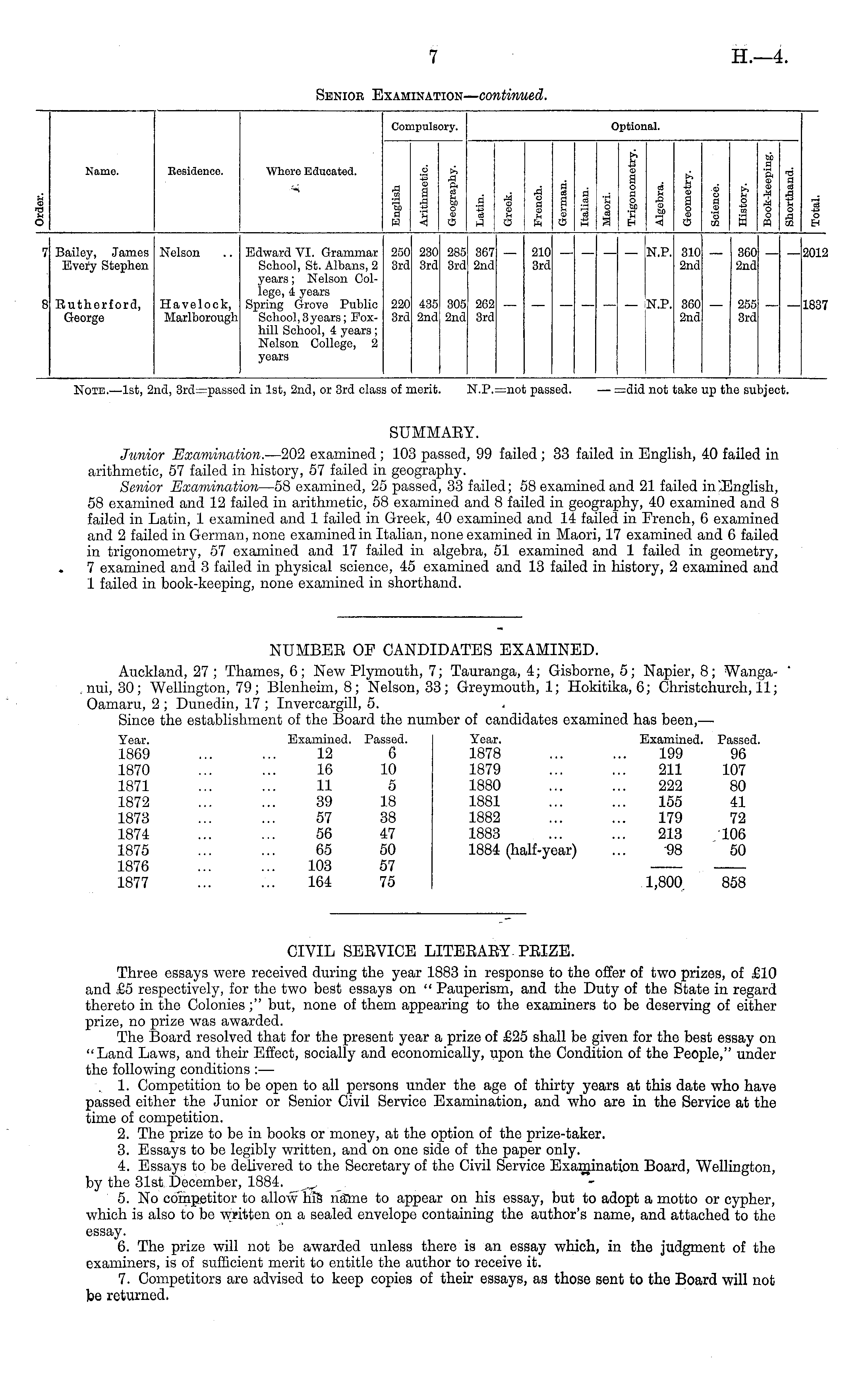 CIVIL SEEVICE LITEEAEY PEIZE. Three essays were received during the year 1883 in response to the offer of two prizes, of £10 and £5 respectively, for the two best essays on " Pauperism, and the Duty of the State in regard thereto in the Colonies;" but, none of them appearing to the examiners to be deserving of either prize, no prize was awarded. The Board resolved that for the present year a prize of £25 shall be given for the best essay on "Land Laws, and their Effect, socially and economically, upon the Condition of the People," under the following conditions : — 1. Competition to be open to all persons under the age of thirty years at this date who have passed either the Junior or Senior Civil Service Examination, and who are in the Service at the time of competition. 2. The prize to be in books or money, at the option of the prize-taker. 3. Essays to be legibly written, and on one side of the paper only. 4. Essays to be delivered to the Secretary of the Civil Service Examination Board, Wellington, by the 31st December, 1884. 5. No competitor to allow his name to appear on his essay, but to adopt a motto or cypher, which is also to be written on a sealed envelope containing the author's name, and attached to the essay. 6. The prize will not be awarded unless there is an essay which, in the judgment of the examiners, is of sufficient merit to entitle the author to receive it. 7. Competitors are advised to keep copies of their essays, as those sent to the Board will not be returned.