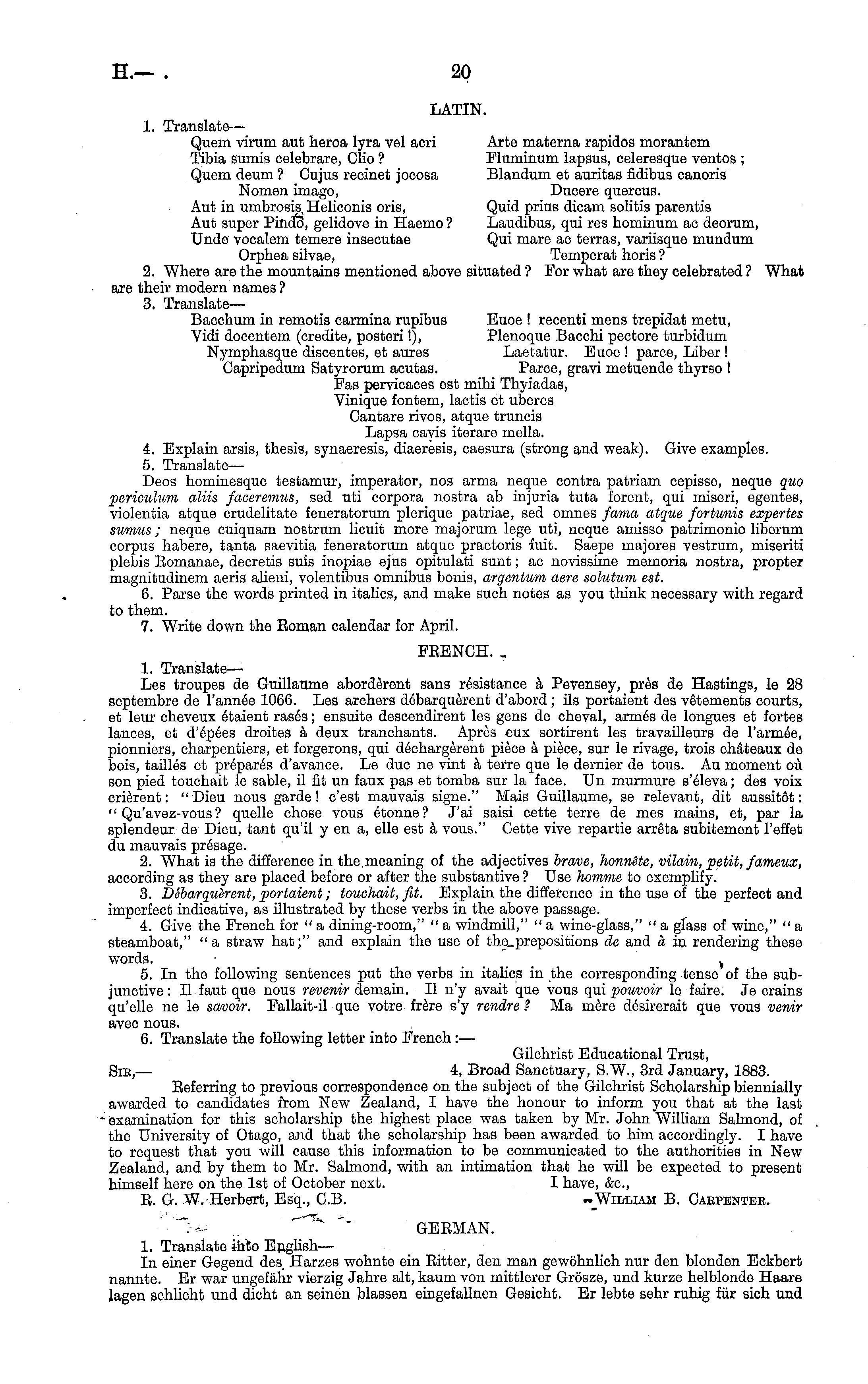 LATIN. 1. Translate — Quern virum aut heroa lyra vel aeri Arte materna rapidos morantem Tibia sumis celebrare, Clio ? Fluminum lapsus, celeresque ventos ; Quern deum ? Cujus recinet jocosa Blandum et auritas fidibus canoris Nomen imago, Ducere quercus. Aut in umbrosis Heliconis oris, Quid prius dicam solitis parentis Aut super Pindo, gelidove in Haemo ? Laudibus, gui res hominum ac deorum, Unde vocalem temere insecutae Qui mare ac terras, variisque mundum Orphea silvae, Temperat horis ? 2. Where are the mountains mentioned above situated ? For what are they celebrated ? What are their modern names ? 3. Translate— Bacchum in remotis carmina rupibus Euoe ! recenti mens trepidat metu, Vidi doeentem (credite, posteri!), Plenoque Bacchi pectore turbidum Nymphasque discentes, et aures Laetatur. Euoe ! parce, Liber! Capripedum Satyrorum acutas. Parce, gravi metuende thyrso ! Fas pervicaces est mihi Thyiadas, Vinique fontem, lactis et überes Cantare rivos, atque truncis Lapsa cayis iterare mella. 4. Explain arsis, thesis, synaeresis, diaeresis, caesura (strong and weak). Give examples. 5. Translate— Deos hominesque testamur, imperator, nos anna neque contra patriam cepisse, neque quo periculum aliis faceremus, sed uti corpora nostra ab injuria tuta forent, gui miseri, egentes, violentia atque crudelitate feneratorum plerique patriae, sed omnes fama atque fortunis expertes sumus; neque cuiquam nostrum licuit more majorum lege uti, neque amisso patrimonio liberum corpus habere, tanta saevitia feneratorum atque praetoris fuit. Saepe majores vestrum, miseriti plebis Eomanae, decretis suis inopiae ejus opitulati sunt; ac novissime memoria nostra, propter magnitudinem aeris alieni, volentibus omnibus bonis, argentum acre solutum est. 6. Parse the words printed in italics, and make such notes as you think necessary with regard to them. 7. Write down the Soman calendar for April. FEENCH. , 1. Translate— Les troupes de Guillaumo aborderent sans resistance k Pevensey, pres de Hastings, le 28 septembre de l'annee 1066. Les archers debarquorent d'abord ; ils portaiont dcs vetements courts, et leur cheveux etaient ras6s; ensuite descendirent les gens de cheval, armes de longues et fortes lances, et d'epees droites k deux tranchants. Apres eux sortirent les travailleurs de l'armee, pionniers, charpentiers, et forgerons, gui dechargerent piece k piece, sur le rivage, trois chateaux de bois, tailles et prdpards d'avance. Le due ne vint k terre que le dernier de tous. Au moment oii son pied touchait le sable, il fit un faux pas et tomba sur la face. Un murmure s'eleva; dcs voix crierent: " Dieu nous garde! c'est mauvais signe." Mais Guillaume, se relevant, dit aussitot: " Qu'avez-vous? quelle chose vous 6tonne? J'ai saisi cette terre de mes mains, et, par la splendeur de Dieu, tant qu'il yen a, elle est k vous." Cette vive repartie arreta subitement l'effet dv mauvais presage. 2. What is the difference in the meaning of the adjectives brave, honnete, vilain, petit, fameux, according as they are placed before or after the substantive ? Use homme to exemplify. 3. Debarquerent, portaient; touchait, fit. Explain the difference in the use of the perfect and imperfect indicative, as illustrated by these verbs in the above passage. 4. Give the French for " a dining-room," " a windmill," " a wine-glass," " a glass of wine," " a steamboat," "a straw hat;" and explain the use of the_prepositions de and a in rendering these words. ■ t 5. In the following sentences put the verbs in italics in the corresponding tense of the subjunctive :II faut que nous revenir demain. II ny avait que vous gui pouvoir le faire. Je crams qu'elle ne le savoir. Fallait-il que votre frere s'y rend/re ? Ma mere desirerait que vous venir avec nous. 6. Translate the following letter into French :— Gilchrist Educational Trust, Sic, — 4, Broad Sanctuary, S.W., 3rd January, 1883. Eeferring to previous correspondence on the subject of the Gilchrist Scholarship biennially awarded to candidates from New Zealand, I have the honour to inform you that at the last examination for this scholarship the highest place was taken by Mr. John William Salmond, of the University of Otago, and that the scholarship has been awarded to him accordingly. I have to request that you will cause this information to be communicated to the authorities in New Zealand, and by them to Mr. Salmond, with an intimation that he will be expected to present himself here on the Ist of October next. I have, &c, E. G. W. Herbert, Esq., C.B. ■ William B. Caepentee. GEEMAN. 1. Translate into English— In einer Gegend dcs Harzes wohnte em Eitter, den man gewohnlich nur den blonden Eckbert nannte. Er war ungefiihr vierzig Jahre alt, kaum yon mittlerer Grosze, und kurze helblonde Haare lagen schlicht und dicht an semen blassen eingefallnen Gesicht. Er lebte sehr ruhig fur sich und