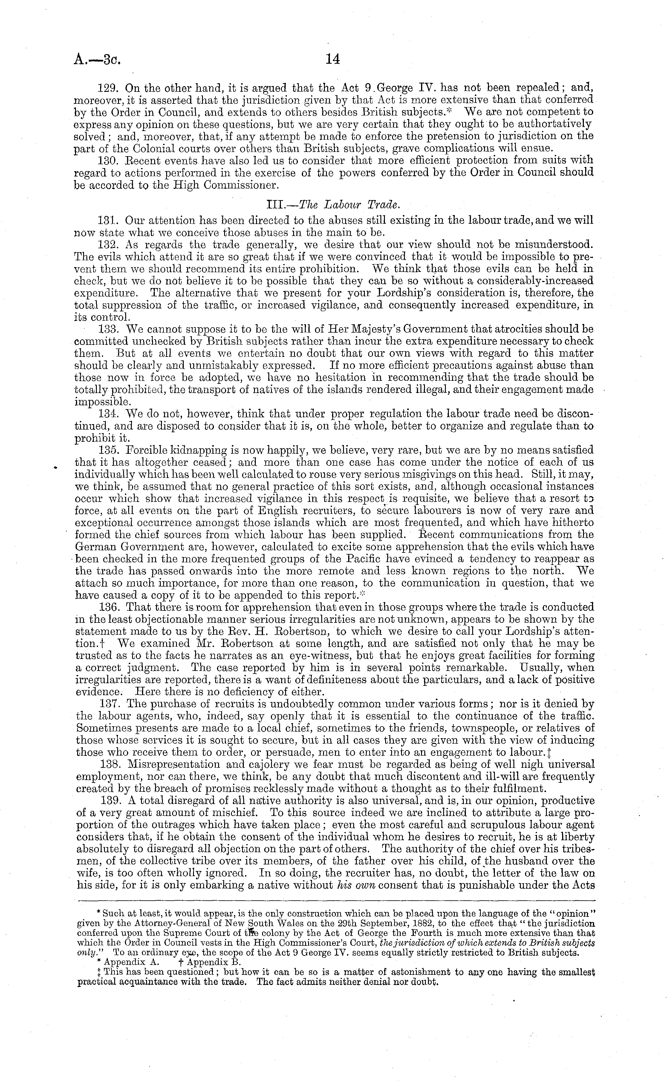 129. On the other hand, it is argued that the Act 9 George IV. has not been repealed; and, moreover, it is asserted that the jurisdiction given by that Act is more extensive than that conferred by the Order in Council, and extends to others besides British subjects.* We are not competent to express any opinion on these questions, but we are very certain that they ought to be authortatively solved ; and, moreover, that, if any attempt be made to enforce the pretension to jurisdiction on the part of the Colonial courts over others than British subjects, grave complications will ensue. 130. Eecent events have also led us to consider that more efficient protection from suits with regard to actions performed in the exercise of the powers conferred by the Order in Council should be accorded to the High Commissioner. ILL—The Labour Trade. 131. Our attention has been directed to the abuses still existing in the labour trade, and we will now state what we conceive those abuses in the main to be. 132. As regards the trade generally, we desire that our view should not be misunderstood. The evils which attend it are so great that if we were convinced that it would be impossible to prevent them we should recommend its entire prohibition. We think that those evils can be held in check, but we do not believe it to be possible that they can be so without a considerably-increased expenditure. The alternative that we present for your Lordship's consideration is, therefore, the total suppression of the traffic, or increased vigilance, and consequently increased expenditure, in its control. 133. We cannot suppose it to be the will of Her Majesty's Government that atrocities should be committed unchecked by British subjects rather than incur the extra expenditure necessary to check them. But at all events we entertain no doubt that our own views with regard to this matter should be clearly and unmistakably expressed. If no more efficient precautions against abuse than those now in force be adopted, we have no hesitation in recommending that the trade should be totally prohibited, the transport of natives of the islands rendered illegal, and their engagement made impossible. 134. We do not, however, think that under proper regulation the labour trade need be discontinued, and are disposed to consider that it is, on the whole, better to organize and regulate than to prohibit it. 135. Forcible kidnapping is now happily, we believe, very rare, but we are by no means satisfied that it has altogether ceased.; and more than one case has come under the notice of each of us individually which has been well calculated to rouse very serious misgivings on this head. Still, it may, we think, be assumed that no general practice of this sort exists, and, although occasional instances occur which show that increased vigilance in this respect is requisite, we believe that a resort t3 force, at all events on the part of English recruiters, to secure labourers is now of very rare and exceptional occurrence amongst those islands which are most frequented, and which have hitherto formed the chief sources from which labour has been supplied. Eecent communications from the German Government are, however, calculated to excite some apprehension that the evils which have been checked in the more frequented groups of the Pacific have evinced a tendency to reappear as the trade has passed onwards into the more remote and less known regions to the north. We attach so much importance, for more than one reason, to the communication in question, that we have caused a copy of it to be appended to this report.* 136. That there is room for apprehension that even in those groups where the trade is conducted m the least objectionable manner serious irregularities are not unknown, appears to be shown by the statement made to us by the Eev. H. Eobertson, to which we desire to call your Lordship's attention.! We examined Mr. Eobertson at some length, and are satisfied not only that he may be trusted as to the facts he narrates as an eye-witness, but that he enjoys great facilities for forming a correct judgment. The case reported by him is in several points remarkable. Usually, when irregularities are reported, there is a want of definiteness about the particulars, and a lack of positive evidence. Here there is no deficiency of either. 137. The purchase of recruits is undoubtedly common under various forms; nor is it denied by the labour agents, who, indeed, say openly that it is essential to. the continuance of the traffic. Sometimes presents are made to a local chief, sometimes to the friends, townspeople, or relatives of those whose services it is sought to secure, but in all eases they are given with the view of inducing those who receive them to order, or persuade, men to enter into an engagement to labour. { 138. Misrepresentation and cajolery we fear must be regarded as being of well nigh universal employment, nor can there, we think, be any doubt that much discontent and ill-will are frequently created by the breach of promises recklessly made without a thought as to their fulfilment. 139. A total disregard of all native authority is also universal, and is, in our opinion, productive of a very great amount of mischief. To this source indeed wo are inclined to attribute a large proportion of the outrages which have taken place; even the most careful and scrupulous labour agent considers that, if he obtain the consent of the individual whom he desires to recruit, he is at liberty absolutely to disregard all objection on the part of others. The authority of the chief over his tribesmen, of the collective tribe over its members, of the father over his child, of the husband over the wife, is too often wholly ignored. In so doing, the recruiter has, no doubt, the letter of the law on his side, for it is only embarking a native without his own consent that is punishable under the Acts
