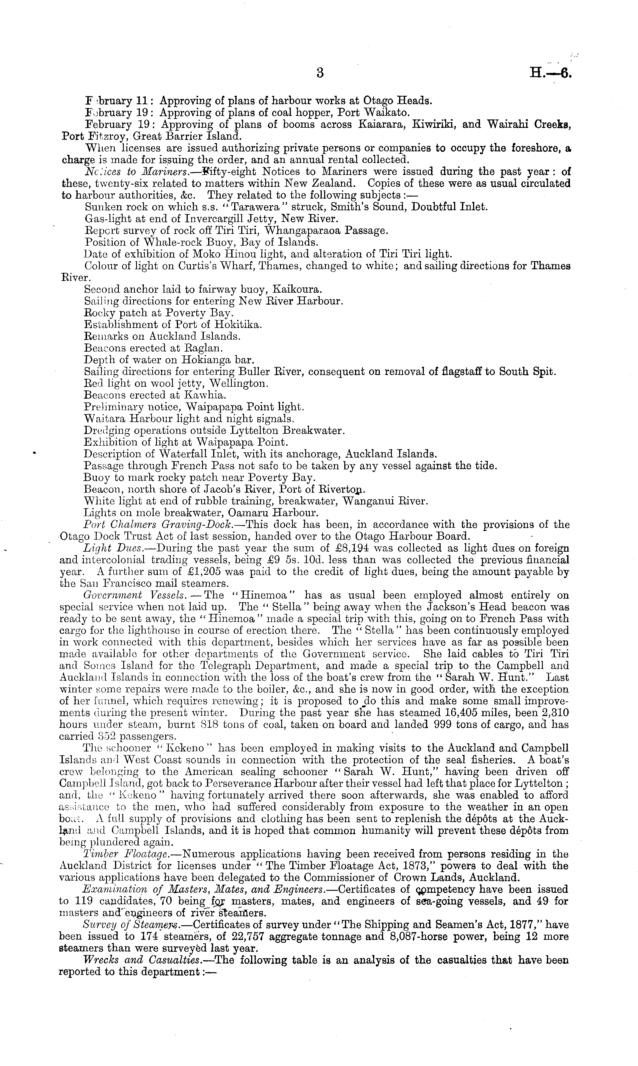F bruary 11: Approving of plans of harbour works at Otago Heads. February 19 : Approving of plans of coal hopper, Port Waikato. February 19: Approving of plans of booms across Kaiarara, Kiwiriki, and "Wairahi Creeks, Port Fitzroy, Great Barrier Island. When licenses are issued authorizing private persons or companies to occupy the foreshore, a charge is made for issuing the order, and an annual rental collected. Nciices to Mariners. —Fifty-eight Notices to Mariners were issued during the past year: of these, twenty-six related to matters within New Zealand. Copies of these were as usual circulated to harbour authorities, &c. They related to the following subjects : — Sunken rock on which s.s. " Tarawera " struck, Smith's Sound, Doubtful Inlet. Gas-light at end of Invercargill Jetty, New Eiver. Report survey of rock off Tiri Tiri, Whangaparaoa Passage. Position of Whale-rock Buoy, Bay of Islands. Date of exhibition of Moko Hinou light, and alteration of Tiri Tiri light. Colour of light on Curtis's Wharf, Thames, changed to white; and sailing directions for Thames Eiver. Second anchor laid to fairway buoy, Kaikoura. Sailing directions for entering New Eiver Harbour. Rocky patch at Poverty Bay. Establishment of Port of Hokitika. Remarks on Auckland Islands. Beacons erected at Raglan. Depth of water on Hokianga bar. Sailing directions for entering Buller Eiver, consequent on removal of flagstaff to South Spit. Eed light on wool jetty, Wellington. Beacons erected at Kawhia. Preliminary notice, Waipapapa Point light. Waitara Harbour light and night signals. Dredging operations outside Lyttelton Breakwater. Exhibition of light at Waipapapa Point. Description of Waterfall Inlet, with its anchorage, Auckland Islands. Passage through French Pass not safe to be taken by any vessel against the tide. Buoy to mark rocky patch near Poverty Bay. Beacon, north shore of Jacob's Eiver, Port of Eivertoja. White light at end of rubble training, breakwater, Wanganui Eiver. Lights on mole breakwater, Oamaru Harbour. Port Chalmers Graving-Dock. —This dock has been, in accordance with the provisions of the Otago Dock Trust Act of last session, handed over to the Otago Harbour Board. Light Dues. —During the past year the sum of £8,194 was collected as light dues on foreign and intercolonial trading vessels, being £9 ss. lOd. less than was collected the previous financial year. A further sum of £1,205 was paid to the credit of light dues, being the amount payable by the San Francisco mail steamers. Government Vessels. —The "Hinemoa" has as usual been employed almost entirely on special service when not laid up. The " Stella" being away when the Jackson's Head beacon was ready to be sent away, the " Hinemoa " made a special trip with this, going on to French Pass with cargo for the lighthouse in-course of erection there. The " Stella " has been continuously employed in work connected with this department, besides which her services have as far as possible been made available for other departments of the Government service. She laid cables to Tiri Tiri and Somes Island for the Telegraph Department, and made a special trip to the Campbell and Auckland Islands in connection with the loss of the boat's crew from the " Sarah W. Hunt." Last ■winter some repairs were made to the boiler, &c, and she is now in good order, with the exception of her funnel, which requires renewing; it is proposed to _do this and make some small improvements during the present winter. During the past year she has steamed 16,405 miles, been 2,310 hours under steam, burnt 818 tons of coal, taken on board and landed 999 tons of cargo, and has carried 352 passengers. The schooner " Kekeno " has been employed in making visits to the Auckland and Campbell Islands and West Coast sounds in connection with the protection of the seal fisheries. A boat's crew belonging to the American sealing schooner " Sarah W. Hunt," having been driven off Campbell Island, got back to Perseverance Harbour after their vessel had left that place for Lyttelton; and, the " Kekeno " having fortunately arrived there soon afterwards, she was enabled to afford assistance to the men, who had suffered considerably from exposure to the weather in an open b0,.:. A full supply of provisions and clothing has been sent to replenish the depots at the Auck■iftßu and Campbell Islands, and it is hoped that common humanity will prevent these depots from being plundered again. Timber Floatage. —Numerous applications having been received from persons residing in the Auckland District for licenses under "The Timber Floatage Act, 1873," powers to deal with the various applications have been delegated to the Commissioner of Crown Lands, Auckland. Examination of Masters, Mates, and Engineers. —Certificates of competency have been issued to 119 candidates, 70 being for masters, mates, and engineers of sea-going vessels, and 49 for masters and engineers of river steamers. Survey of Steamers.— Certificates of survey under "The Shipping and Seamen's Act, 1877," have been issued to 174 steamers, of 22,757 aggregate tonnage and 8,087-horse power, being 12 more steamers than were surveyed last year. Wrecks and Casualties. —The following table is an analysis of the casualties that have been reported to this department:—