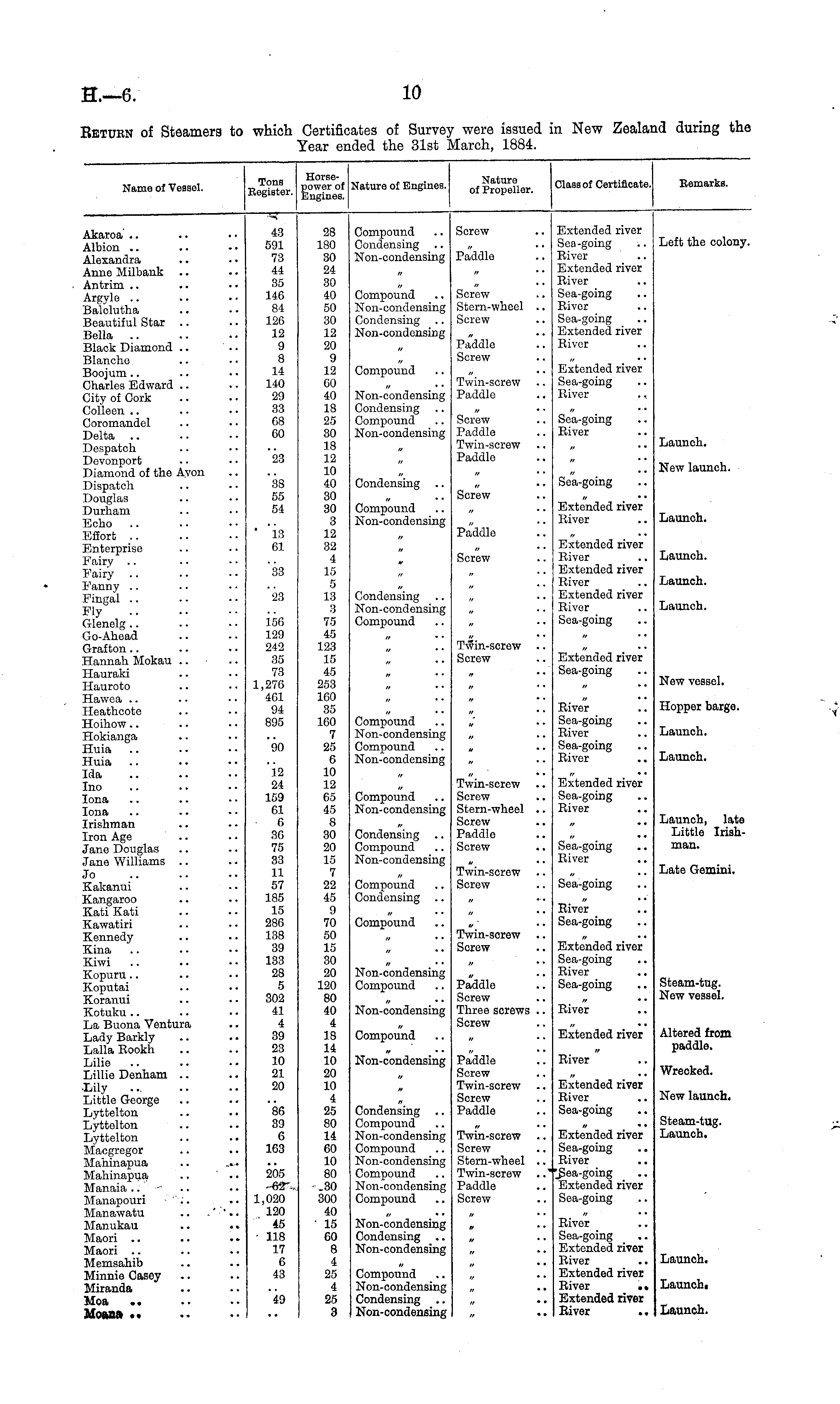 Return of Steamers to which Certificates of Survey were issued in New Zealand during the Year ended the 31st March, 1884.