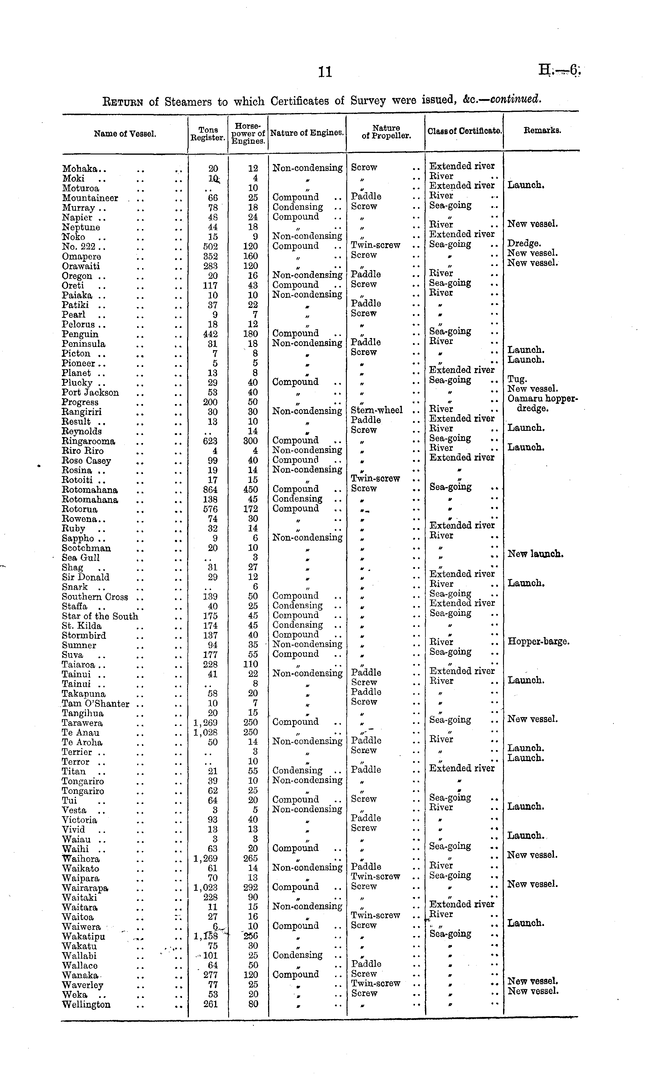 Name of Vessel. Tons Eegister. Horsopowor of Engines. Nature of EngineE. Nature of Propeller. Class of Certificate. Remarks. Mohaka.. Moki Moturoa Mountaineer . .. Murray Napier Neptune Noko No. 222 .. Omapero Orawaiti Oregon Oreti Paiaka Patiki Pearl Pelorus Penguin Peninsula Picton Pioneer Planet .. Plucky .. Port Jackson Progress Eangiriri Eesult .. Reynolds Bingarooma Biro Eiro Eose Casey Eosina Eotoiti Eotomahana Eotomahana Eotorua Eowena.. Euby Sappho Scotchman Sea Gull Shag Sir Donald Snark Southern Cross .. Staffa Star of the South St. Kilda Stormbird Sumner Suva Taiaroa Tainui Tainui .. Takapuna Tarn O'Shanter .. Tangihua Tarawera Te Anau Te Aroha Terrier 20 10 12 4 10 25 18 24 18 9 120 160 120 16 43 10 22 7 12 180 18 8 5 8 40 40 50 30 10 14 300 4 40 14 15 450 45 172 30 14 6 10 3 27 12 6 50 25 45 45 40 35 55 110 22 8 20 7 15 250 250 14 3 10 55 10 25 20 5 40 13 3 20 265 14 13 292 90 15 16 10 25G 30 25 50 120 25 20 80 Non-condensing Screw Extended river Eiver Extended river Eiver Sea-going 66 78 48 44 15 502 352 283 20 117 10 37 9 18 442 31 7 5 13 29 53 200 30 13 Compound Condensing Compound Paddle !! Screw Launch. Eiver Extended river Sea-going New vessel. Non-condensing Compound Twin-screw Screw Dredge. New vessel. New vessel. Non-condensing Compound Non-condensing Paddle Screw Eiver Sea-going Eiver Paddle Screw Compound Non-condensing Paddle Screw •r • • Sea-going Eiver Launoh. Launch. ■ V • • * • * Extended river Sea-going Compound «• • * Tug. New vessel. Oamaru hopperdredge. Non-condensing Stern-wheel .. Paddle Screw Eiver Extended river Eiver Sea-going Eiver Extended river Launch. 623 4 99 19 17 864 138 576 74 32 9 20 V Compound Non-condensing Compound Non-condensing Launch. Compound Condensing Compound Twin-screw Screw Sea-going W • • * • • New launch. Non-condensing Extended river River u • • *31 29 // • ■ 139 40 175 174 137 94 177 228 41 Compound Condensing .. Compound Condensing Compound Non-condensing Compound Extended river Eiver Sea-going Extended river Sea-going Launch. Eiver Sea-going Hopper-barge. 58 10 20 1,269 1,028 50 Non-condensing Paddle Screw Paddle Screw Extended river Eiver Launch. H V tf Compound */ • ' Sea-going New vessel. Non-condensing Paddle Screw Eiver Launch. Launch. Terror Titan Tongariro Tongariro Tui Vesta Victoria Vivid Waiau Waihi Waihora Waikato Waipara Wairarapa Waitaki Waitara Waitoa , mc_. Waiwera Wakatipu Wakatu Wallabi Wallace Wanaka Waverley Weka Wellington 21 39 62 64 3 93 13 3 63 1,269 61 70 1,023 228 11 27 0 1,158 75 •101 64 277 77 53 261 Condensing Non-condensing Compound Non-condensing n Compound Non-condensing Compound Paddle Screw Paddle Screw * • • Paddlo '.'. Twin-scrow Screw Extended river u m Sea-going Eiver * * • v • • Sea-going Eiver Sea-going Launch. Launch. New vessel. New vessel. Non-condensing Twin-screw Screw Extended river Eiver Launch. Compound Sea-going Condensing » • * u * • Compound Paddle Screw Twin-screw Screw New vessel. New vessel. m • *