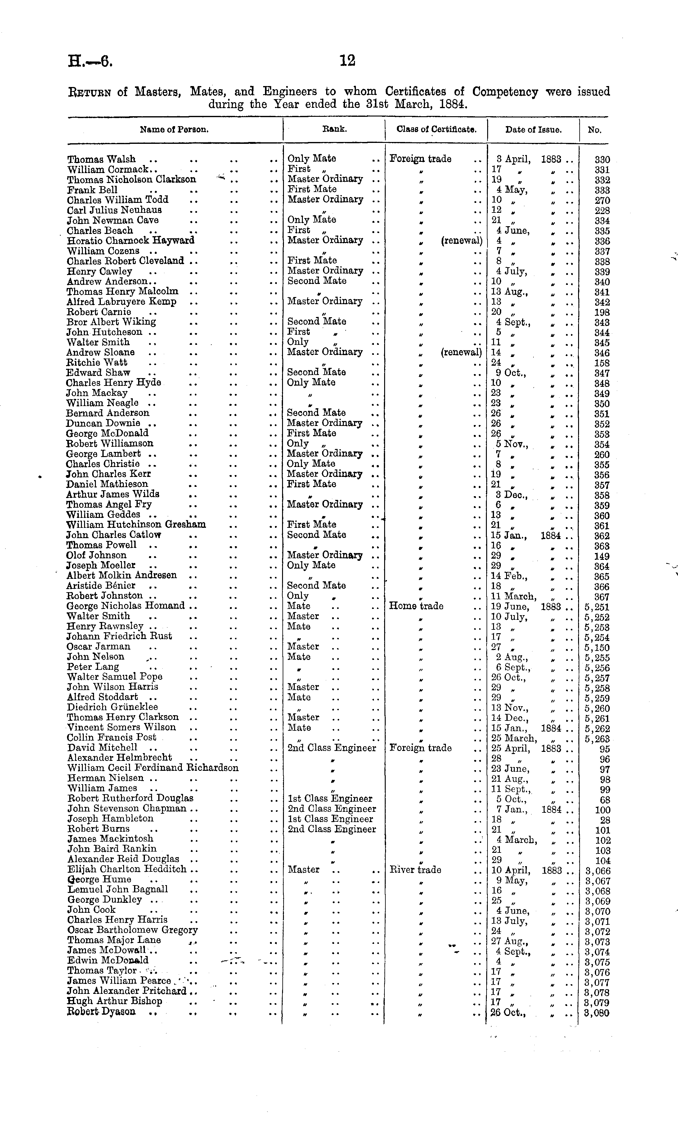 Name of Person. Bunk. Claaa of Certificate. Date of Issue. No. Thomas Walsh William Cormack.. Thomas Nicholson Clarkson Frank Bell Charles William Todd Carl Julius Nouhaus John Newman Cave Charles Beach Horatio Chamock Hayward William Cozens Charles Robert Cleveland Henry Cawley Andrew Anderson.. Thomas Henry Malcolm Alfred Labruyere Kemp Robert Carnie Bror Albert Wiking John Hutcheson Walter Smith .. ... Andrew Sloane Ritchie Watt Edward Shaw Charles Henry Hyde John Mackay William Neagle Bernard Anderson Duncan Downie George McDonald Robert Williamson George Lambert Charles Christie John Charles Kerr Daniel Mathieson Arthur James Wilds Thomas Angel Fry William Geddes William Hutchinson Gresham John Charles Catlow Thomas Powell Olof Johnson Joseph Moeller Albert Molkin Andresen Aristide Benier Robert Johnston George Nicholas Homand Walter Smith Henry Rawnsley Johann Friedrich Rust Oscar Jarman John Nelson Peter Lang Walter Samuel Pope John Wilson Harris Alfred Stoddart Diedrich Griineklee Thomas Henry Clarkson Vincent Somers Wilson Collin Francis Post David Mitchell Alexander Helmbrecht William Cecil Ferdinand Richardson Herman Nielsen William James Robert Rutherford Douglas John Stevenson Chapman Joseph Hambloton Robert Burns James Mackintosh John Baird Rankin Alexander Reid Douglas Fjlijah Charlton Hedditch George Hume Lemuel John Bagnall George Dunkley John Cook Charles Henry Harris Oscar Bartholomew Gregory Thomas Major Lane James McDowall Edwin McDonald Thomas Taylor James William Pearce ■ ■.. John Alexander Pritchard Hugh Arthur Bishop Robert Dyason ., ., ., Only Mate First „ Master Ordinary .. First Mate Master Ordinary .. Only Mate First „ Master Ordinary .. First Mate Master Ordinary .. Second Mate * * • Master Ordinary .. Second Mate First Only Master Ordinary .. Second Mate Only Mate Second Mate Master Ordinary .. First Mate Only „ Master Ordinary .. Only Mate Master Ordinary .. First Mate * ■ • Master Ordinary .. First Mate Second Mate Master Ordinary .. Only Mate Second Mate Only Mate Master Mate Foreign trade # • • # * • * * • „ (renewal) >/ • ■ m • • * • • (renewal) n • • n • • it • ■ u • • * II * ■ * * • • t, • • m • • m • • # • ■ w • • 3 April, 1883 .. if . „ .. 19 „ . .. 4 May, , .. 10 , „ .. 21 „ „ .. 4 June, , .. 1 . 7 . „ .. 8 „ „ .. 4 July, , .. 10 „ „ .. 13 Aug., „ .. 13 . „ .. 20 „ „ .. 4 Sept., „ .. 5 „ „ .. H . „ .. 14 . , .. 24 , . ., 9 Oct., „ .. 10 . . .. 23 , „ .. 23 „ ,'„ 26 , , .. 26 » „ .. 26 „ , .. 5 Not 7 . . '.. 8 . 19 , . .. 21 . . „ 3 Dec, , .. 6 . is . „•.. 21 „ „ .. 15 Jan., 1884 .. 16 . „ .. 29 . , „ 29 „ , .. 14 Feb., , .. 18 „ , ... 11 March, , .. 19 June, 1883 .. 10 July, „ .. 13 „ , .. 17 27 I '„'.'. 2 Aug., , .. 6 Sept., „ .. 20 Oct., „ .. 29 „ „ .. 29 13 Nov., "„ '.'. 14 Dec, „ .. 15 Jan., 1884 .. 25 March, „ .. 25 April, 1883 .. 28 „ , .. 23 June, „ .. 21 Aug., „ .. 11 Sept 5 Oct., , .. 7 Jan., 1884 .. 18 „ , ,, 21 , „ .. 4 March, „ 21 » „ .. 29 „ „ .. 10 April, 1883 .. 9 May, „ .. 16 „ , .. 25 „ „ .. 4 June, „ 13 July, , .. 24 „ , .. 27Aug 4 Sept 4 „ „ .. 17 . „ .. 17 17 , „ .. 17 , , .. 26 Oct 330 331 332 333 270 228 334 335 336 337 338 339 340 341 342 198 343 344 345 346 158 347 348 349 350 351 352 353 354 260 355 356 357 358 359 360 361 362 363 149 364 365 366 367 5,251 5,252 5,253 5,254 5,150 5,255 5,256 5,257 5,258 5,259 5,260 5,261 5,262 5,263 95 96 97 98 99 G8 100 28 101 102 103 104 3,066 3,067 3,068 3,069 3,070 3,071 3,072 3,073 3,074 3,075 3,076 3,077 3,078 3,079 3,080 Home trade u • » # • • tt .. .. Master Mate „ • • ■ ■ Master Mate Master Mate 2nd Class Engineer tf • • Foreign trade tr 1st Class Engineer 2nd Class Engineer 1st Class Engineer 2nd Class Engineer 0 • • * • • V Master 1/ • • River trade a • • » •« • M