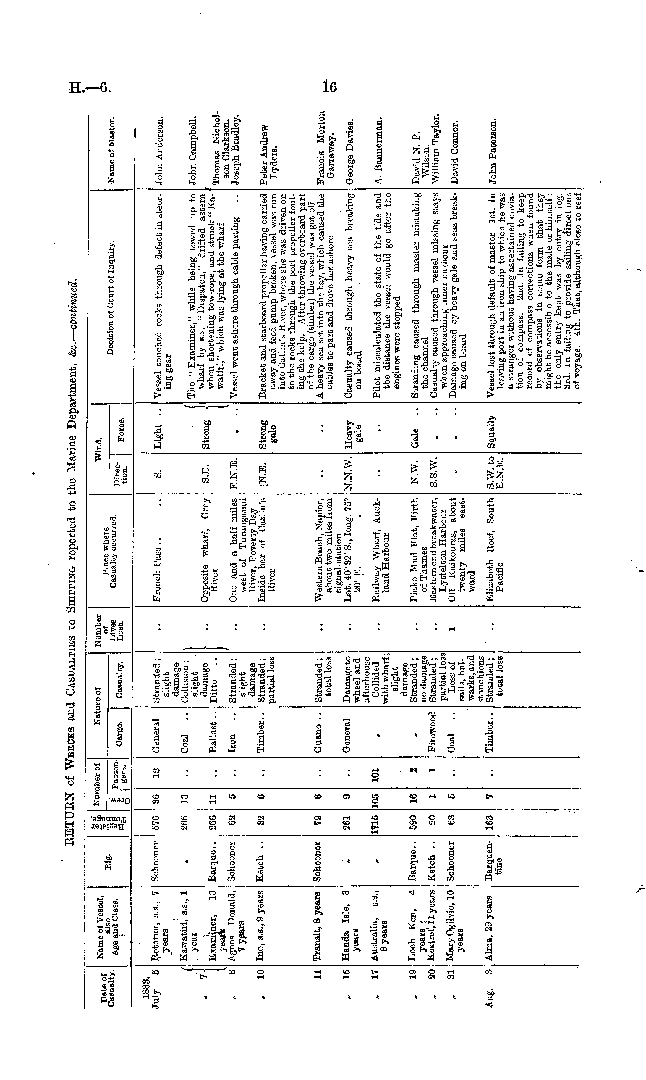 Date of Casualty. Name of Vessel, also Age and Class. is o TO S II Number of | jPassenQ I gers. Cargo. Nature of Casualty. Number of laves Lost. Place where Casualty occurred. Win Direction. Wind. nd. Force. Decision of Court of Inquiry. Name of Master. 1883. July 5 Eotorua, S.S., 7 years Schooner 576 3G IS General Stranded; slight damage Collision; slight damage Ditto .. French Pass S. Light .. Vessel touched rocks through defect in steering gear John Anderson. 78 Kawatiri, s.s., 1 year 286 13 Coal .. Opposite wharf, Grey Eiver Strong ■ The " Examiner," while being towed up to wharf by s.s. "Dispatch," drifted astern when shortening tow-rope, and struck "Kawatiri," which was lying at the wharf Vessel went ashore through cable parting John Campbell. Examiner, 13 years Agnes Donald, 7 years Barque.. 266 11 Ballast.. S.E. Thomas Nicholson Clarkson. Joseph Bradley. Schooner 62 5 Iron Stranded; slight damage Stranded; partial loss One and a half miles west of Turanganui Eiver, Poverty Bay Inside bar of Catlin's Eiver E.N.E. . 10 Ino, s.s.,9 years Ketch .. 32 Timber.. •N.E. Strong gale Bracket and starboard propeller having carried away and feed pump broken, vessel was run into Catlin's Eiver, where she was driven on to the rocks through the port propeller fouling the kelp. After throwing overboard part of the cargo (timber) the vessel was got off A heavy sea set into the bay, which caused the cables to part and drove her ashore Peter Andrew Lyders. Transit, 8 years Stranded; total loss Western Beach, Napier, about two miles from signal-station Lat. 40°32'S.,long. 75° 20' E. Francis Morton Garraway. 11 Schooner 73 Guano .. 15 Handa Isle, 3 years 261 General Damage to wheel and afterhouse Collided with wharf; slight damage Stranded; no damage Stranded ; partial loss Loss of sails, bulwarks, and stanchions Stranded; total loss N.N.W. Heavy gale Casualty caused through heavy sea breaking on board George Davies. * 17 Australia, s.s., 8 years m 1715 101 Railway Wharf, Auckland Harbour Pilot miscalculated the state of the tide and the distance the vessel would go after the engines were stopped A. Bannerman. 105 K u 19 Loch Ken, 4 years Kestrel, 11 years Barque.. » Piako Mud Flat, Firth of Thames Eastern end breakwater, Lyttelton Harbour Off Kaikouras, about twenty miles eastward N.W. Gale .. Stranding caused through master mistaking the channel Casualty caused through vessel missing stays when approaching inner harbour Damage caused by heavy gale and seas breaking on board David N. P. Wilson. William Taylor. 590 16 2 20 Ketch .. 20 1 1 Firewood S.S.W. 31 MaryOgilvie, 10 years Schooner 68 5 Coal .. 1 David Connor. Aug. 3 Alma, 29 years Barquentine Timber.. Elizabeth Beef, South Pacific S.W. to E.N.E. Squally Vessel lost through default of master —1st. In leaving port in an iron ship to which he was a stranger without having ascertained deviation of compass. 2nd. In failing to keep record of compass corrections when found by observations in some form that they might be accessible to the mate or himself : the only entry kept was by entry in log. 3rd. In failing to provide sailing directions of voyage. 4th. That, although close to reef John Pateraon. 163