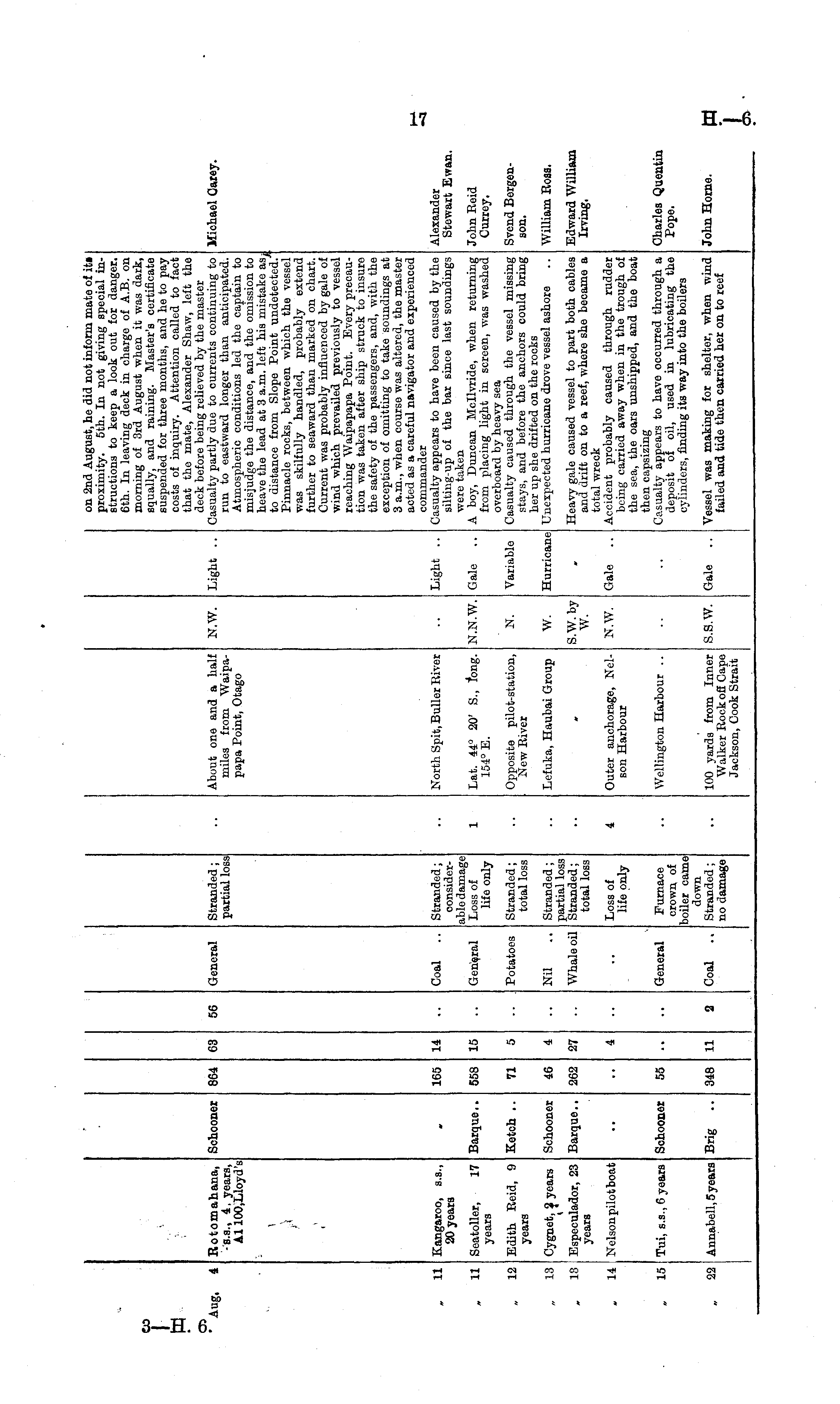 - ■ug, 4 Botomahana, B.a., 4 years, A.1lOO.Lloyd's A ■ Schooner 864 63 56 General Stranded; partial loss About one and a half railes from Waipapapa Point, Otago N.W. Light .. on 2nd August, he did not inform mate of it* proximity, 5th. In not giving special instructions to keep a look out for danger. 6th. In leaving deck in charge of A.B. on morning of 3rd August when it was dark, squally, and raining. Master's certificate suspended for three months, and he to pay costs of inquiry. Attention called to fact that the mate, Alexander Shaw, left the deck before being relieved by the master Casualty partly due to currents continuing to run to eastward longer than anticipated. Atmospheric conditions led the captain to misjudge the distance, and the omission to heave the lead at 3 a.m. left his mistake as to distance from Slope Point undetected. Pinnacle rocks, between which the vessel was skilfully handled, probably extend further to seaward than marked on chart. Current was probably influenced by gale of wind which prevailed previously to vessel reaching Waipapapa Point. Every precaution was taken after ship struck to insure the safety of the passengers, and, with the exception of omitting to take soundings at 3 a.m., when course was altered, the master acted as a careful navigator and experienced commander Casualty appears to have been caused by the silting-up of the bar since last soundings were taken A boy, Duncan Mcllvride, when returning from placing light in screen, was washed overboard by heavy sea Casualty caused through the vessel missing stays, and before the anchors could bring her up she drifted on the rocks Unexpected hurricane drove vessel ashore Michael Carey. H 11 Kangaroo, s.s., 20 years m 165 14 Coal Stranded; considerable damage Loss of life only North Spit, Buller River Light .. Alexander Stewart Ewan. M 11 Seatoller, 17 years Barque.. 558 15 General 1 Lat. 44° 20' S., fong. 154° E. N.N.W. Gale John Reid Currey, 12 Edith Reid, 9 years Ketch .. 71 Potatoes Stranded; total loss Opposite pilot-station, New Eiver N. Variable Svend Bergenson. ■• 13 Cygnet, 2 years Especulador, 23 years Schooner 46 4 Nil Stranded; partial loss Stranded; total loss Lefuka, Haubai Group W. Hurricane William Ross. JO 13 Barque.. 262 27 Whale oil S.W. by W. Heavy gale caused vessel to part both cables and drift on to a reef, where she became a total wreck Accident probably caused through rudder being carried away when in the trough of the sea, the oars unshipped, and the boat then capsizing Casualty appears to have occurred through a deposit of oil, used in lubricating the cylinders, finding its way into the boilers Edward William Irving, t» 14 Nelson pilot boat Loss of life only 4 Outer anchorage, Nelson Harbour N.W. Gale .. tf 15 Tui, s.s.,6y6ars Schooner General Furnace crown of boiler came down Stranded ; no damage Wellington Harbour .. Charles Quentia Pope. Annabell,5years Brig .. Coal S.S.W. Gale .. Vessel was making for shelter, when wind failed and tide then carried her on to reef John Home. 22 348 11 100 yards from Inner Walker Rock off Cape Jackson, Cook Strait