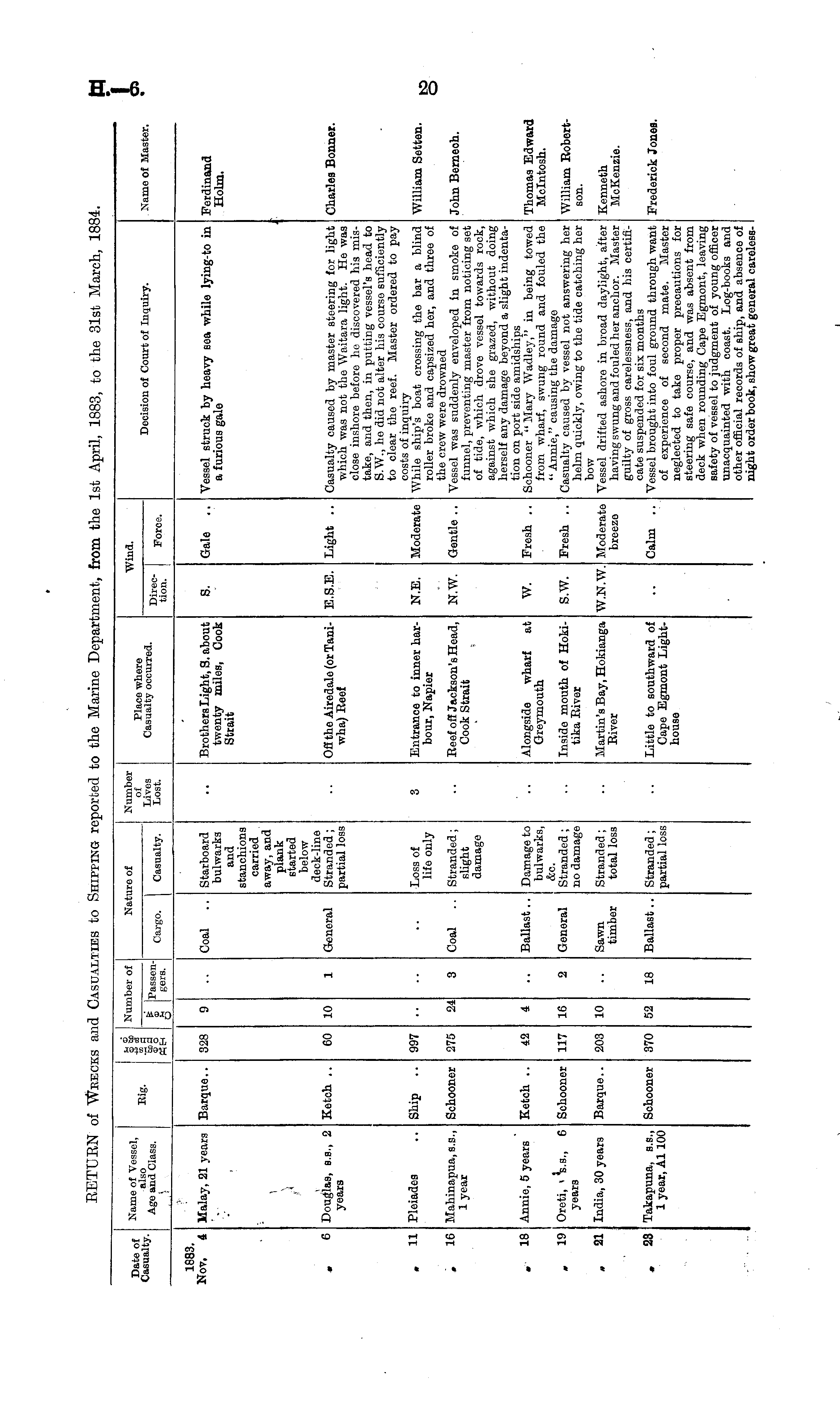 RETURN of Wrecks and Casualties to Shipping reported to the Marine Department, from the 1st April, 1883, to the 31st March, 1884.