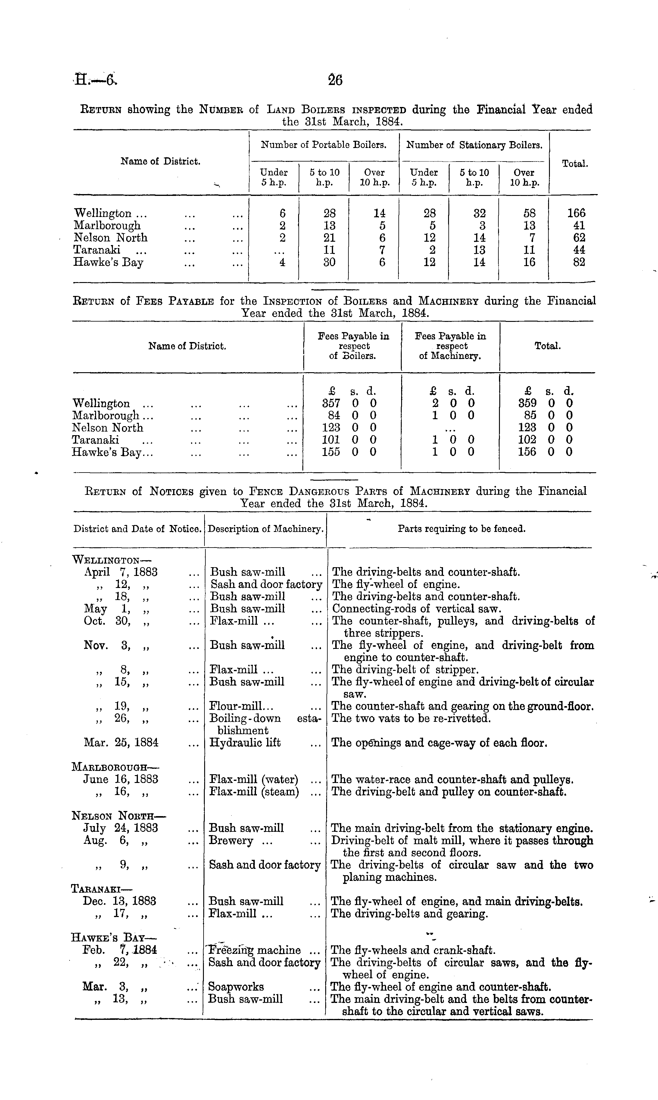 Name of District. Pees Payable in respect of Boilers. Fees Payable in respect of Machinery. Total. Wellington ... larlborough ... felson North 'aranaki [awke's Bay... & 357 84 123 101 155 s. a. 0 0 0 0 0 0 0 0 0 0 £ s. a. 2 0 0 10 0 £ s. d. 359 0 0 85 0 0 123 0 0 102 0 0 156 0 0 10 0 10 0