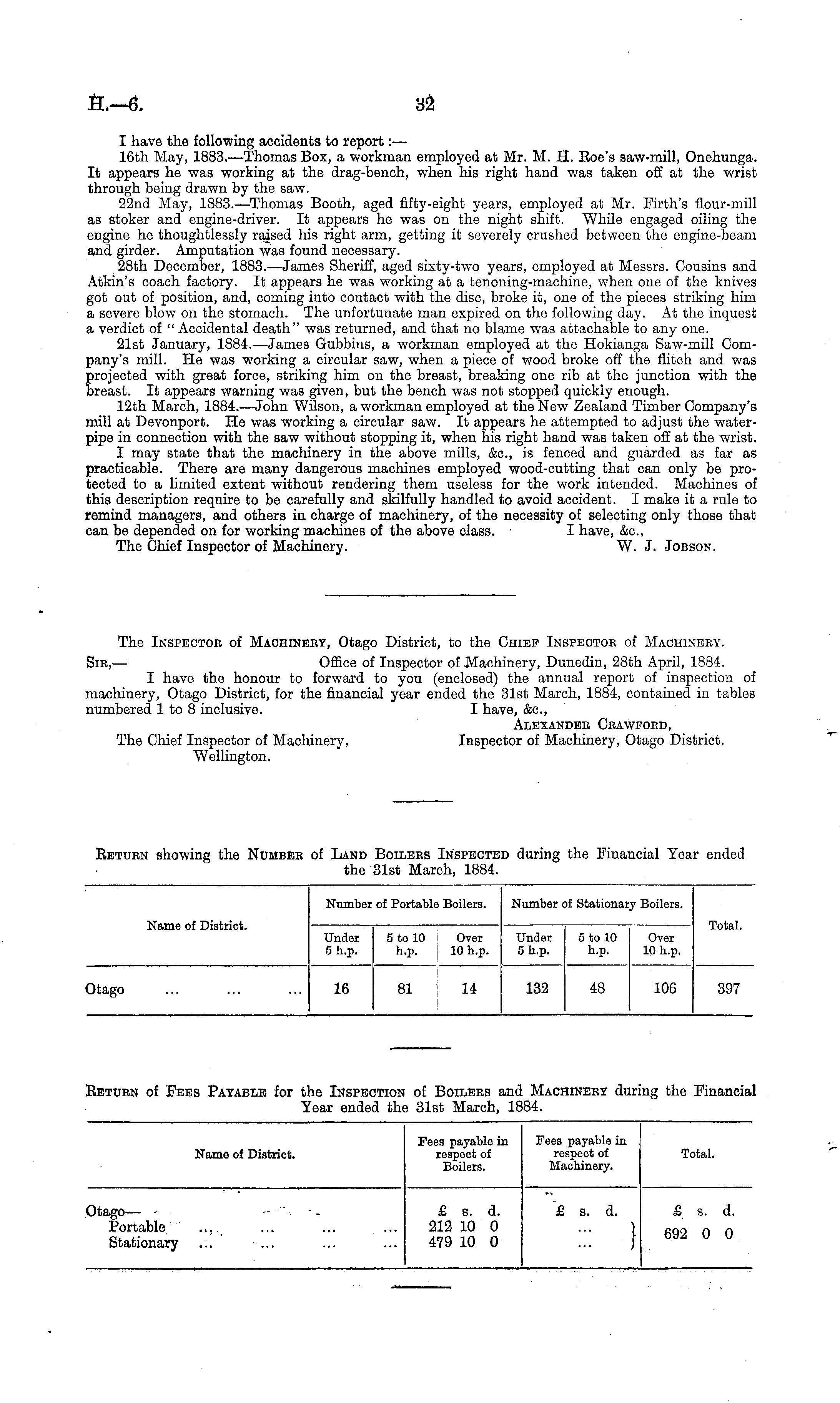 The Inspector of Machinery, Otago District, to the Chief Inspector of Machinery. Sir, — Office of Inspector of Machinery, Dunedin, 28th April, 1884. I have the honour to forward to you (enclosed) the annual report of inspection of machinery, Otago District, for the financial year ended the 31st March, 1884, contained in tables numbered 1 to 8 inclusive. I have, &c, Alexander Crawford, The Chief Inspector of Machinery, Inspector of Machinery, Otago District. Wellington.