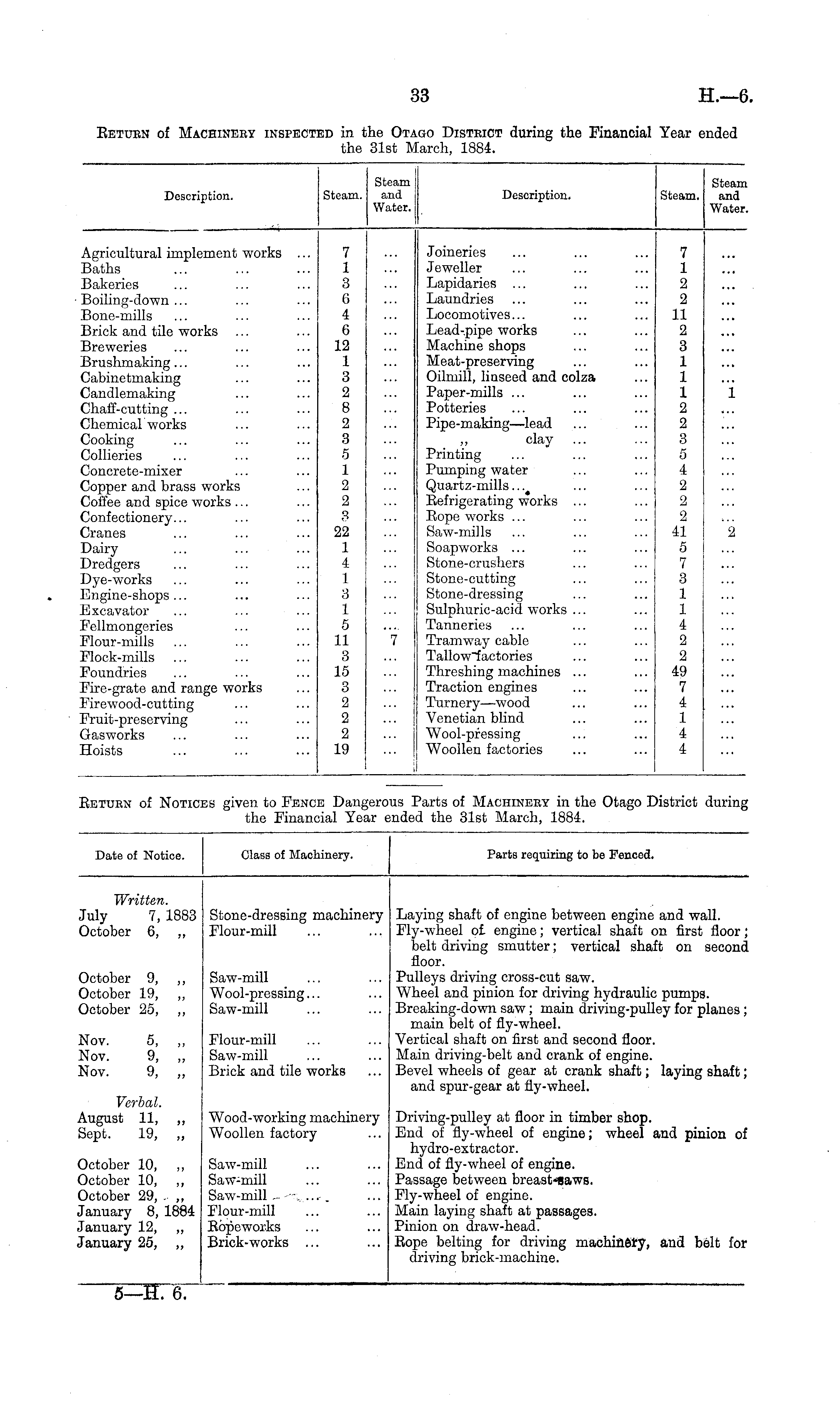 Return of Notices given to Fence Dangerous Parts of Machinery in the Otago District during the Financial Year ended the 31st March, 1884.