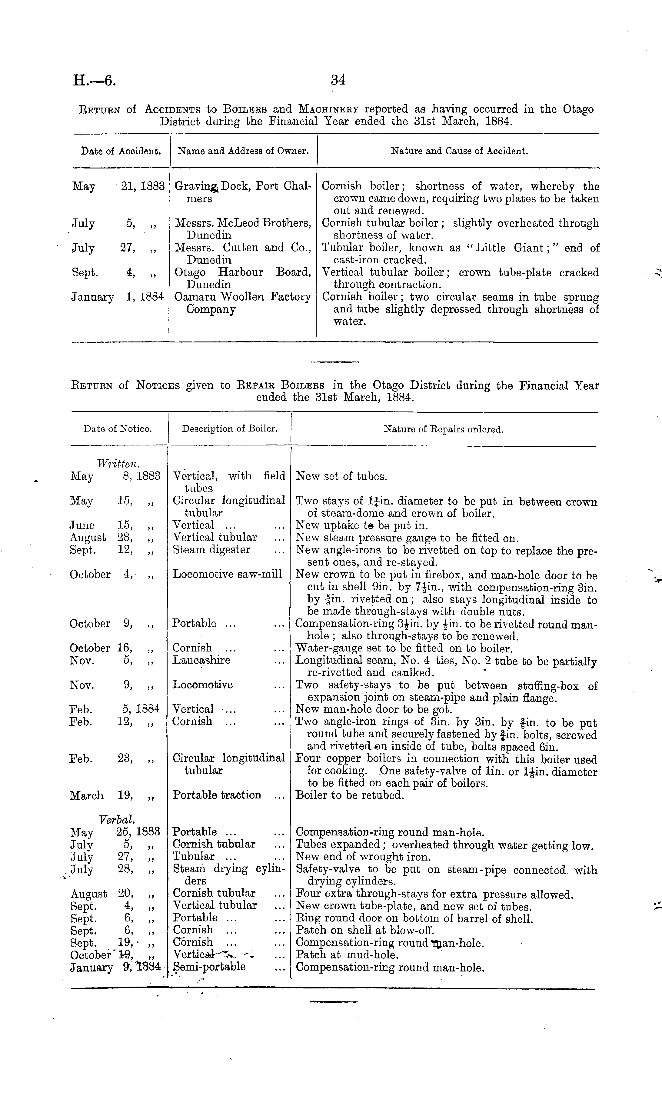 Return of Accidents to Boilers and Machinery reported as having occurred in the Otago District during the Financial Year ended the 31st March, 1884.